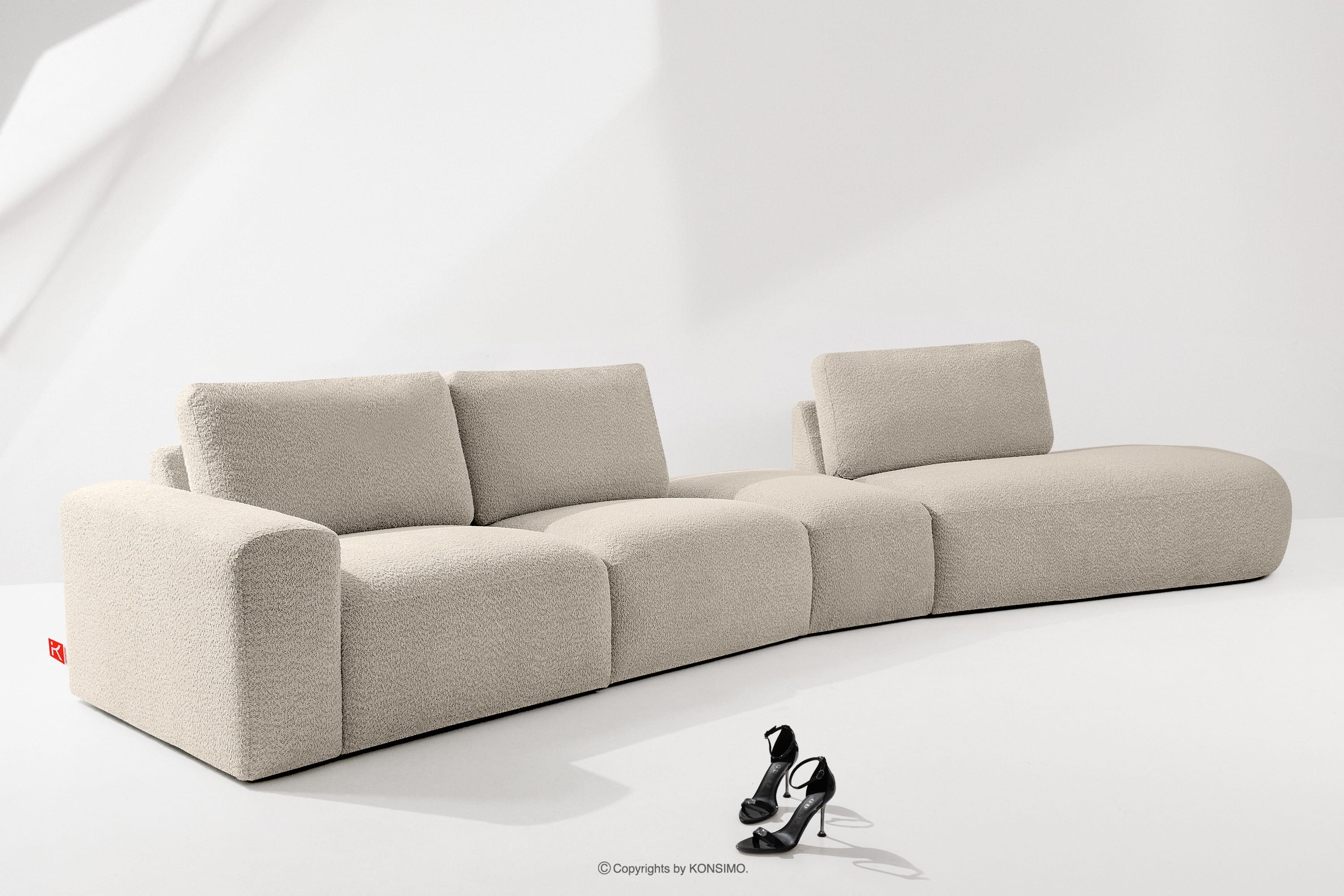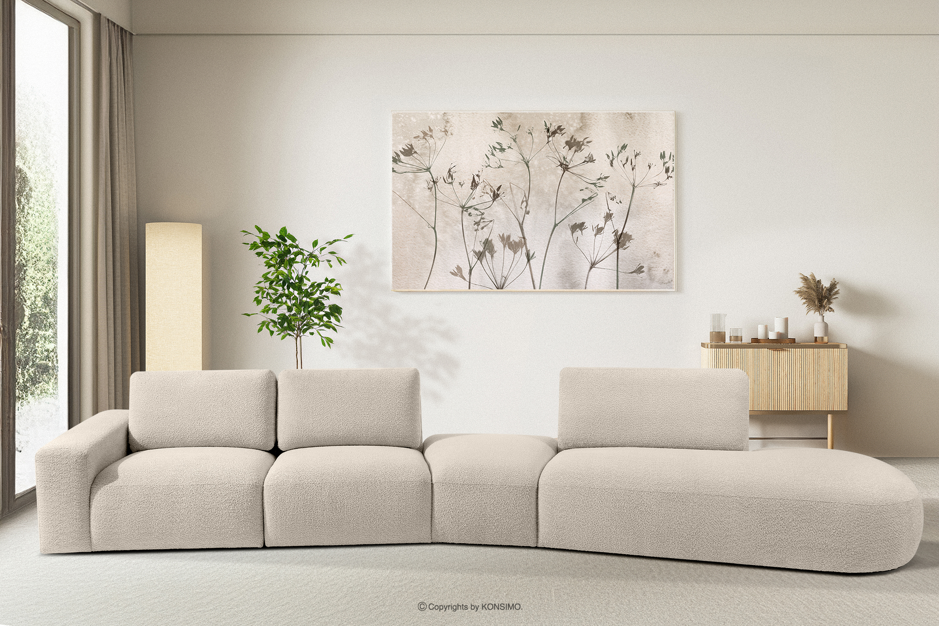 Organická rohová pohovka do obývacej izby z látky boucle svetlej béžovej farby je synonymom moderného pohodlia a elegancie. Je vyrobená z najkvalitnejších materiálov a jej modulárnosť zaručuje slobodu používania v závislosti od vašich potrieb. Rohová pohovka je čalúnená látkou boucle, ktorá jej dodáva luxusný vzhľad a je známa aj svojou odolnosťou a príjemnou štruktúrou.