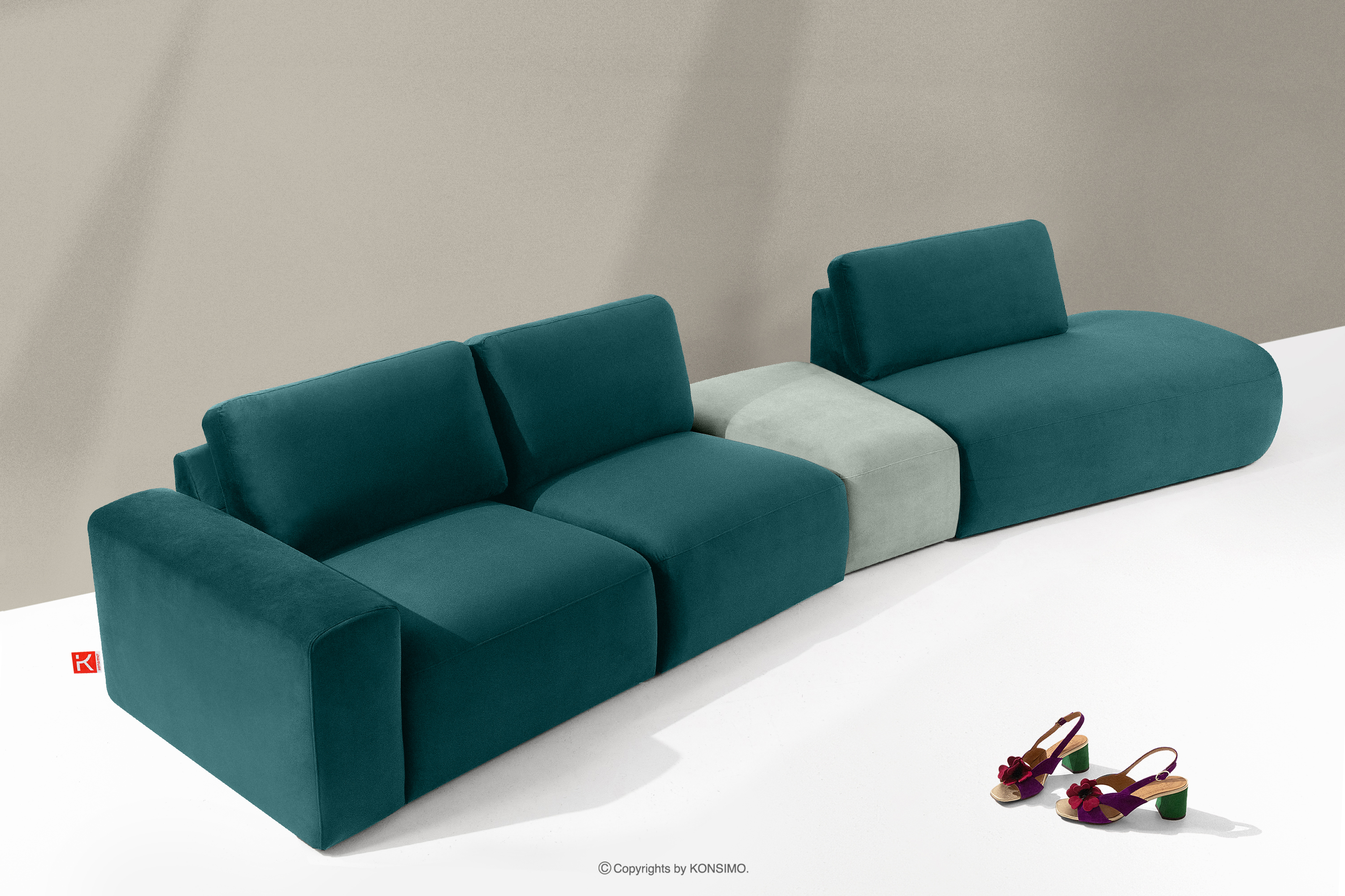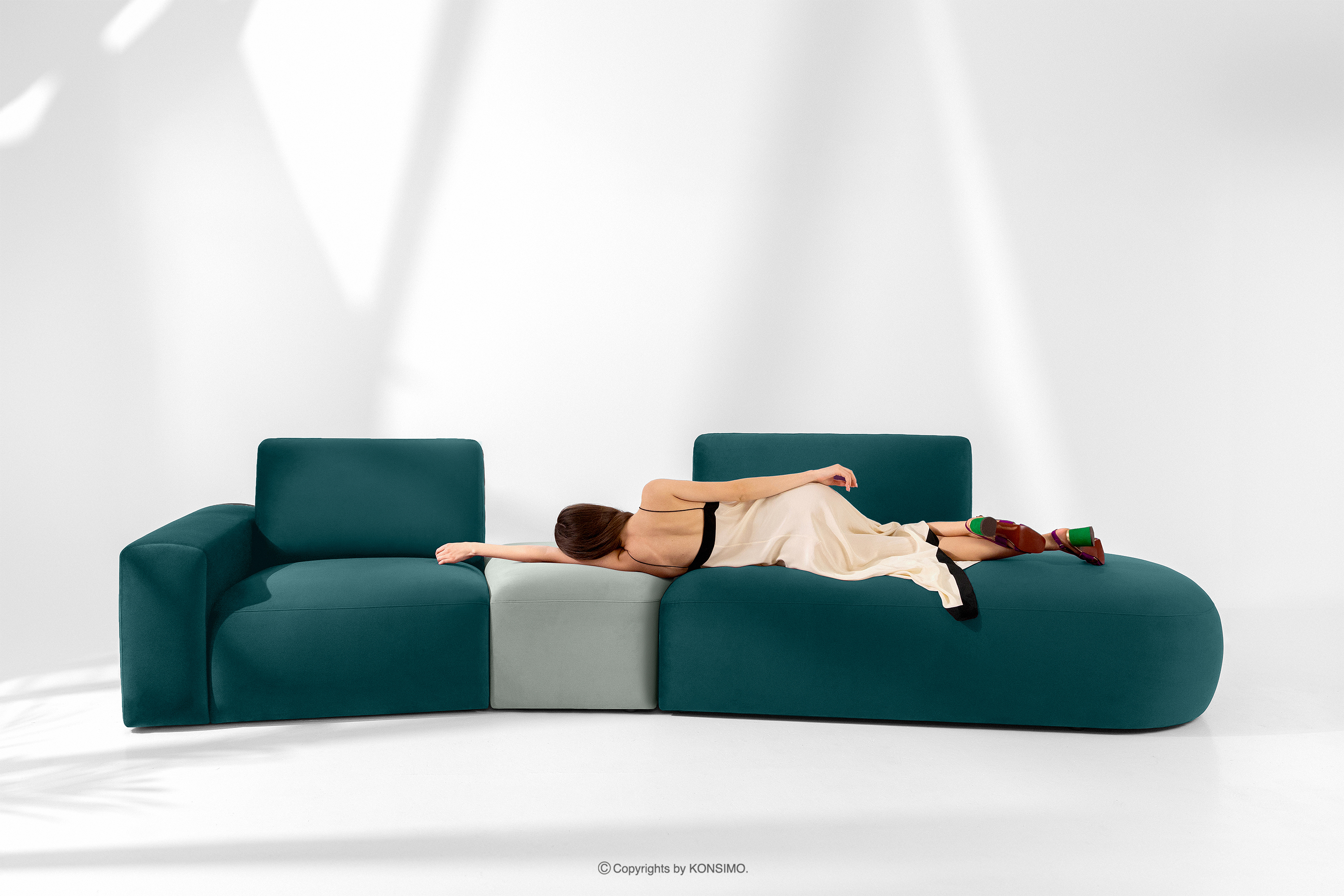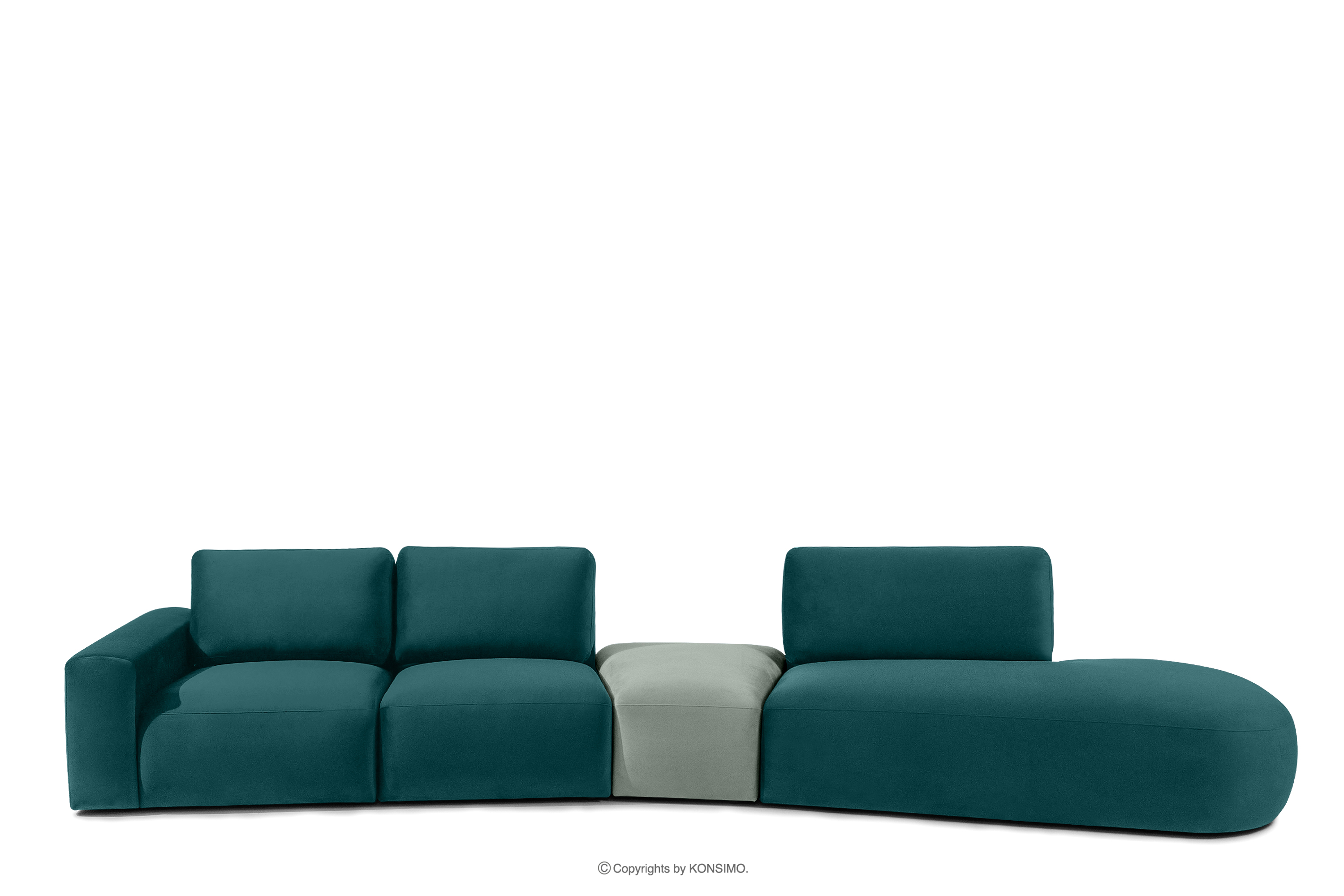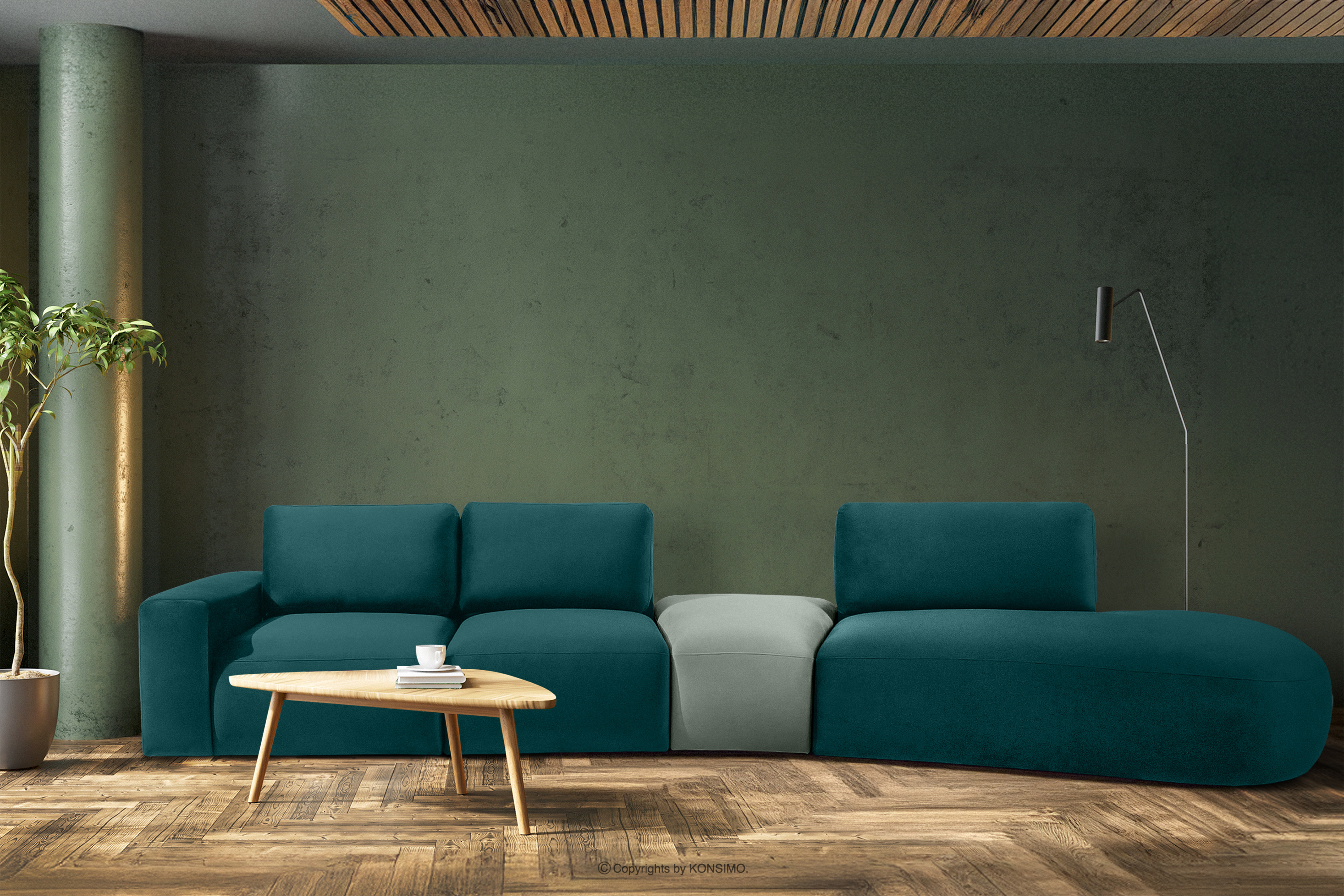 Organická rohová sedacia súprava do obývačky v morskej/mätovej velúrovej látke vpravo je synonymom moderného pohodlia a elegancie. Je vyrobená z najkvalitnejších materiálov a vďaka modulárnosti zaručuje slobodu používania v závislosti od vašich potrieb. Rohová pohovka je čalúnená velúrovou látkou, ktorá jej dodáva luxusný vzhľad a zároveň sa ľahko udržiava v čistote.