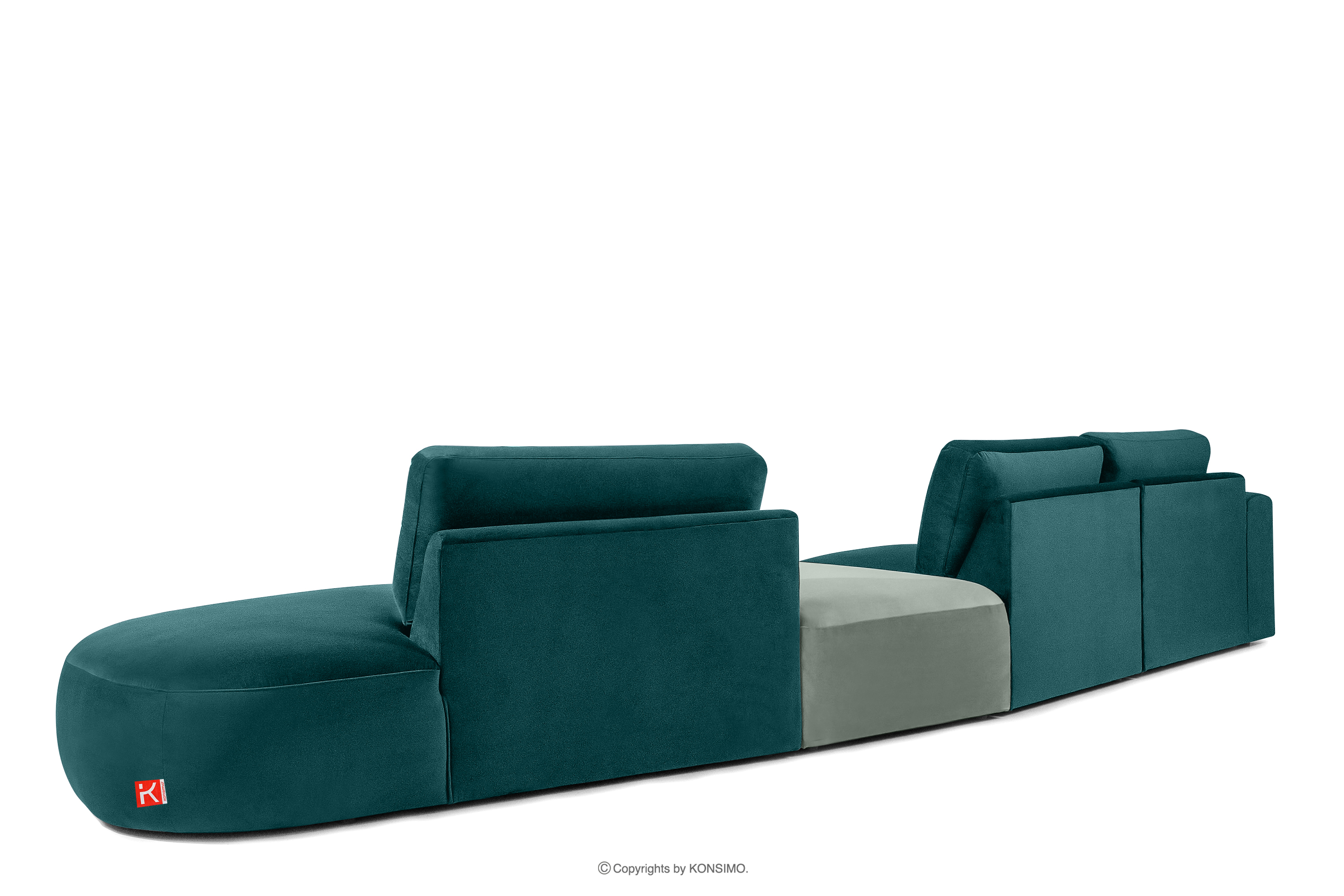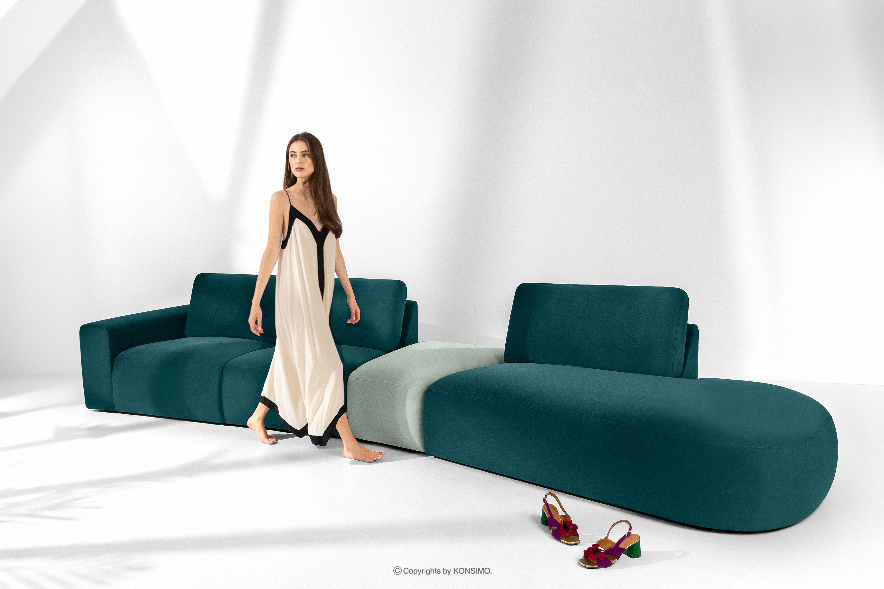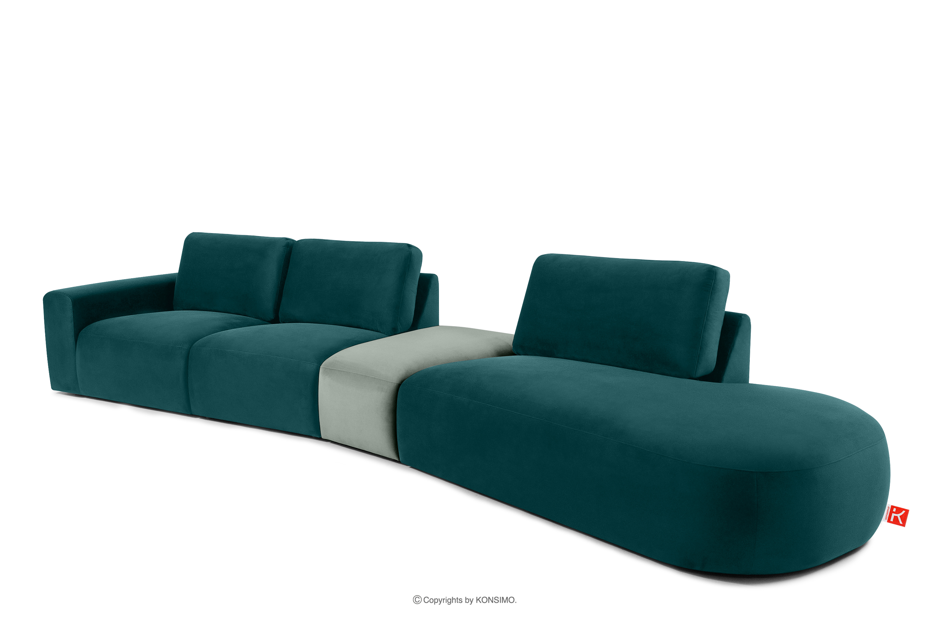 Organická rohová sedacia súprava do obývačky v morskej/mätovej velúrovej látke vpravo je synonymom moderného pohodlia a elegancie. Je vyrobená z najkvalitnejších materiálov a vďaka modulárnosti zaručuje slobodu používania v závislosti od vašich potrieb. Rohová pohovka je čalúnená velúrovou látkou, ktorá jej dodáva luxusný vzhľad a zároveň sa ľahko udržiava v čistote.