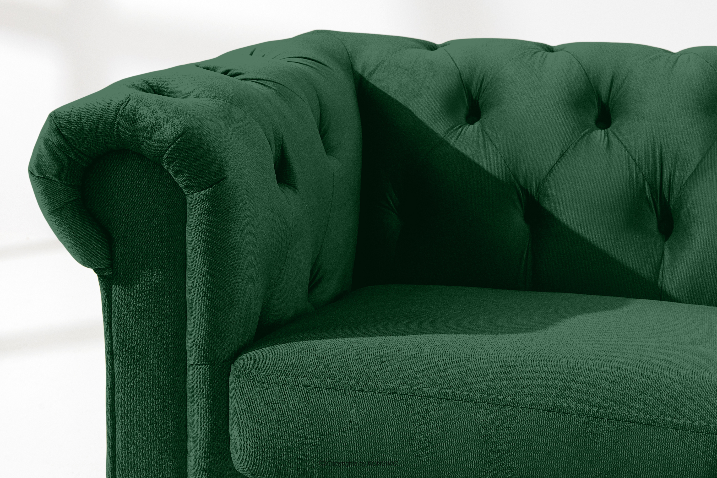 Klasická trojmiestna pohovka chesterfield v tmavozelenom velúre je kombináciou klasickej elegancie a moderného pohodlia, ktoré dokonale ladia s estetikou luxusných interiérov. Ich výrazný dizajn chesterfield, sa vyznačuje mimoriadnym zmyslom pre štýl a funkčnosť. Prešívanie, ktoré zdobí operadlá, nielenže zdôrazňuje elegantný vzhľad nábytku, ale má aj dôležitú praktickú funkciu - zabraňuje rozťahovaniu látky a zabezpečuje jej dlhodobú odolnosť.