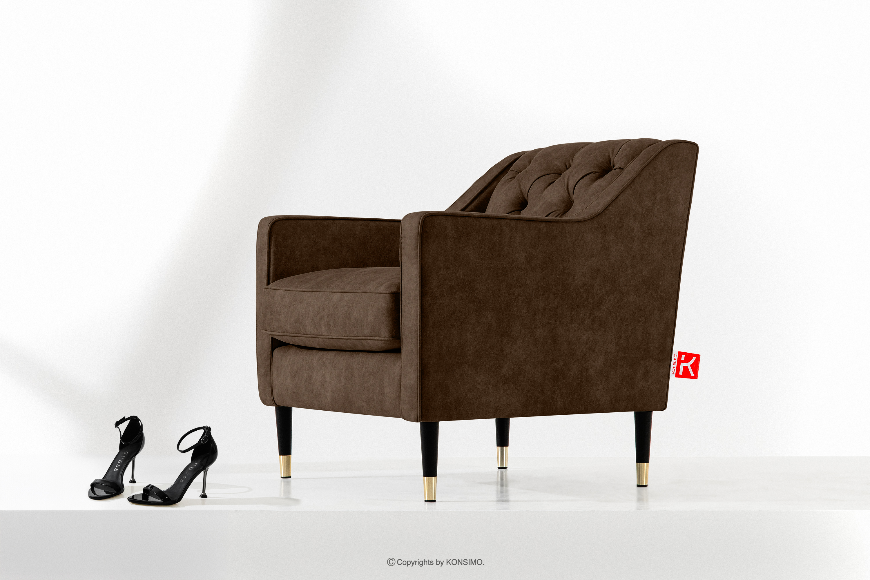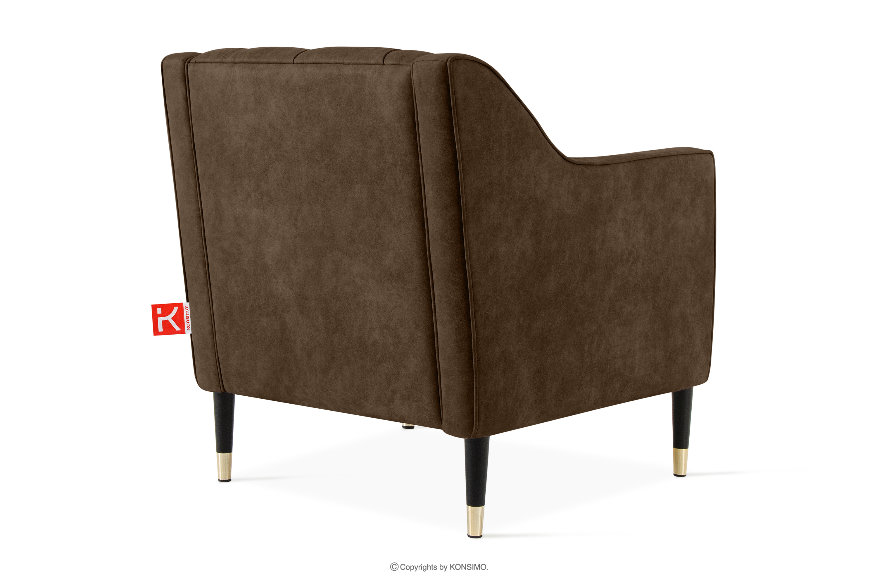 Elegantné štýlové kreslo v tmavohnedej ekokoži je jedinečný kus nábytku, ktorý dokonale ladí so štýlom glamour. Jedinečné prešívanie mu dodáva elegantný vzhľad a odlišuje ho od ostatného nábytku. Vďaka čalúneniu z ekokože je kreslo krásne a zároveň sa ľahko udržiava v čistote, čo z neho robí praktické riešenie na každodenné používanie.