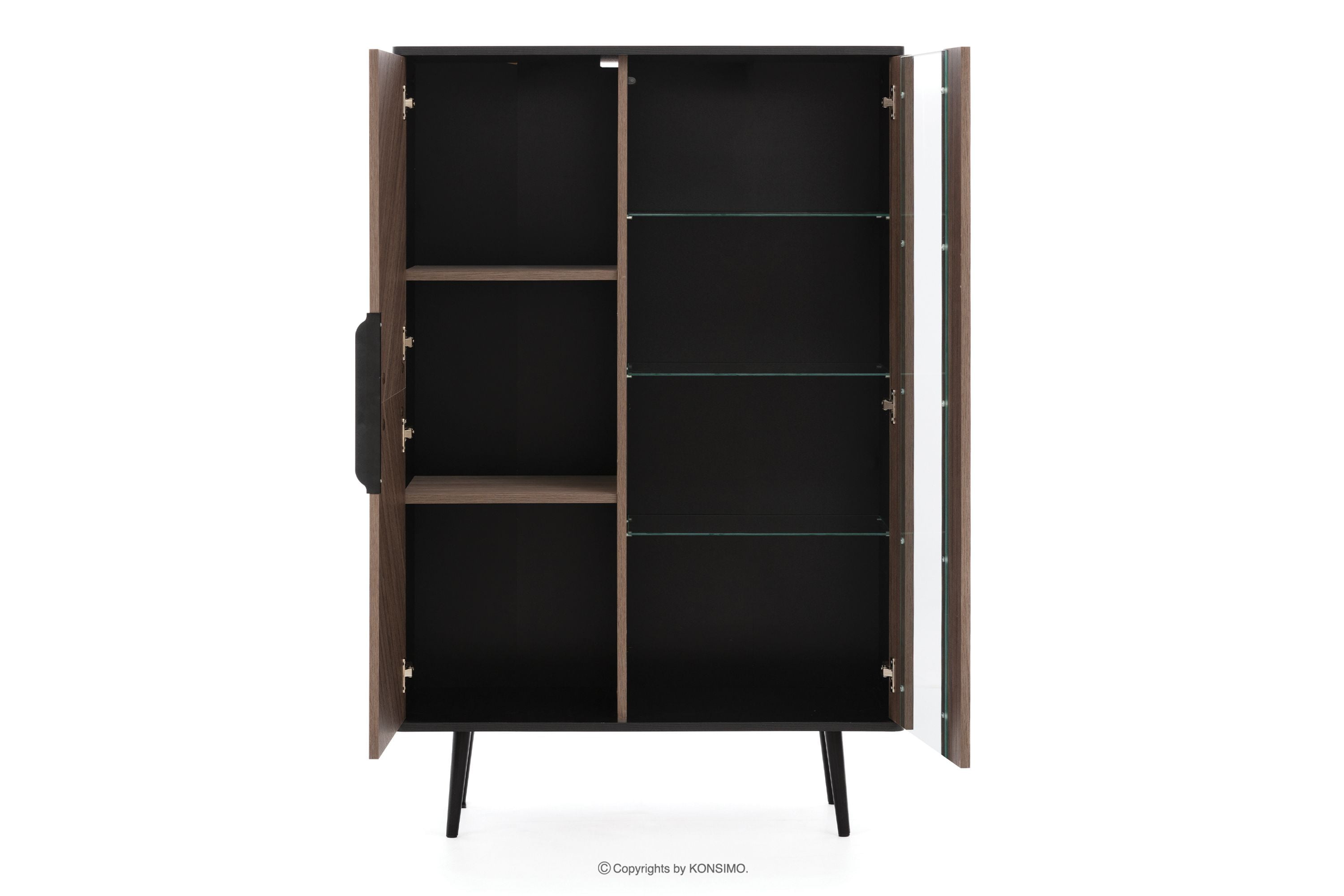 Použitie kovových úchytiek v čiernej farbe dodáva vitríne moderný charakter a eleganciu, zatiaľ čo 20 cm vysoké nohy, tiež kovové a čierne, dodávajú nábytku ľahkosť a uľahčujú čistenie spodnej časti.