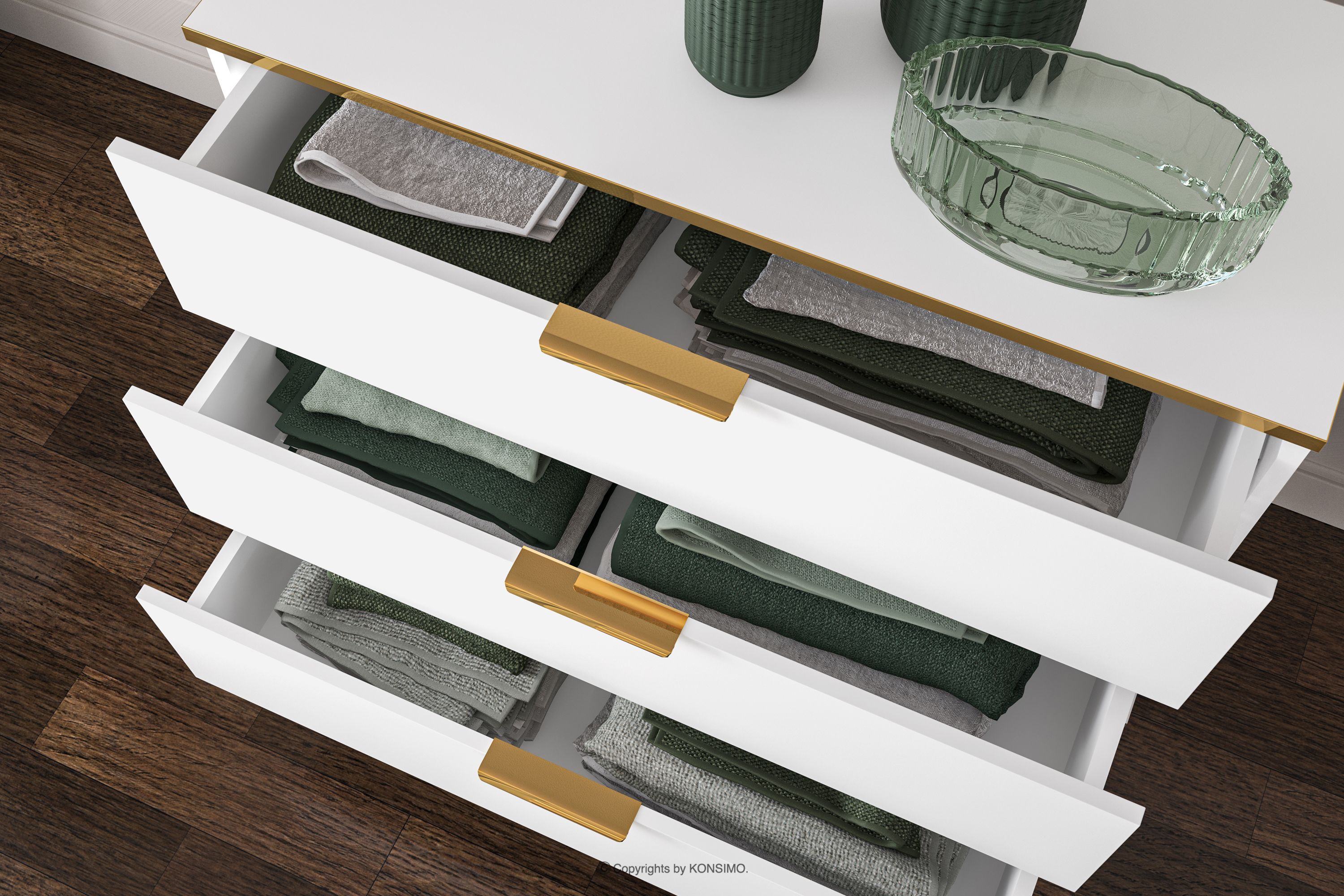 Zlaté úchytky a nožičky dokonale dopĺňajú biely korpus nábytku a dodávajú mu elegantný a moderný nádych. Sú to jemné, ale výrazné detaily, ktoré dodávajú jedinečný charakter, vďaka čomu sa dokonale hodia do interiérov v glamour štýle a elegantných aranžmánov. Zadný panel vyrobený z HDF v bielej farbe je praktickým a estetickým prvkom, ktorý dopĺňa celok a zároveň zabezpečuje stabilitu a odolnosť konštrukcie. Hrany boli starostlivo upravené ABS, čo nielen zvyšuje odolnosť voči mechanickému poškodeniu, ale aj zdôrazňuje elegantný charakter výrobkov.