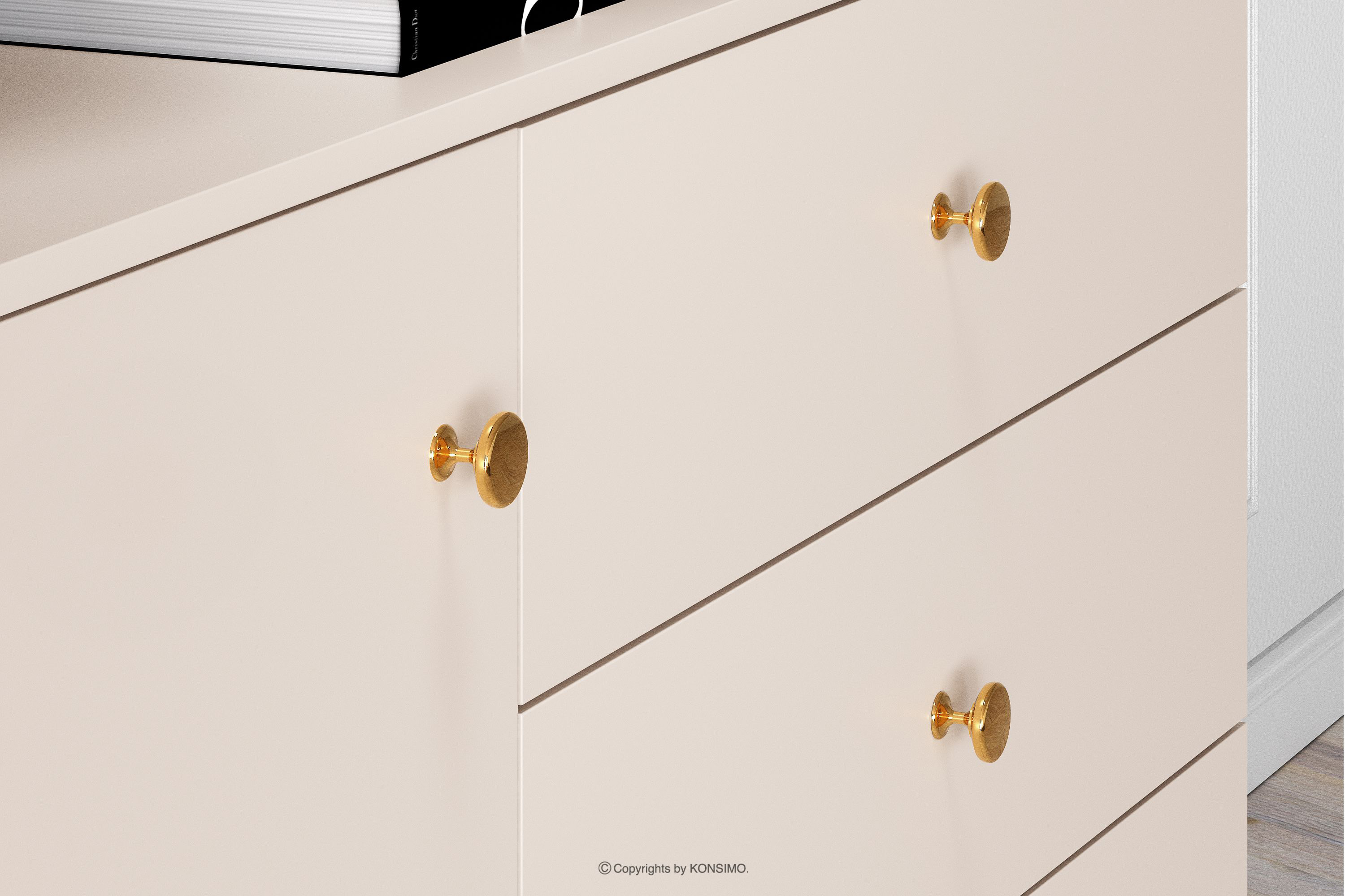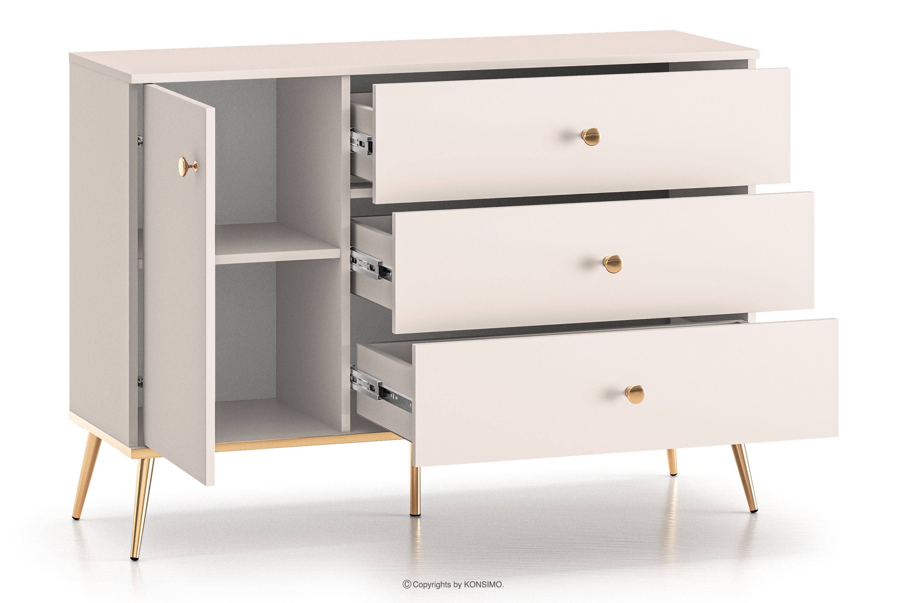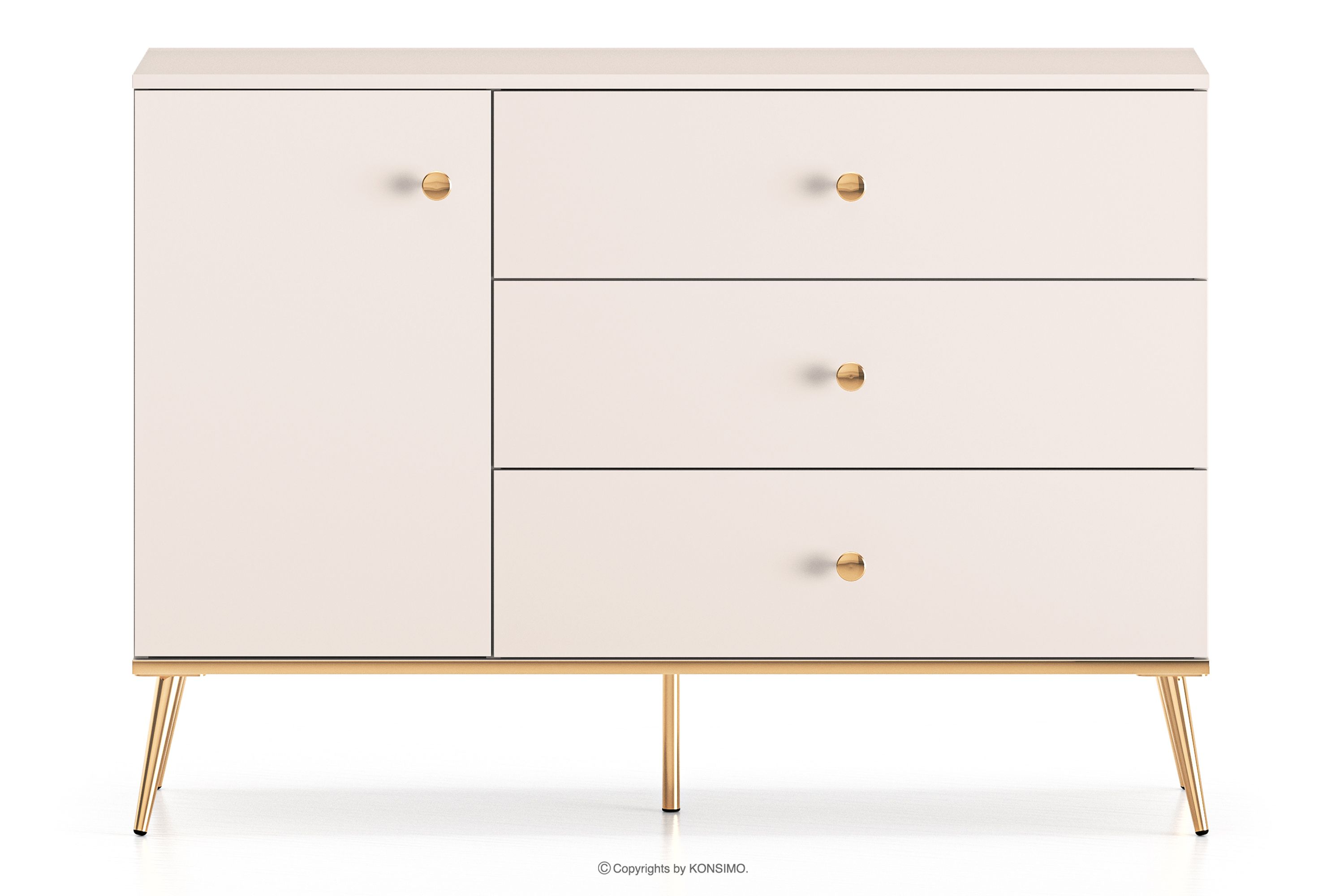 Elegantná krémová komoda je určená pre ľudí, ktorí chcú do svojho interiéru vniesť prvky triedy a luxusu. Kovové úchyty v zlatej farbe a zlaté nožičky sú detaily, ktoré podčiarkujú eleganciu nábytku a dodávajú mu luxusný dojem. Laminovaná doska je známa svojou odolnosťou voči mechanickému poškodeniu, poškriabaniu a vlhkosti, vďaka čomu si nábytok zachováva svoj pôvodný vzhľad po mnoho rokov.