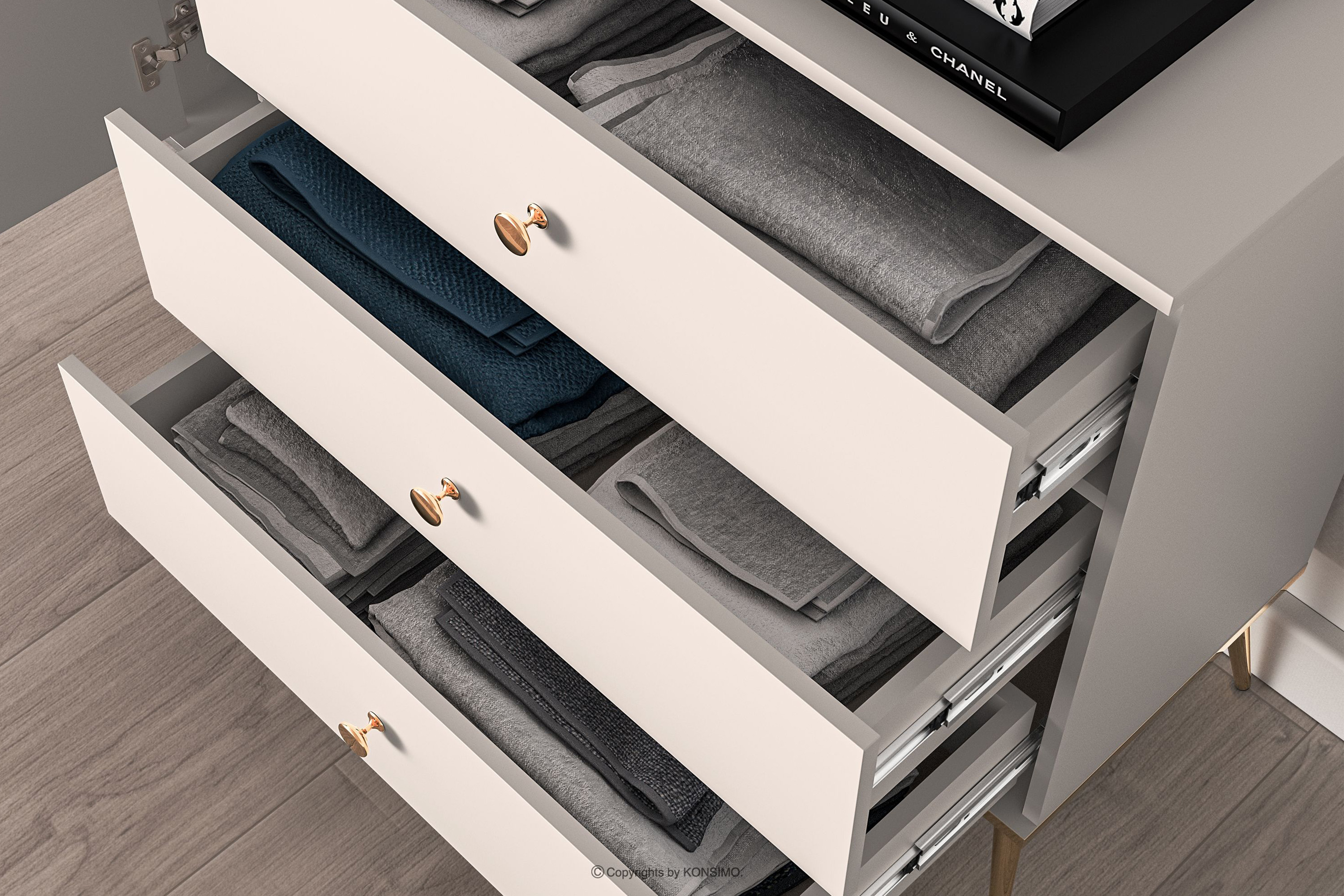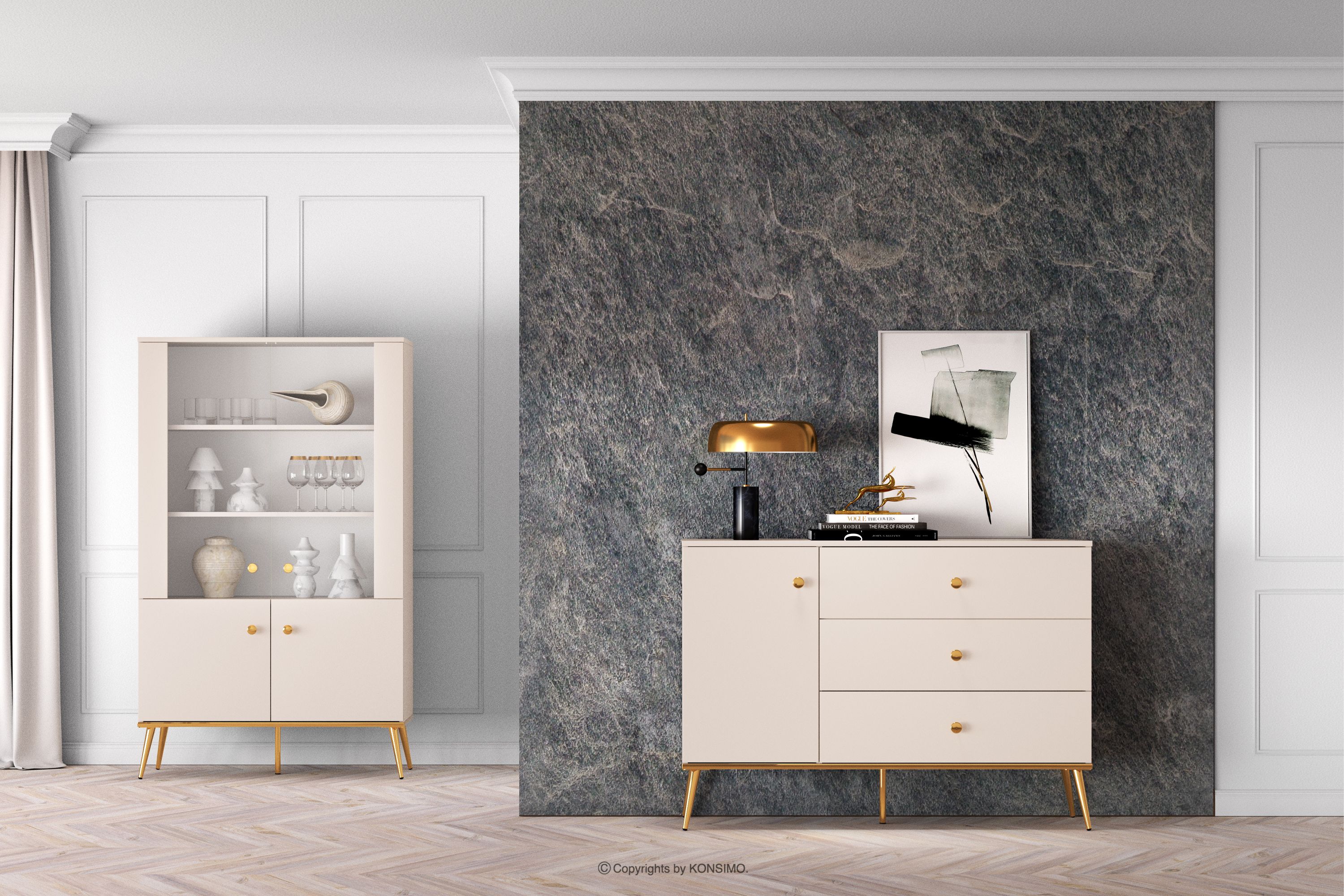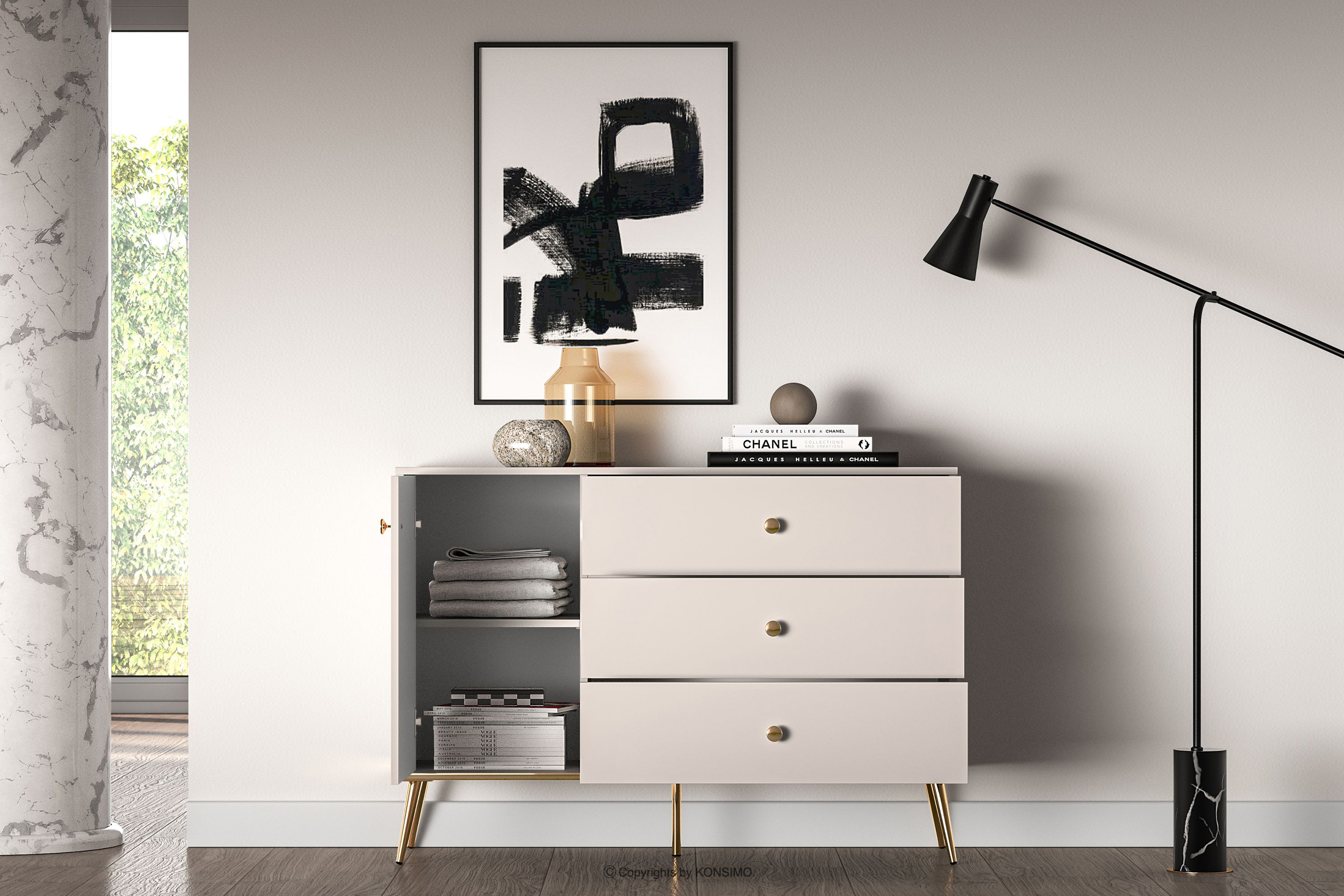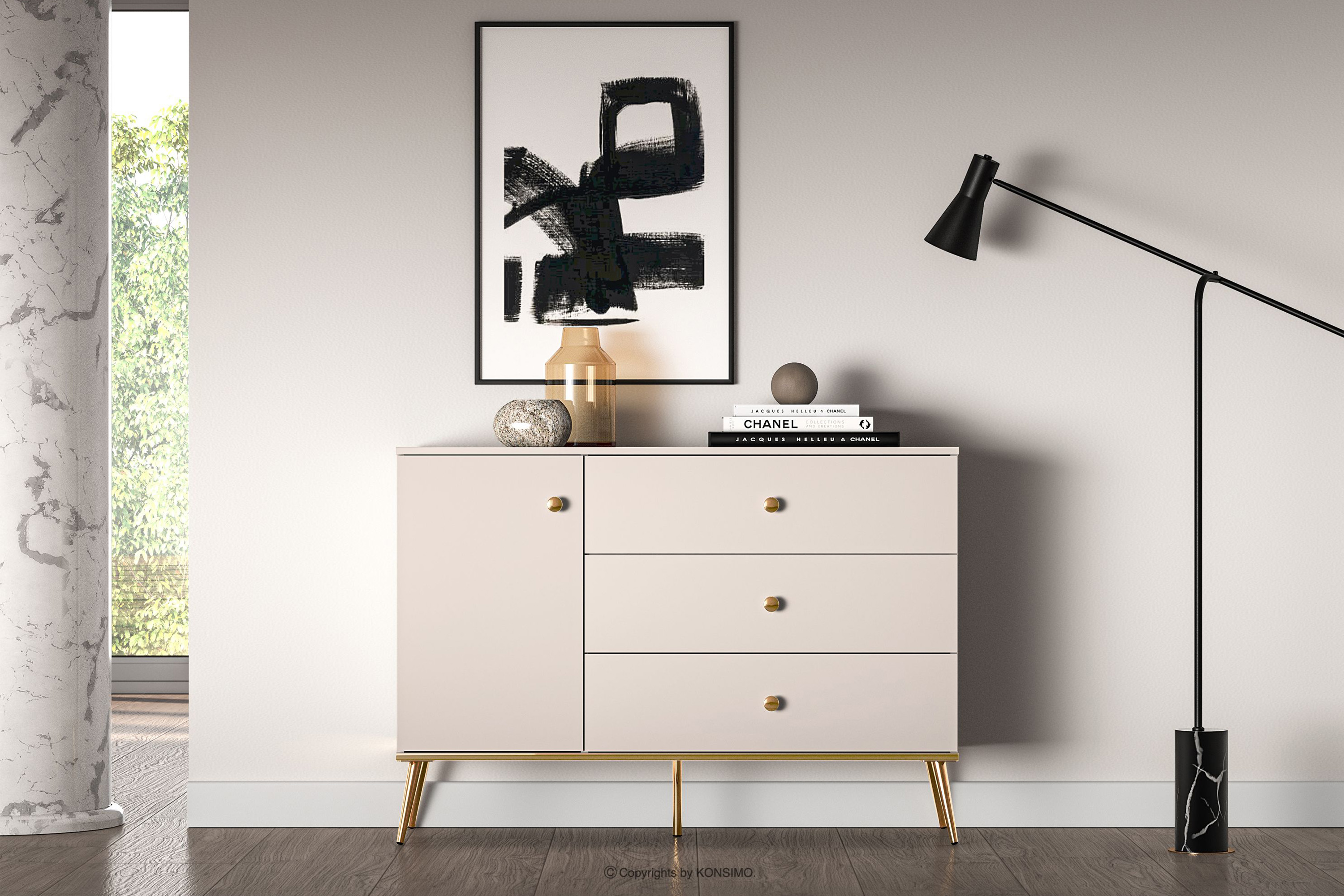 Elegantná krémová komoda je určená pre ľudí, ktorí chcú do svojho interiéru vniesť prvky triedy a luxusu. Kovové úchyty v zlatej farbe a zlaté nožičky sú detaily, ktoré podčiarkujú eleganciu nábytku a dodávajú mu luxusný dojem. Laminovaná doska je známa svojou odolnosťou voči mechanickému poškodeniu, poškriabaniu a vlhkosti, vďaka čomu si nábytok zachováva svoj pôvodný vzhľad po mnoho rokov.