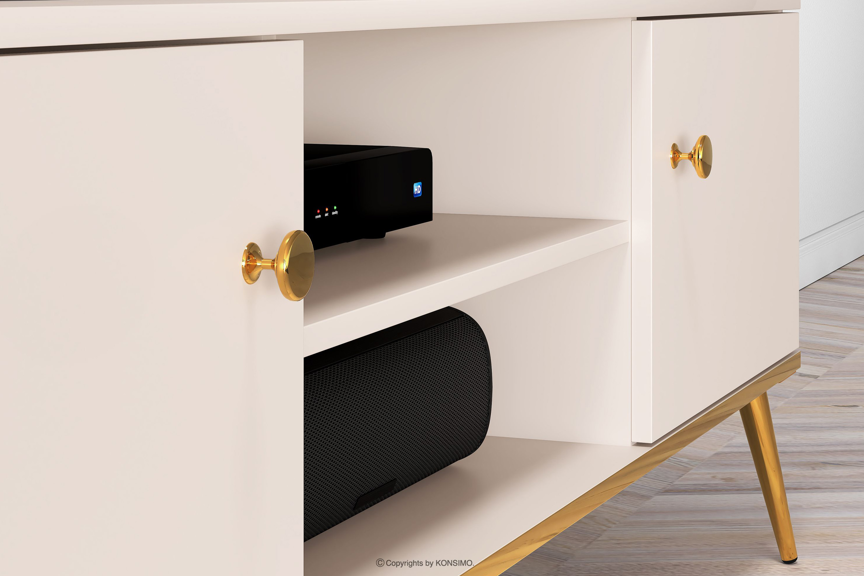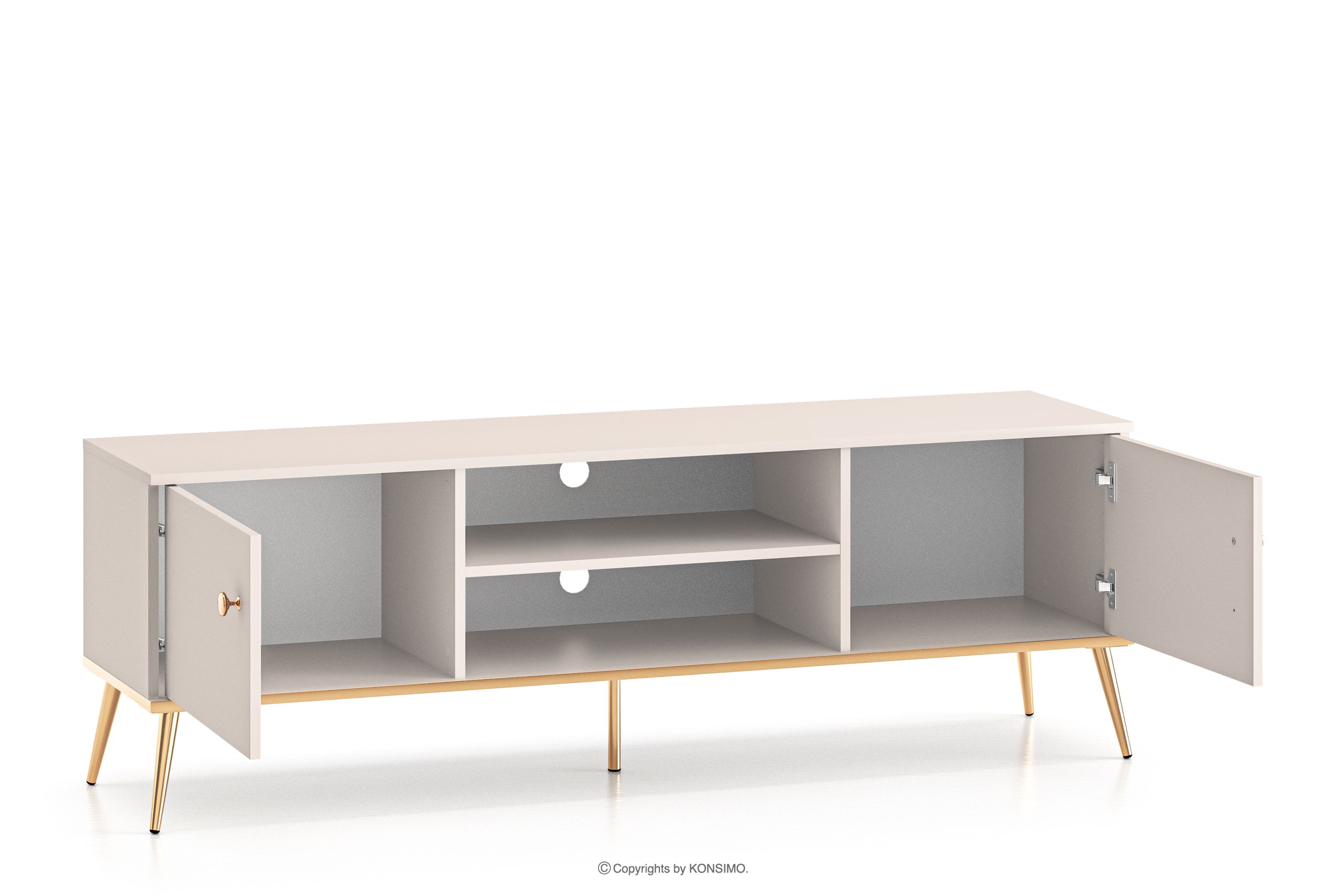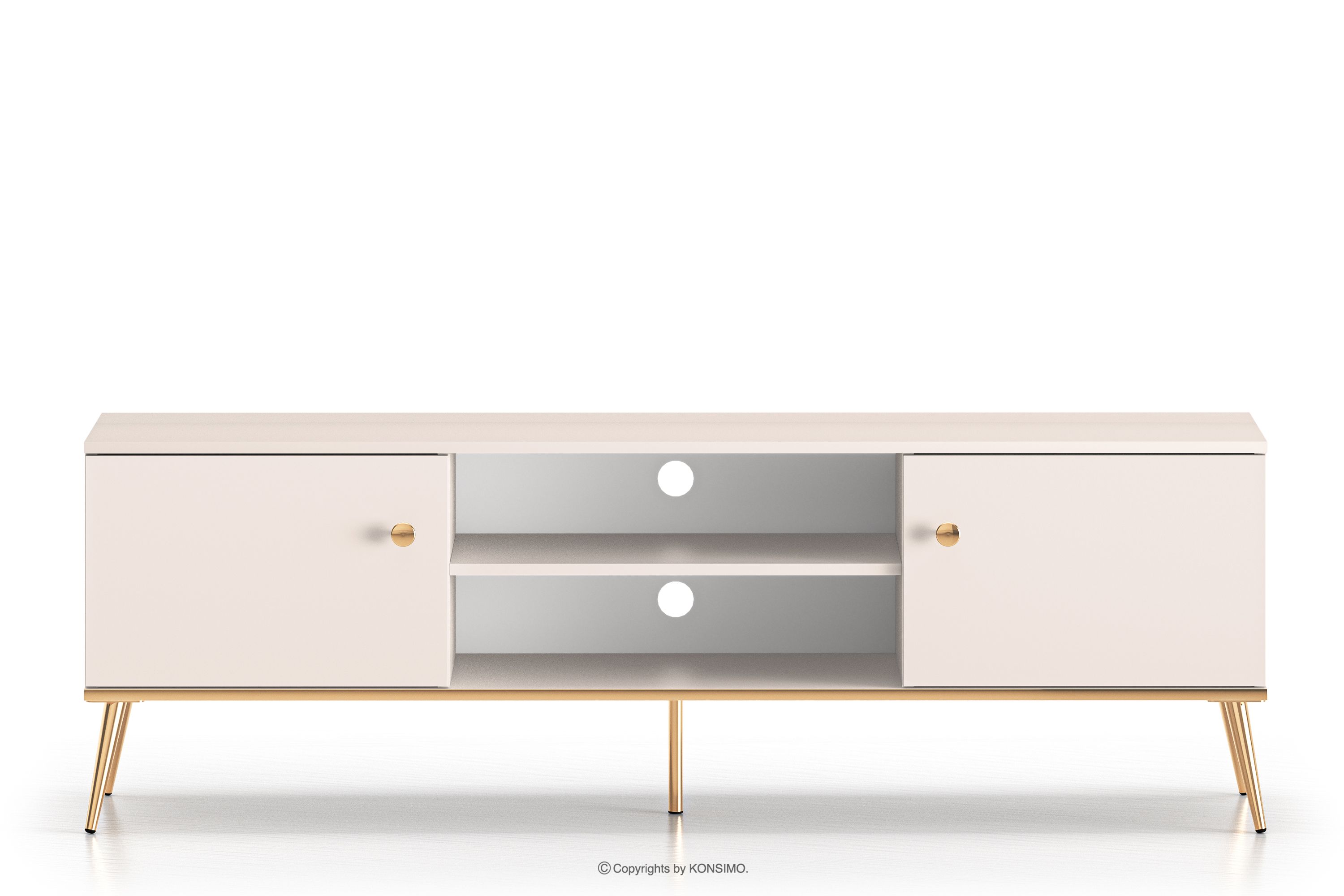Elegantná krémová skrinka RTV je určená pre ľudí, ktorí chcú do svojho interiéru vniesť prvky triedy a luxusu. Kovové úchytky v zlatej farbe a zlaté nožičky sú detaily, ktoré podčiarkujú eleganciu nábytku a dodávajú mu luxusný charakter. Laminovaná doska je známa svojou odolnosťou voči mechanickému poškodeniu, poškriabaniu a vlhkosti, vďaka čomu si nábytok zachováva svoj pôvodný vzhľad po mnoho rokov.