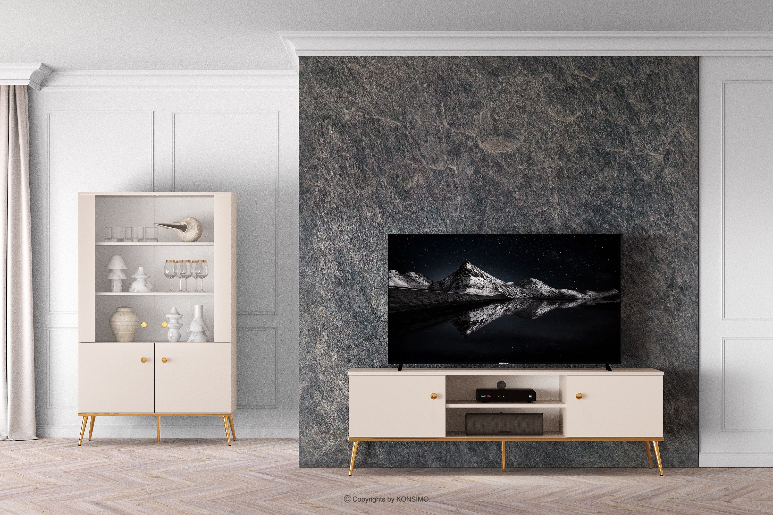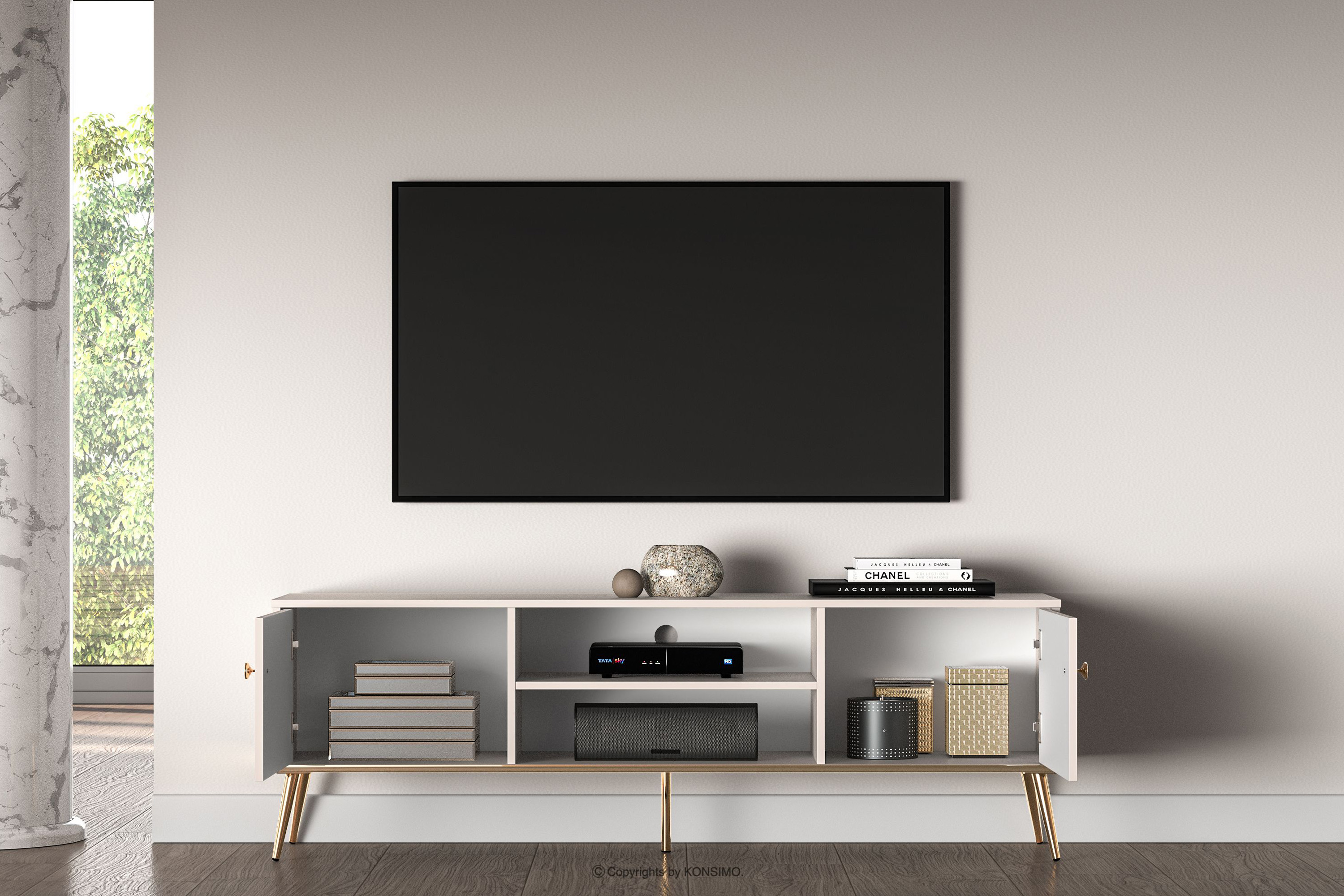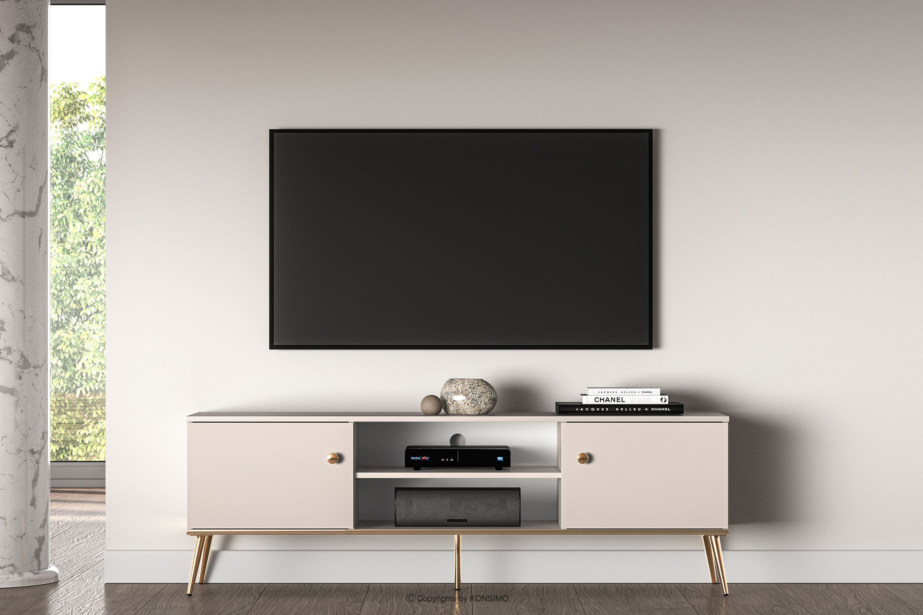 Elegantná krémová skrinka RTV je určená pre ľudí, ktorí chcú do svojho interiéru vniesť prvky triedy a luxusu. Kovové úchytky v zlatej farbe a zlaté nožičky sú detaily, ktoré podčiarkujú eleganciu nábytku a dodávajú mu luxusný charakter. Laminovaná doska je známa svojou odolnosťou voči mechanickému poškodeniu, poškriabaniu a vlhkosti, vďaka čomu si nábytok zachováva svoj pôvodný vzhľad po mnoho rokov.
