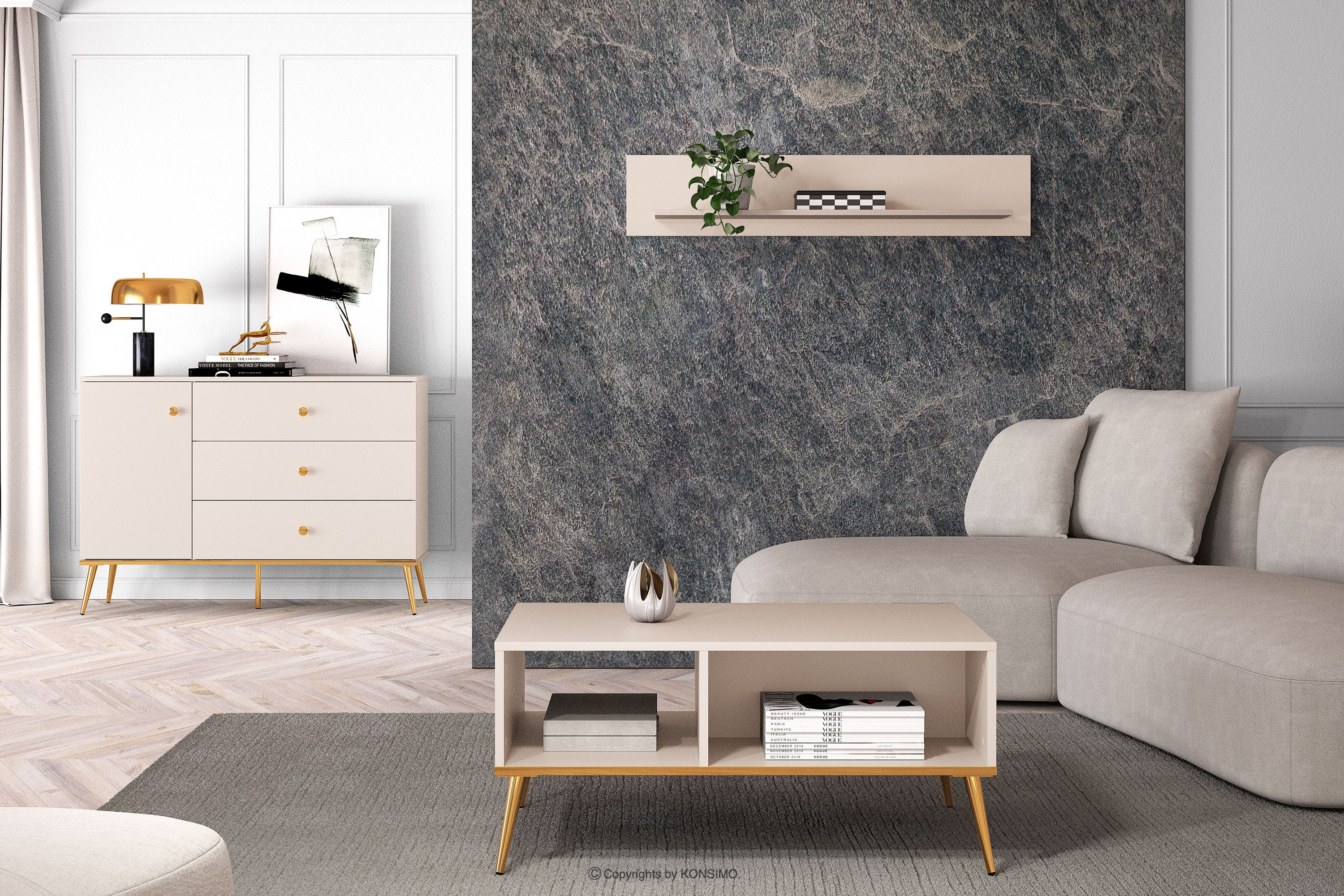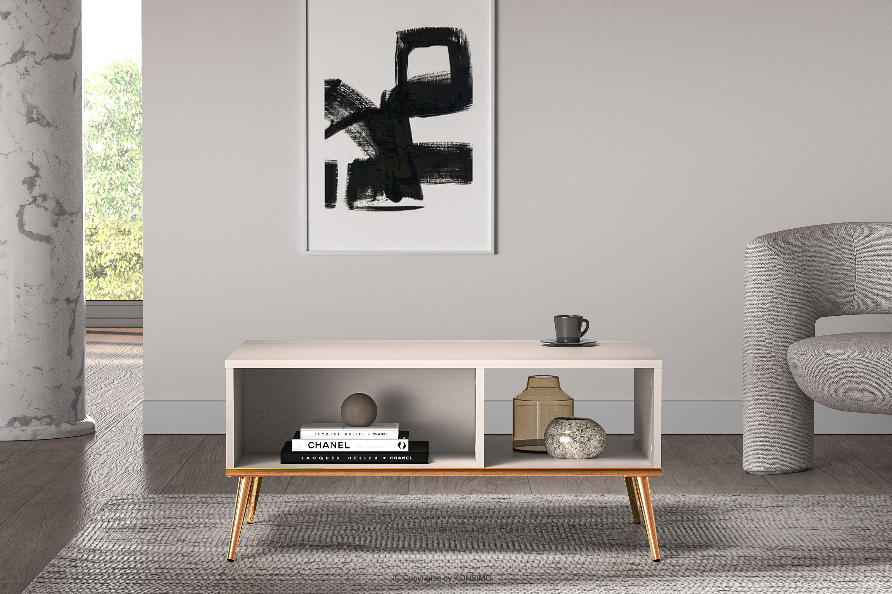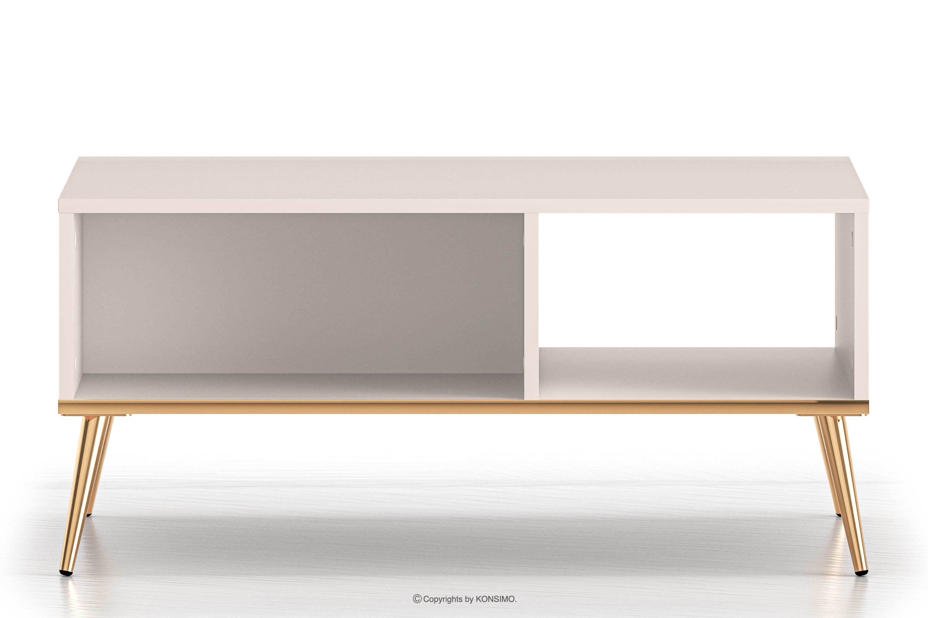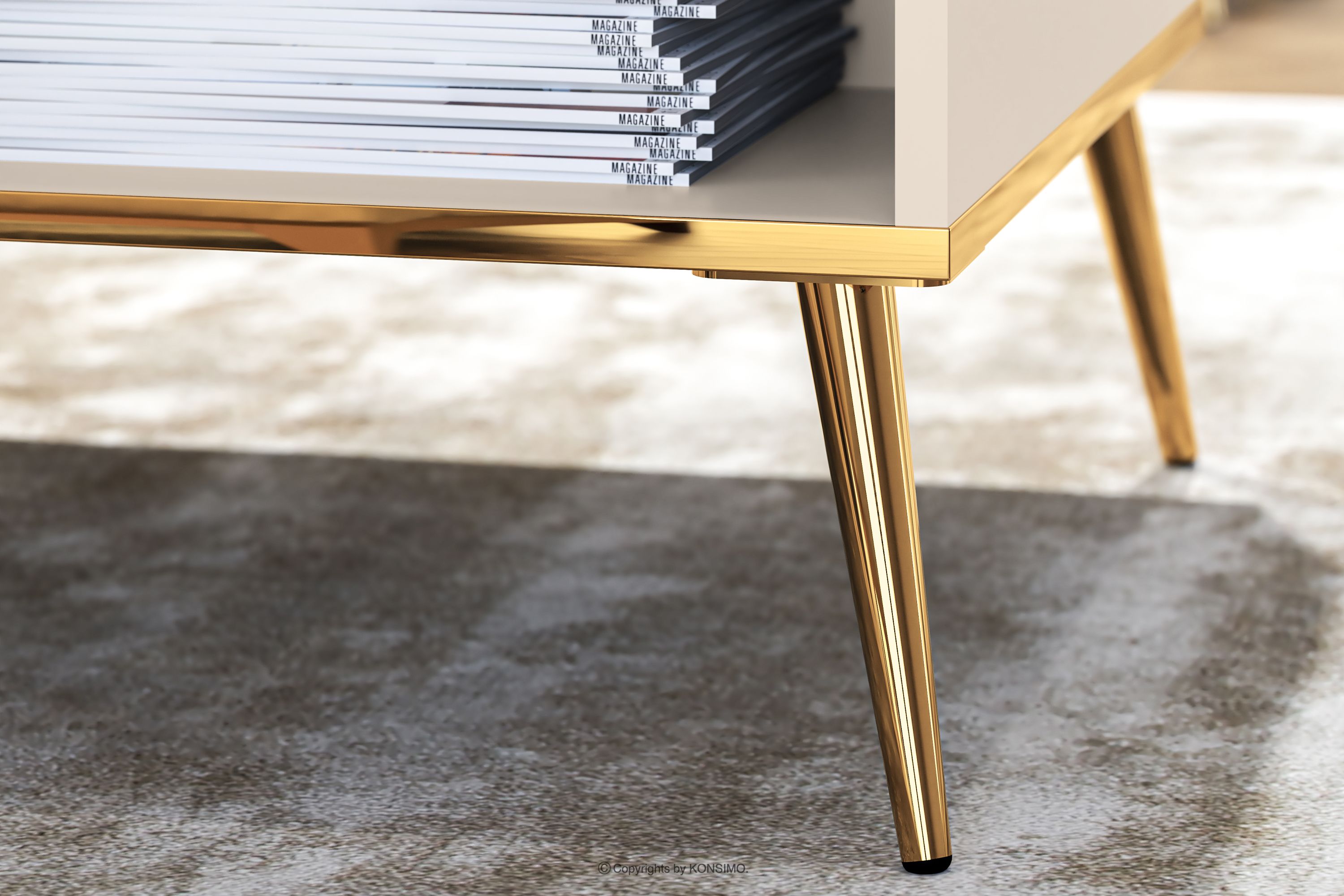Elegantný konferenčný stolík v krémovom štýle je určený pre ľudí, ktorí chcú do svojho interiéru vniesť prvky triedy a luxusu. Kovové zlaté nožičky sú detailom, ktorý podčiarkuje eleganciu nábytku a dodáva mu luxusný dojem. Laminovaná doska je známa svojou odolnosťou voči mechanickému poškodeniu, poškriabaniu a vlhkosti, vďaka čomu si nábytok zachováva svoj pôvodný vzhľad dlhé roky.