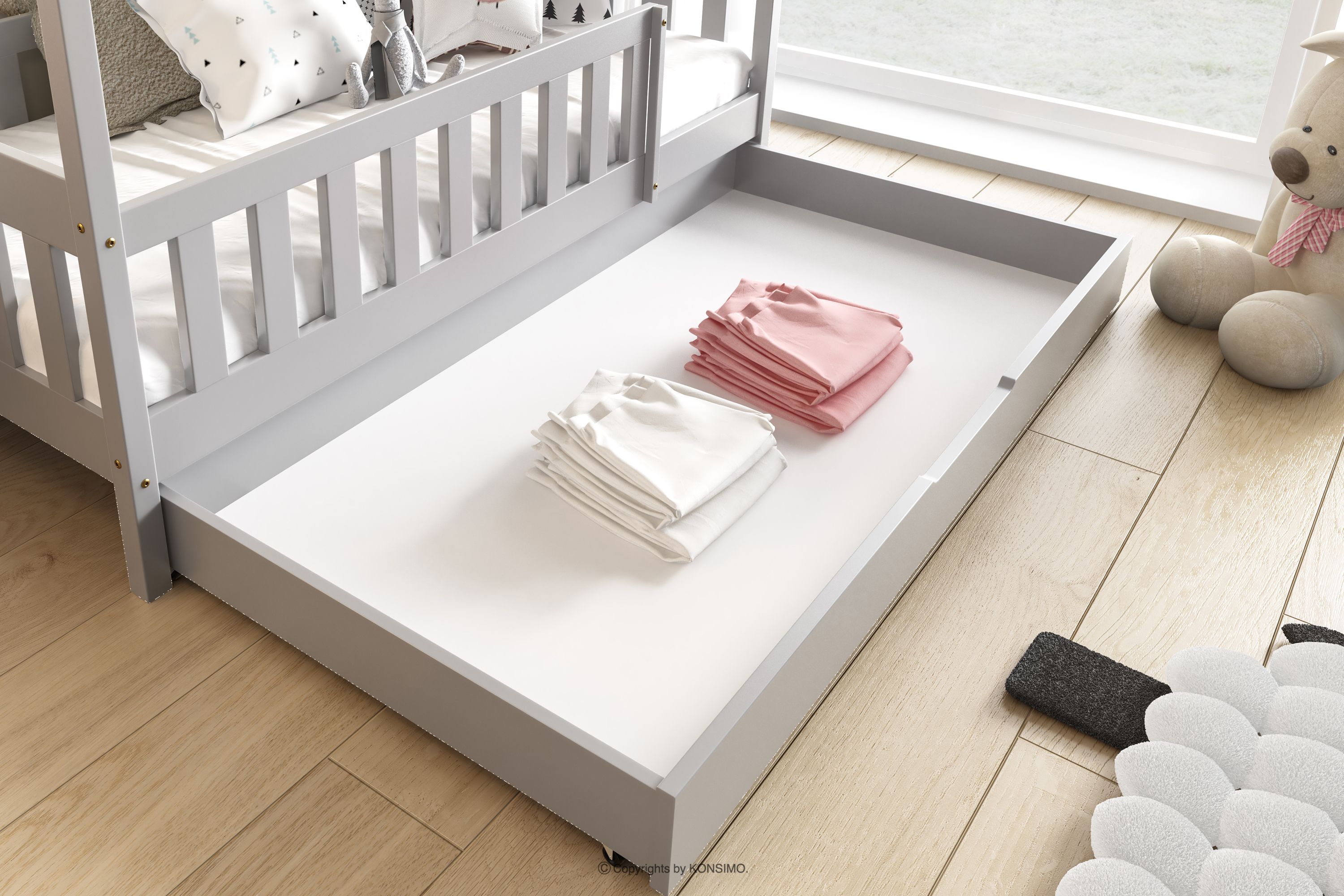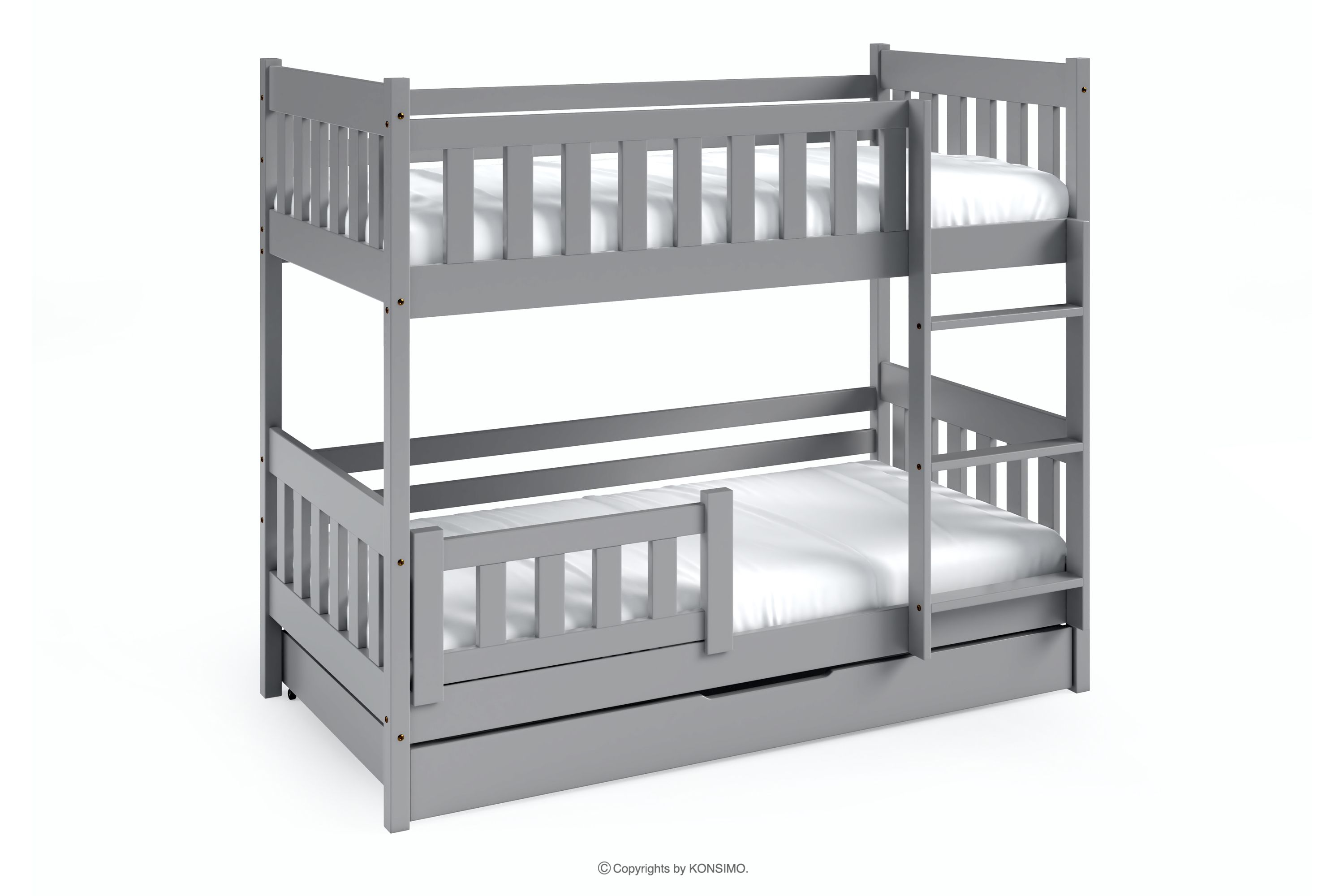 Detská manželská posteľ so zásuvkou sivej farby je dokonalou kombináciou funkčnosti, bezpečnosti a estetiky, vďaka ktorej bude každé dieťa rado zaspávať a hrať sa vo svojej izbe. Tento nábytok je vyrobený z najkvalitnejšieho borovicového dreva a vyznačuje sa výnimočnou odolnosťou, takže vydrží dlhé roky každodenného používania. Borovica ako materiál rámu je mimoriadne odolná.