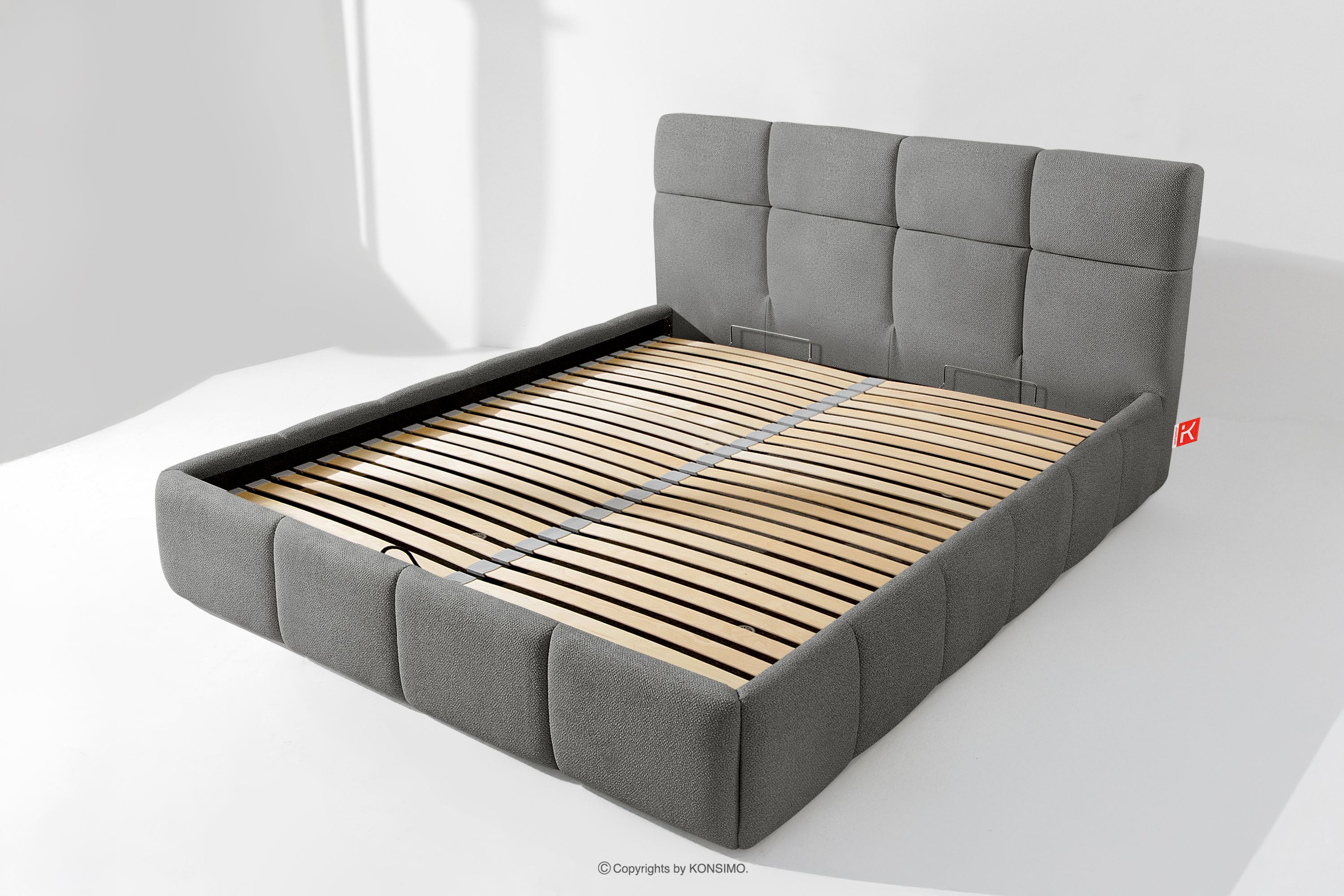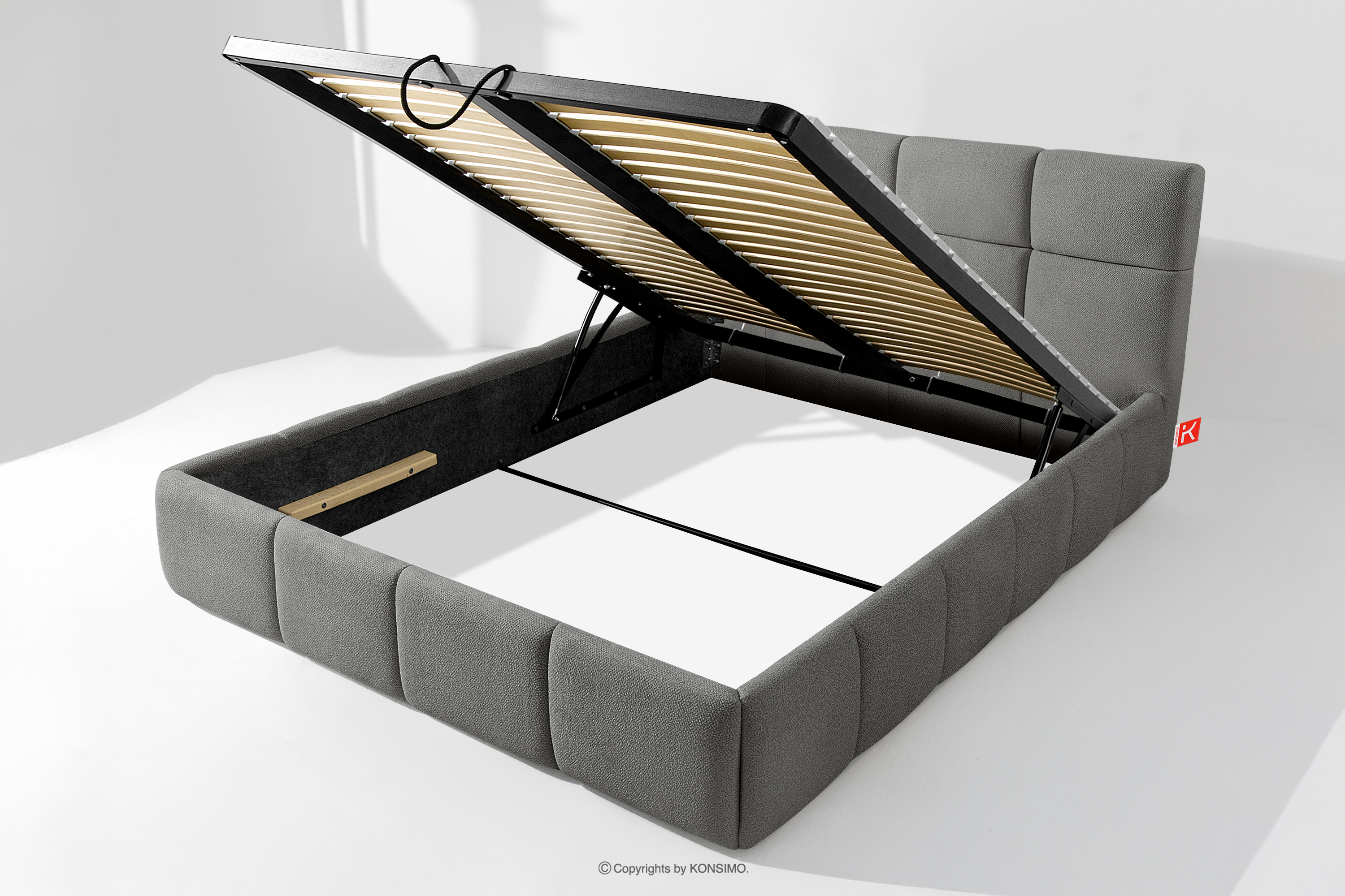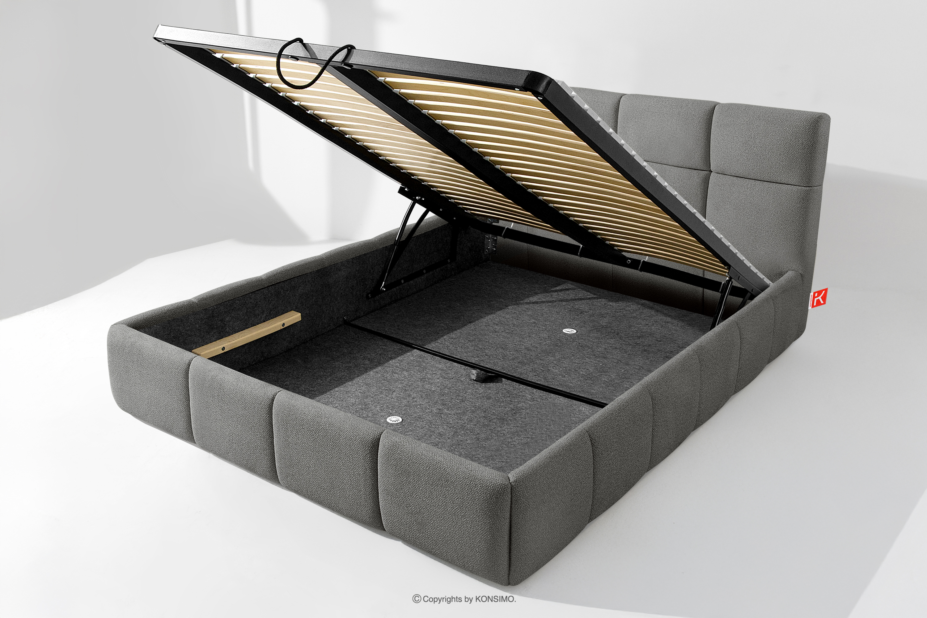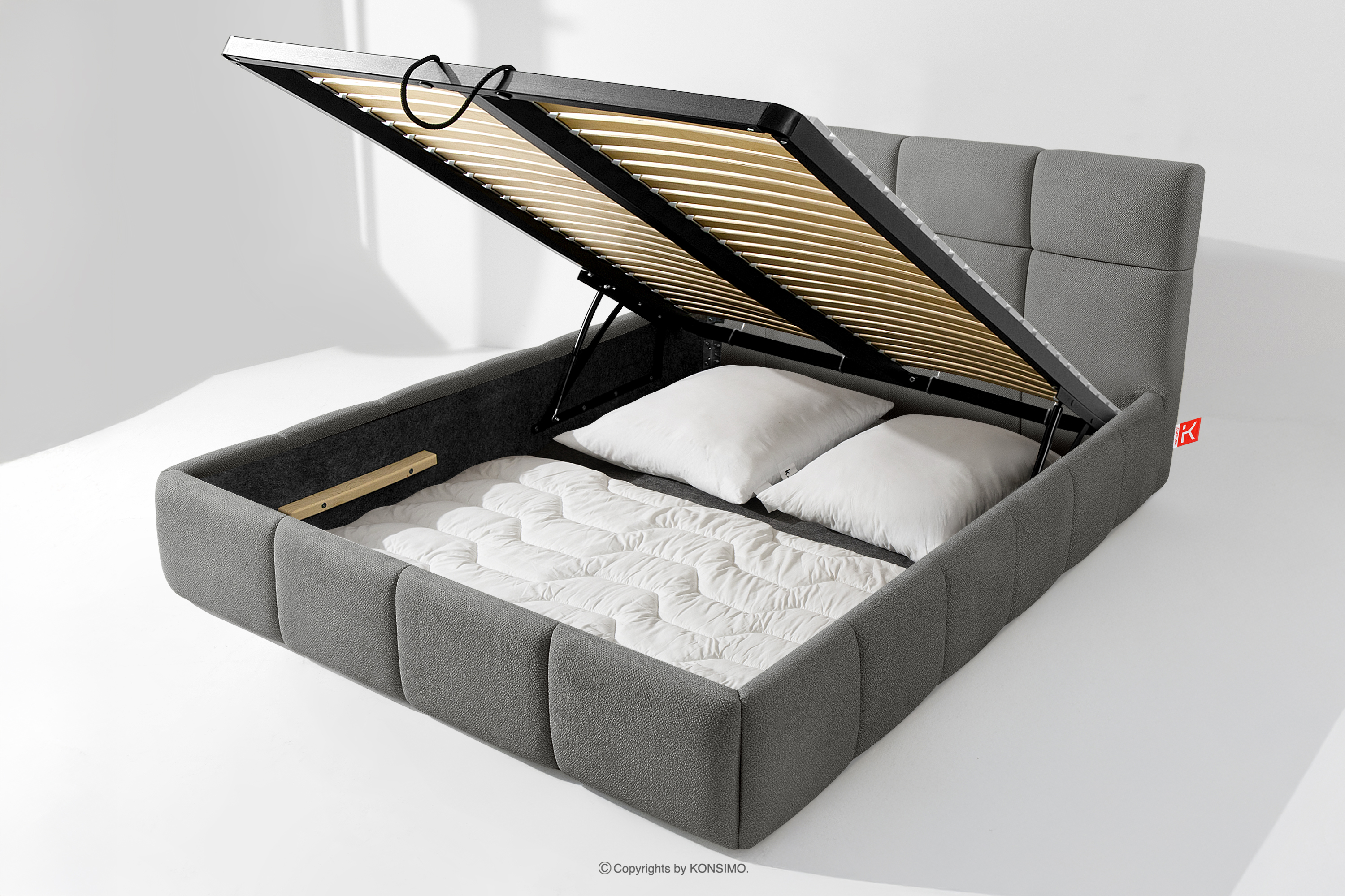 Používateľ má navyše možnosť prispôsobiť si tvrdosť postele - vďaka odnímateľným lamelám možno dosiahnuť mäkší alebo tvrdší základ. Ďalším komfortom je pohodlný kontajner na lôžkoviny, ktorý sa otvára vďaka moderným plynovým fľašiam - bez námahy a plne automaticky. Toto praktické riešenie umožňuje rýchly prístup k uloženej posteľnej bielizni bez toho, aby ste museli ručne zdvíhať ťažký matrac.