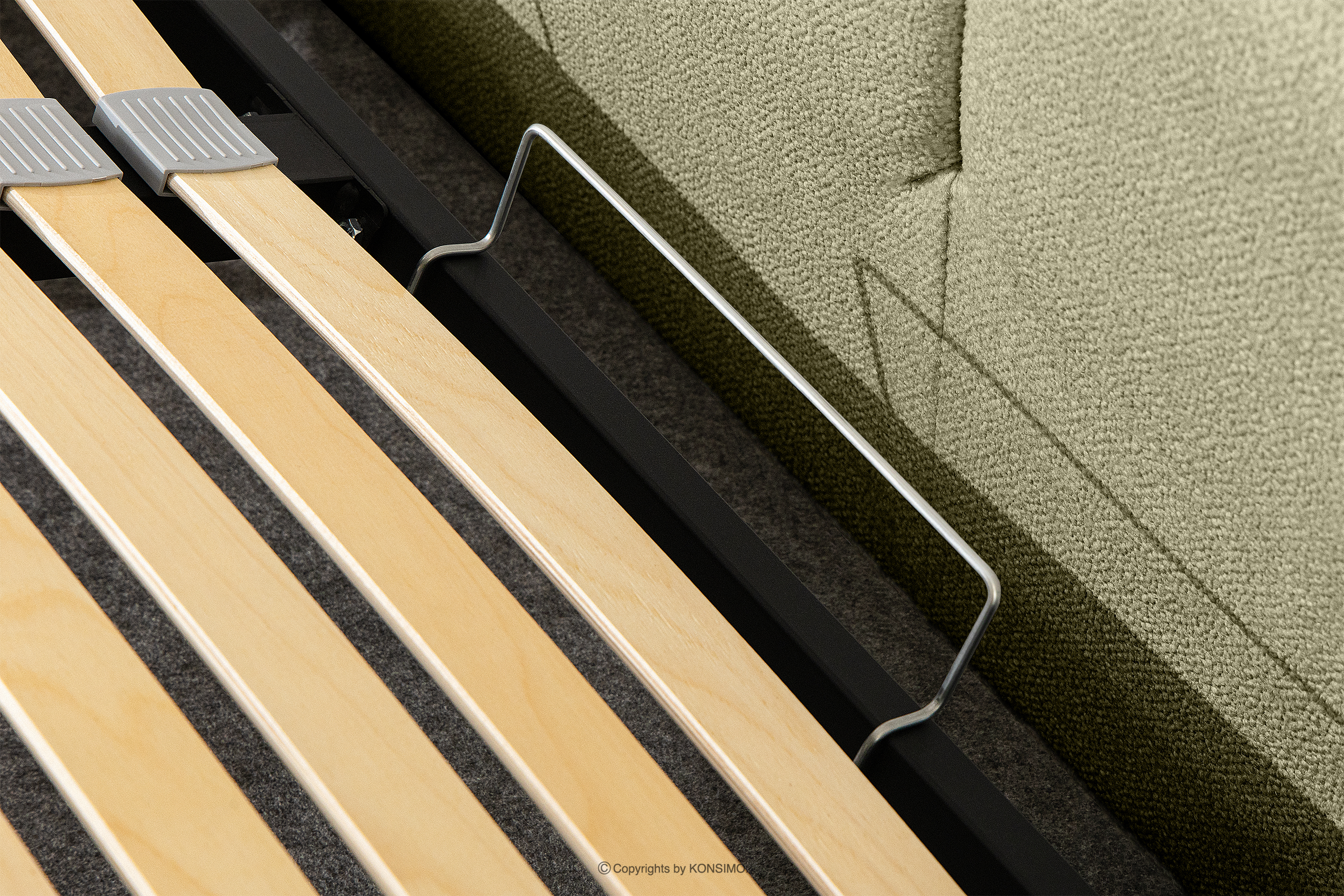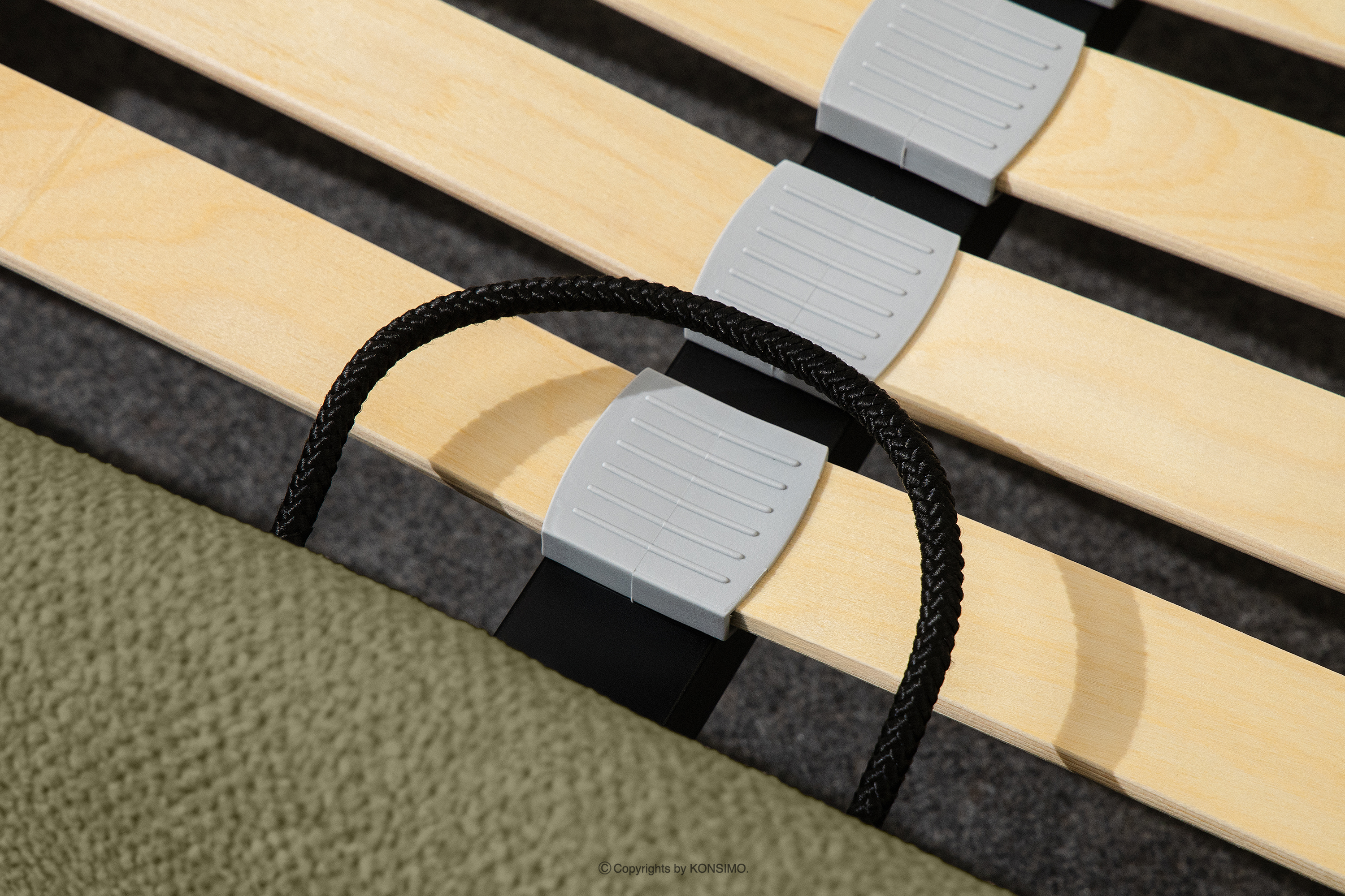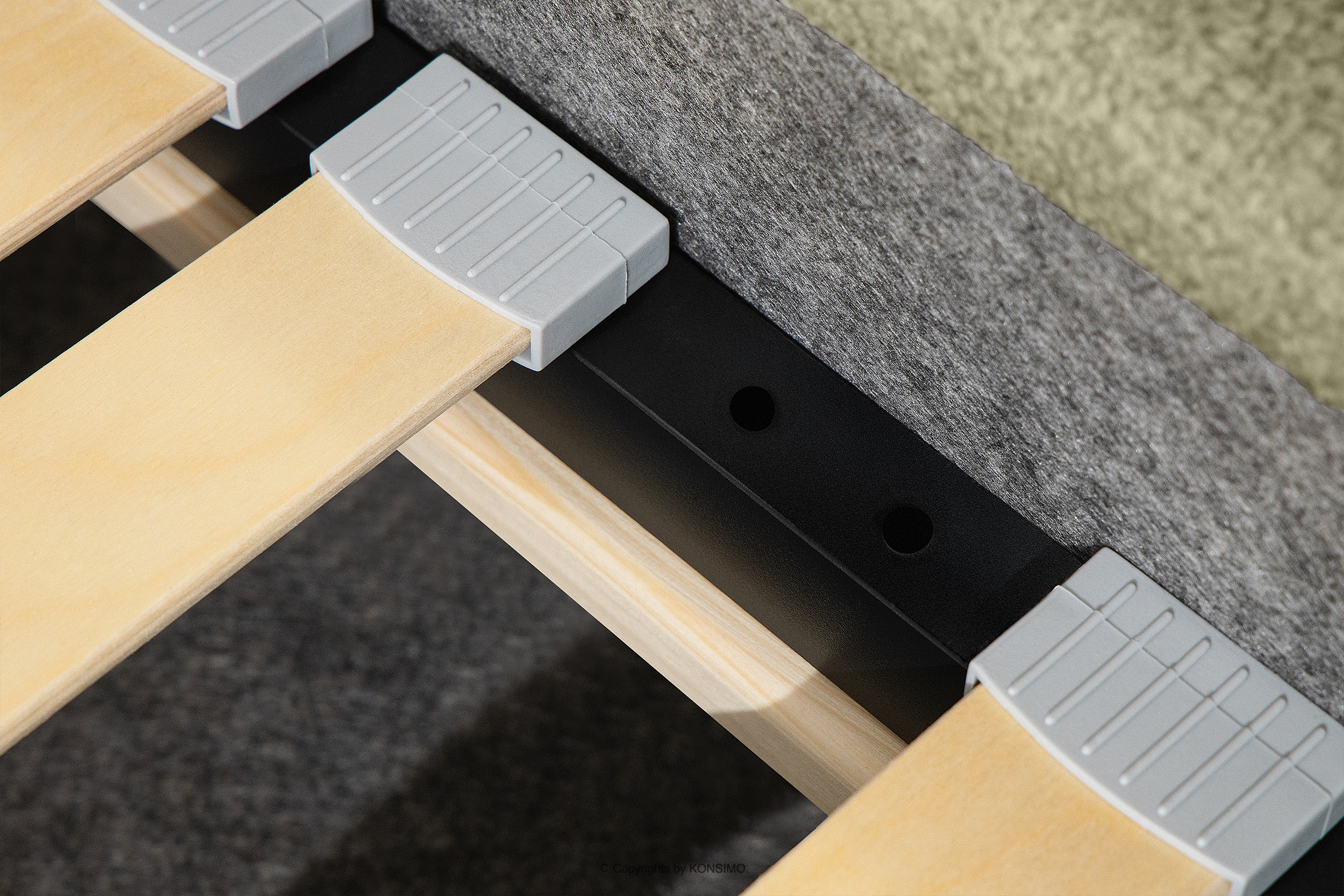 Čalúnená posteľ 140 cm v zelenom škandinávskom štýle spája minimalistický dizajn s maximálnym komfortom. Vďaka svojmu jedinečnému tvaru nielenže pozoruhodne vyzerá, ale ponúka aj pohodlie na najvyššej úrovni. Posteľ je vybavená pevným rámom z pružných drevených lamiel, ktoré poskytujú optimálnu oporu matracu a prispôsobujú sa prirodzeným pohybom tela. Navyše má používateľ možnosť prispôsobiť si tvrdosť postele - vďaka odnímateľným lamelám možno dosiahnuť mäkší alebo tvrdší základ.