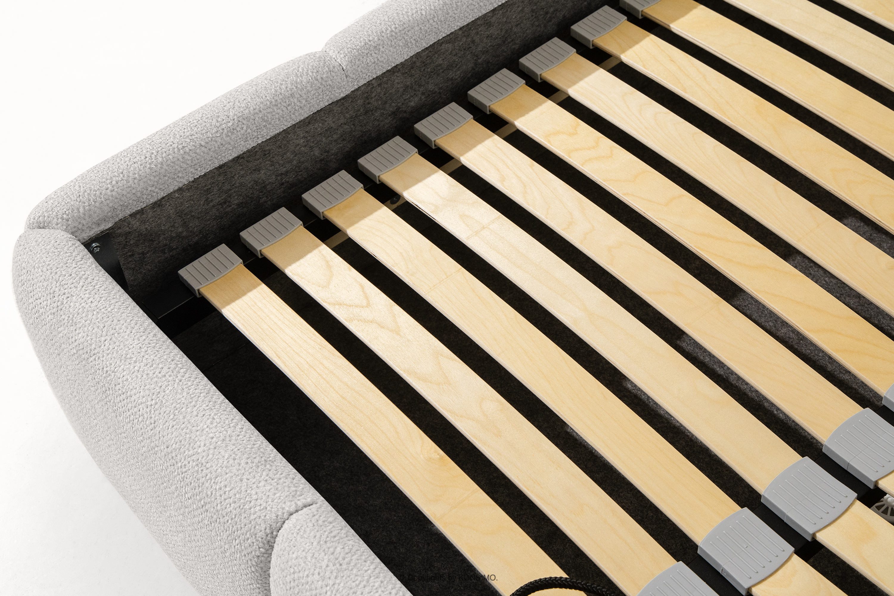 Posteľ s dĺžkou 180 cm v bielej látke boucle spája minimalistický dizajn s maximálnym pohodlím. Vďaka svojmu jedinečnému tvaru nielenže pozoruhodne vyzerá, ale ponúka aj pohodlie na najvyššej úrovni. Posteľ je vybavená pevným rámom z pružných drevených lamiel, ktoré poskytujú optimálnu oporu matracu a prispôsobujú sa prirodzeným pohybom tela. Používateľ má navyše možnosť prispôsobiť si tvrdosť postele - vďaka odnímateľným lamelám možno dosiahnuť mäkší alebo tvrdší základ.