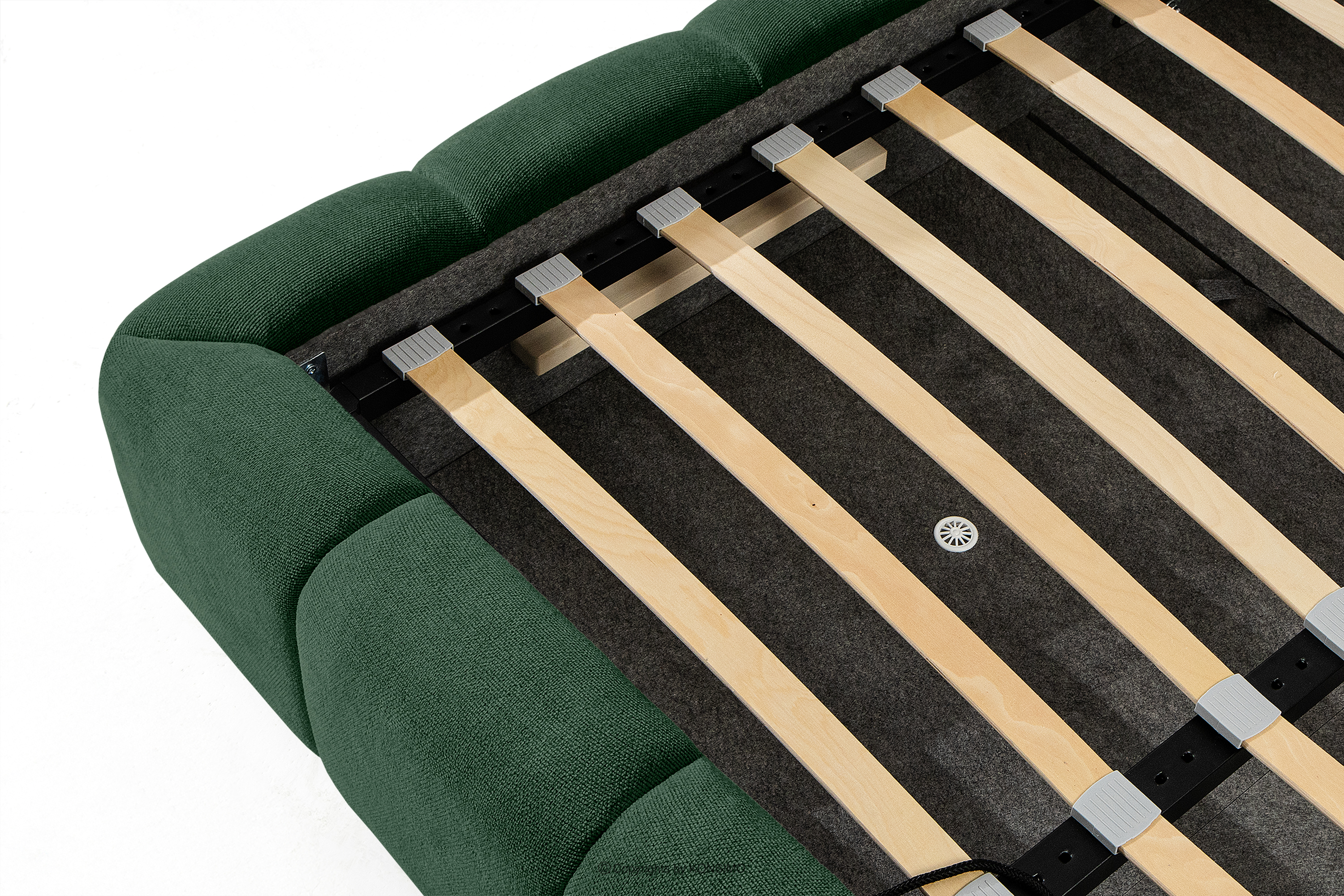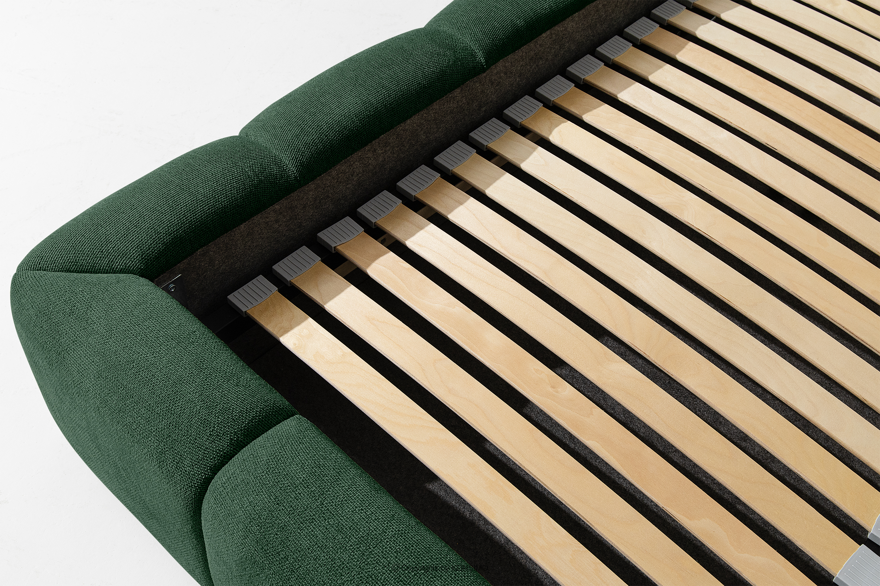 Posteľ 160 s opierkou hlavy tmavozelená je harmonickým spojením jednoduchosti škandinávskeho štýlu s výnimočným komfortom používania. Jej jedinečný tvar inšpirovaný tvarom oblaku upúta pozornosť originálnym dizajnom a zároveň poskytuje pohodlie na najvyššej úrovni. Základom konštrukcie je pružný rám z drevených lamiel, ktorého ďalšou výhodou je možnosť nastavenia tvrdosti lôžka - vďaka odnímateľným lamelám môžete úroveň mäkkosti prispôsobiť individuálnym preferenciám.