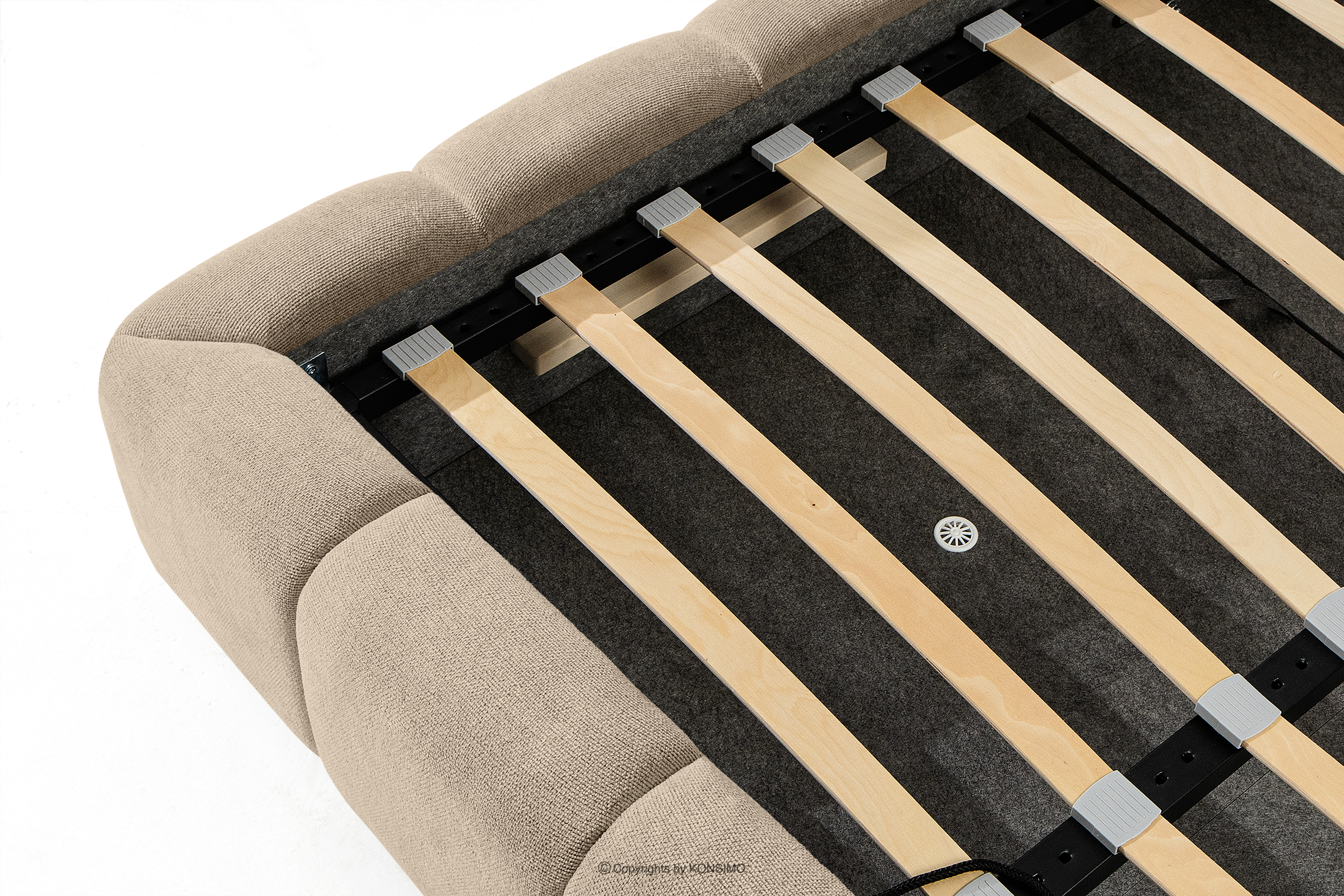 Čalúnená posteľ s opierkou hlavy béžová 180 cm je harmonickým spojením jednoduchosti škandinávskeho štýlu s výnimočným komfortom používania. Jej jedinečný tvar inšpirovaný tvarom oblaku upúta pozornosť svojím originálnym dizajnom a zároveň poskytuje pohodlie na najvyššej úrovni. Základom konštrukcie je pružný rám z drevených lamiel, ktorého ďalšou výhodou je možnosť nastavenia tvrdosti lôžka - vďaka vyberateľným lamelám môžete úroveň mäkkosti prispôsobiť individuálnym preferenciám.