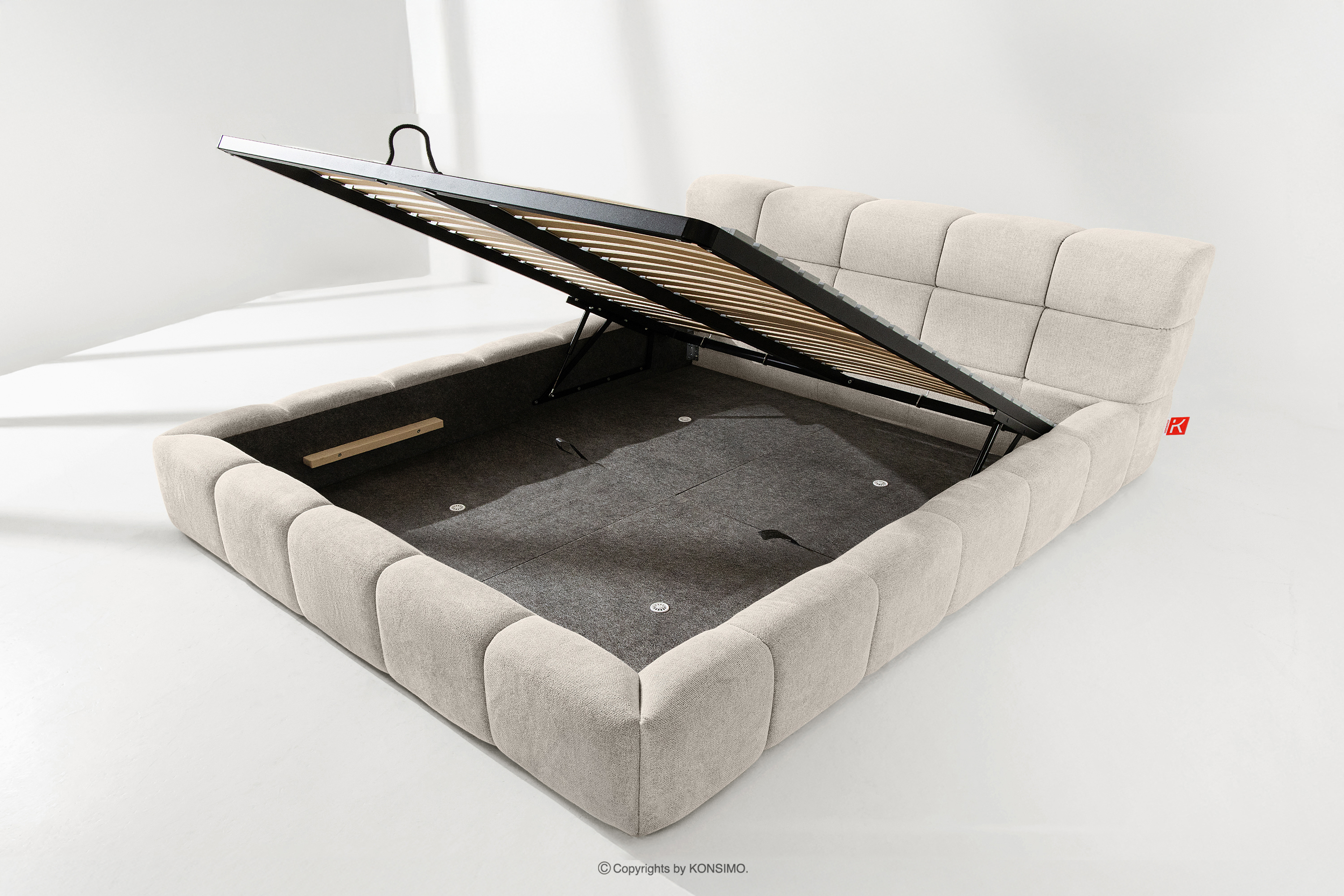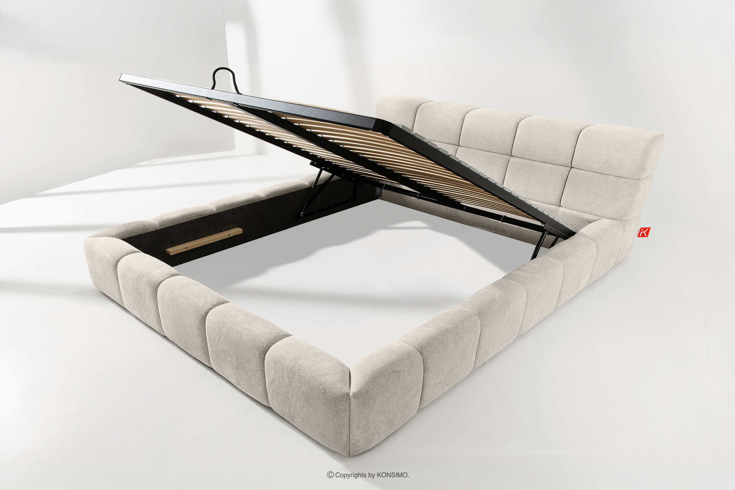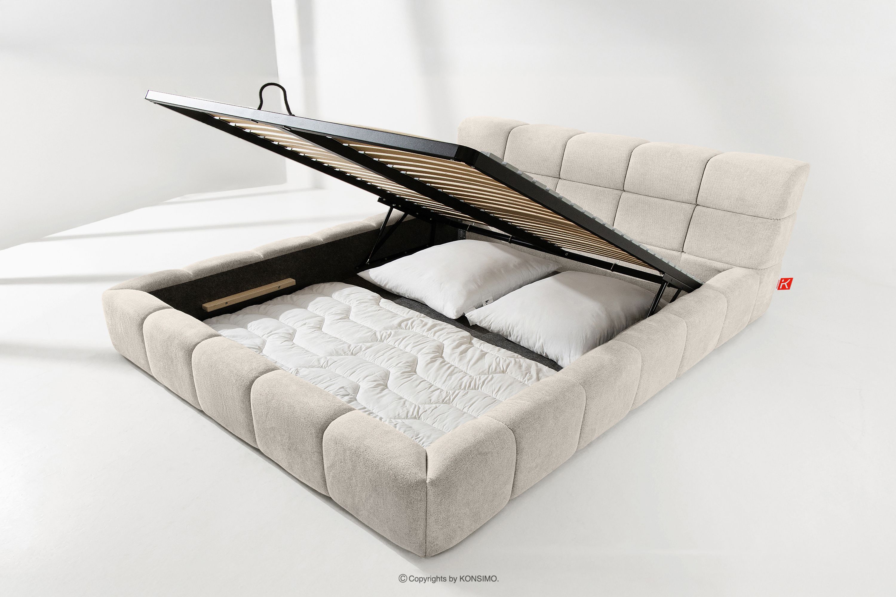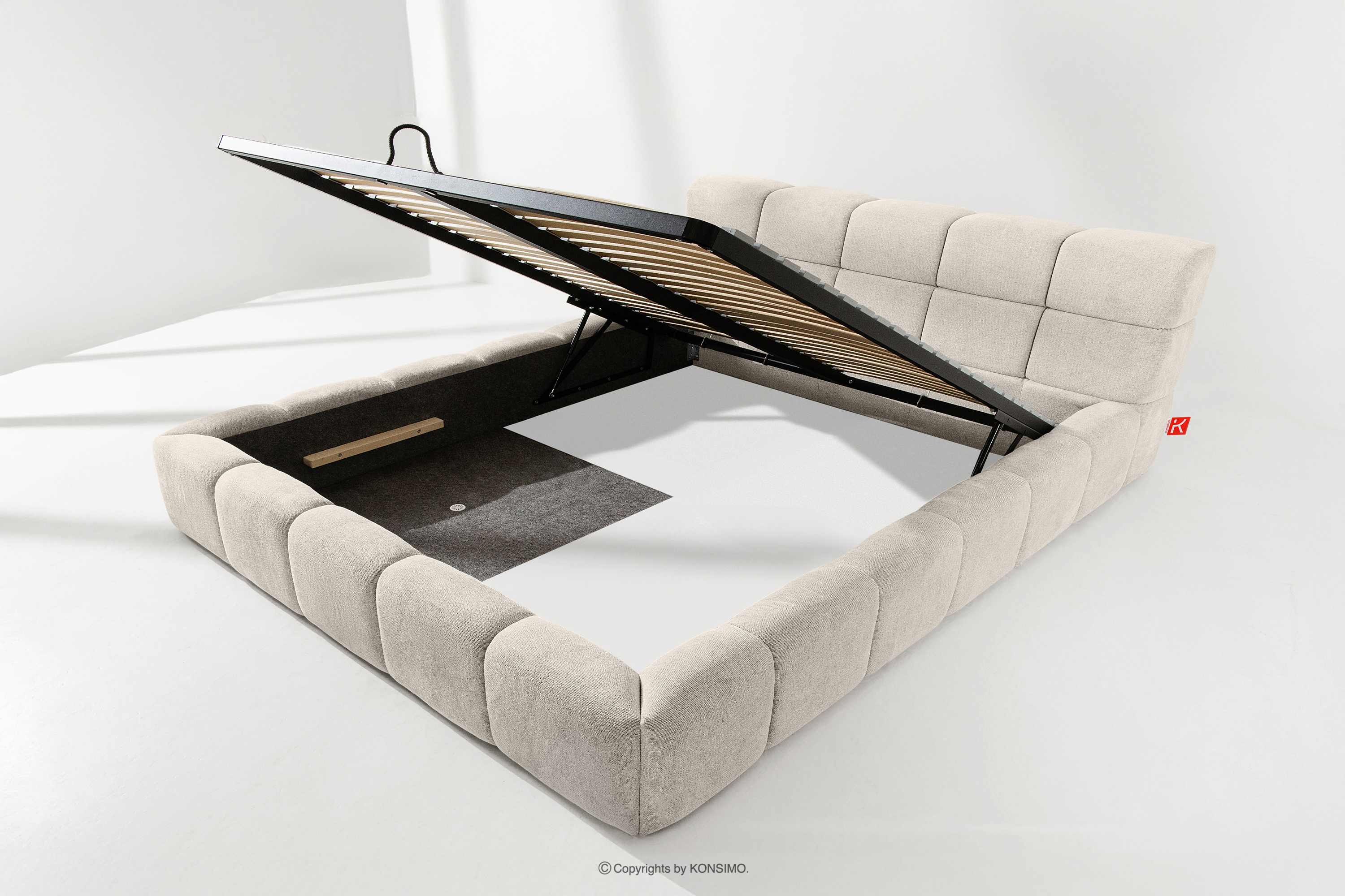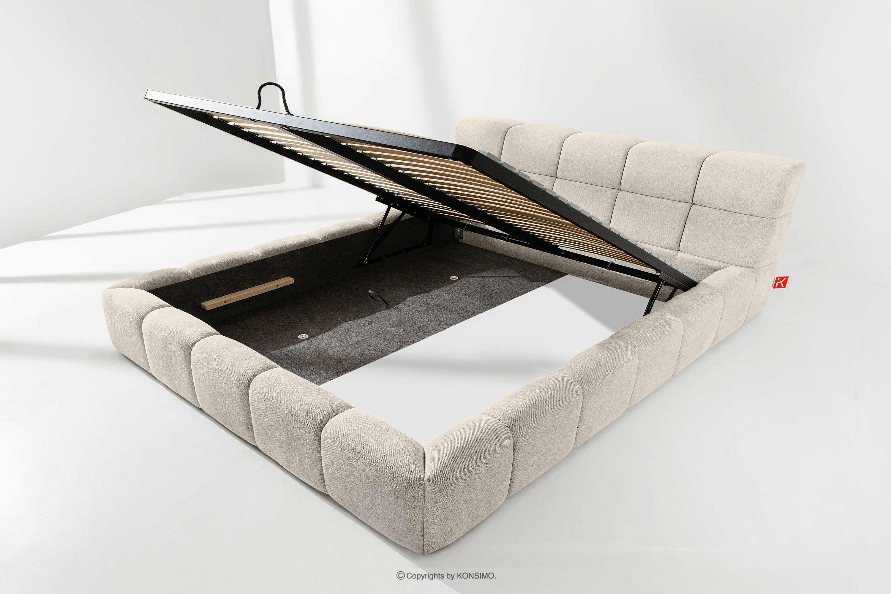 Čalúnnická látka použitá na poťah postele je synonymom elegancie a odolnosti. Je nielen mimoriadne odolná voči každodennému opotrebovaniu, ale aj mimoriadne ľahko sa čistí. Tkaná látka sa dokonale hodí do škandinávskeho a moderného štýlu, interiéru dodáva teplo a jemnú eleganciu. Za zmienku stoja aj funkčné riešenia, ako napríklad odnímateľná podlaha v kontajneri na lôžkoviny, ktorá uľahčuje udržiavanie čistoty, alebo steny a dno truhlice čalúnené plsťou, ktorá zabraňuje pohybu uložených predmetov. Vďaka týmto detailom je posteľ nielen estetická, ale aj praktická na každodenné používanie.
