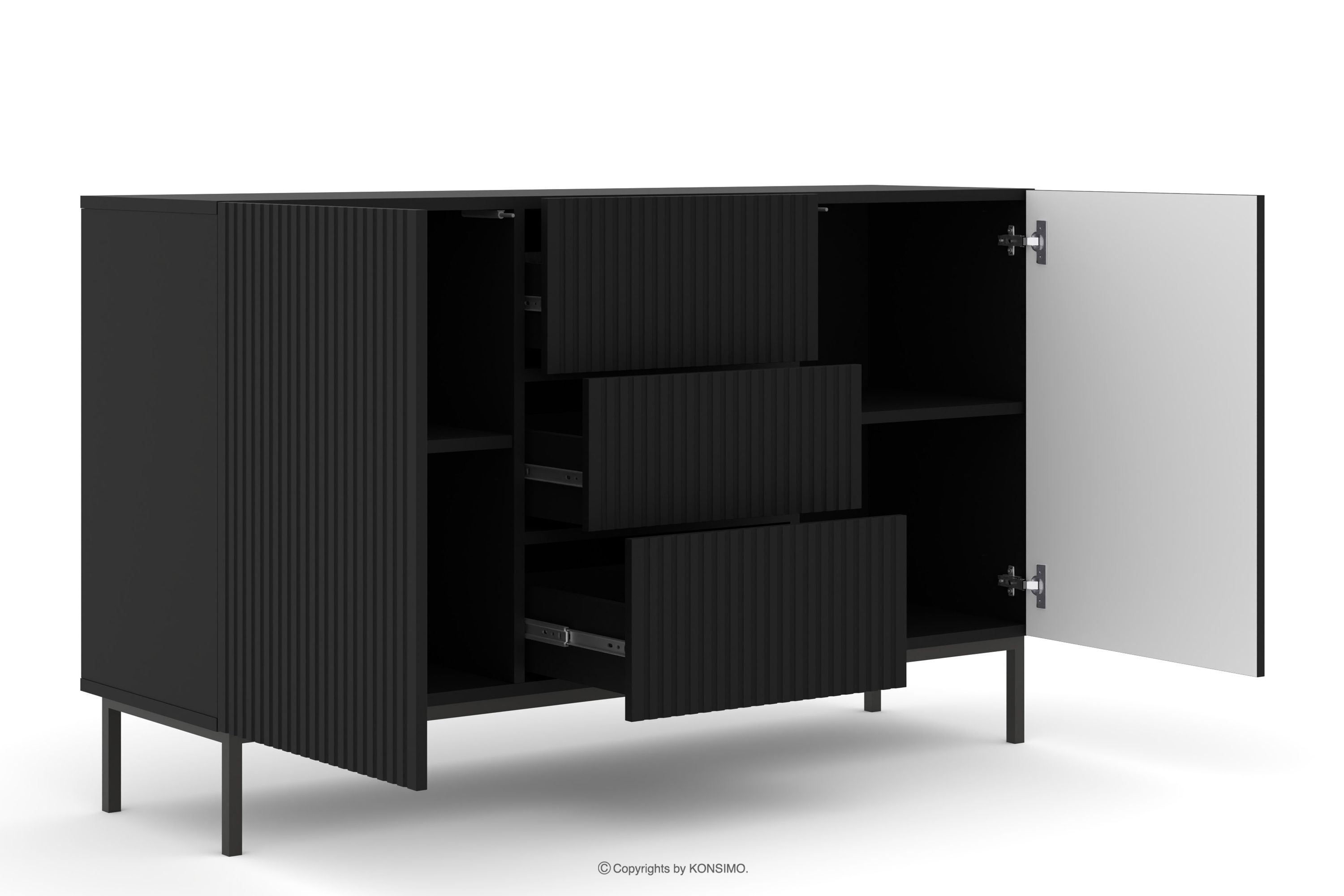 Elegantná čierna komoda do obývačky na nožičkách je kombináciou výnimočného dizajnu, solídneho spracovania a funkčnosti. Boli vytvorené pre ľudí, ktorí si cenia estetiku a pohodlie pri každodennom používaní. Jednoduché, minimalistické formy obohatené o jemné detaily sú v súlade s najnovšími trendmi v interiérovom dizajne, vďaka čomu harmonicky zapadnú do rôznych aranžmánov.