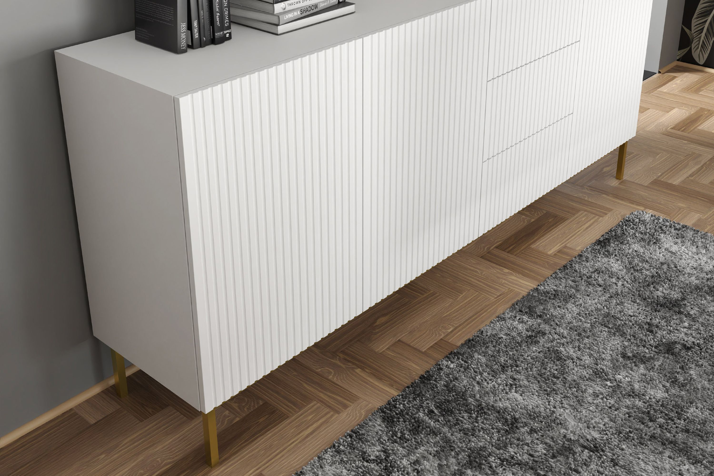 Biela komoda do izby na zlatých nožičkách je kombináciou výnimočného dizajnu, solídneho spracovania a funkčnosti. Boli vytvorené pre ľudí, ktorí si cenia estetiku a pohodlie pri každodennom používaní. Jednoduché, minimalistické formy obohatené o jemné detaily sú v súlade s najnovšími interiérovými trendmi, vďaka čomu harmonicky zapadnú do rôznych aranžmánov. Tento nábytok je vynikajúcou voľbou pre každého, kto si chce vytvoriť moderný a zároveň útulný interiér, kde pohodlie a štýl idú ruka v ruke.