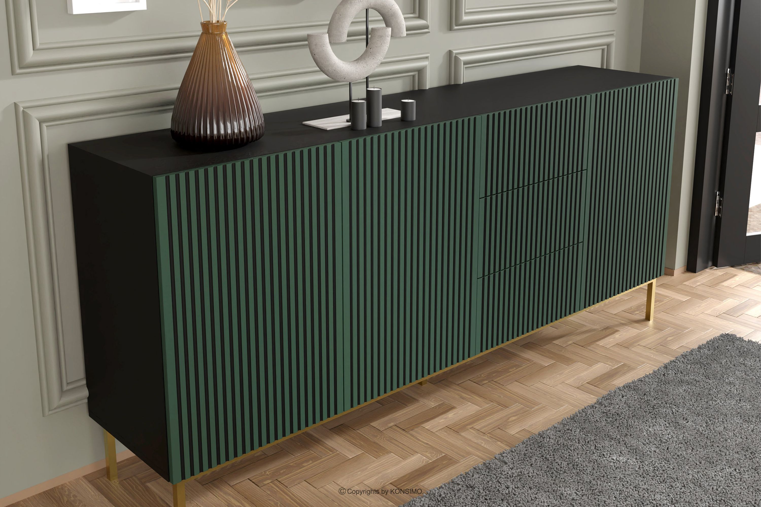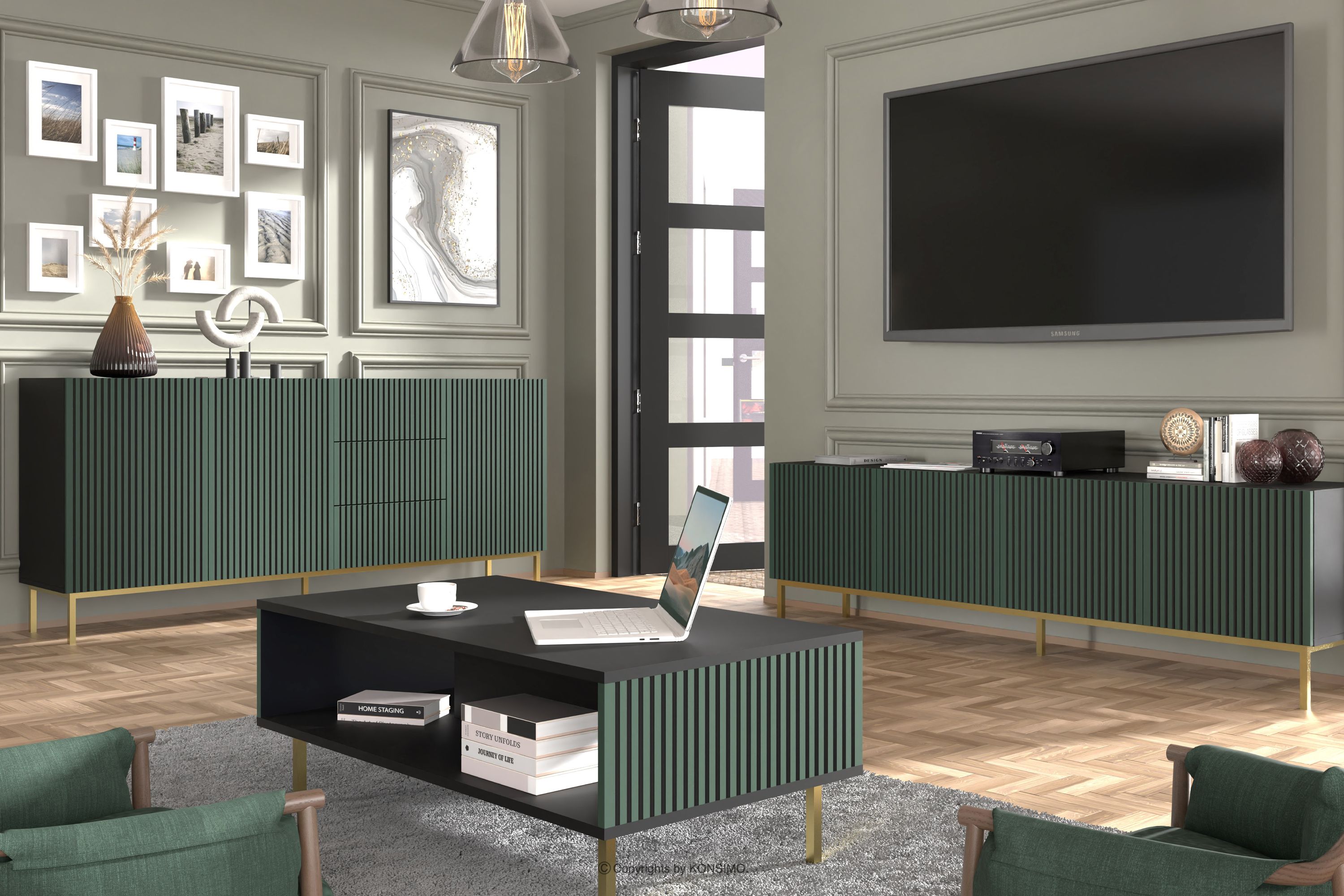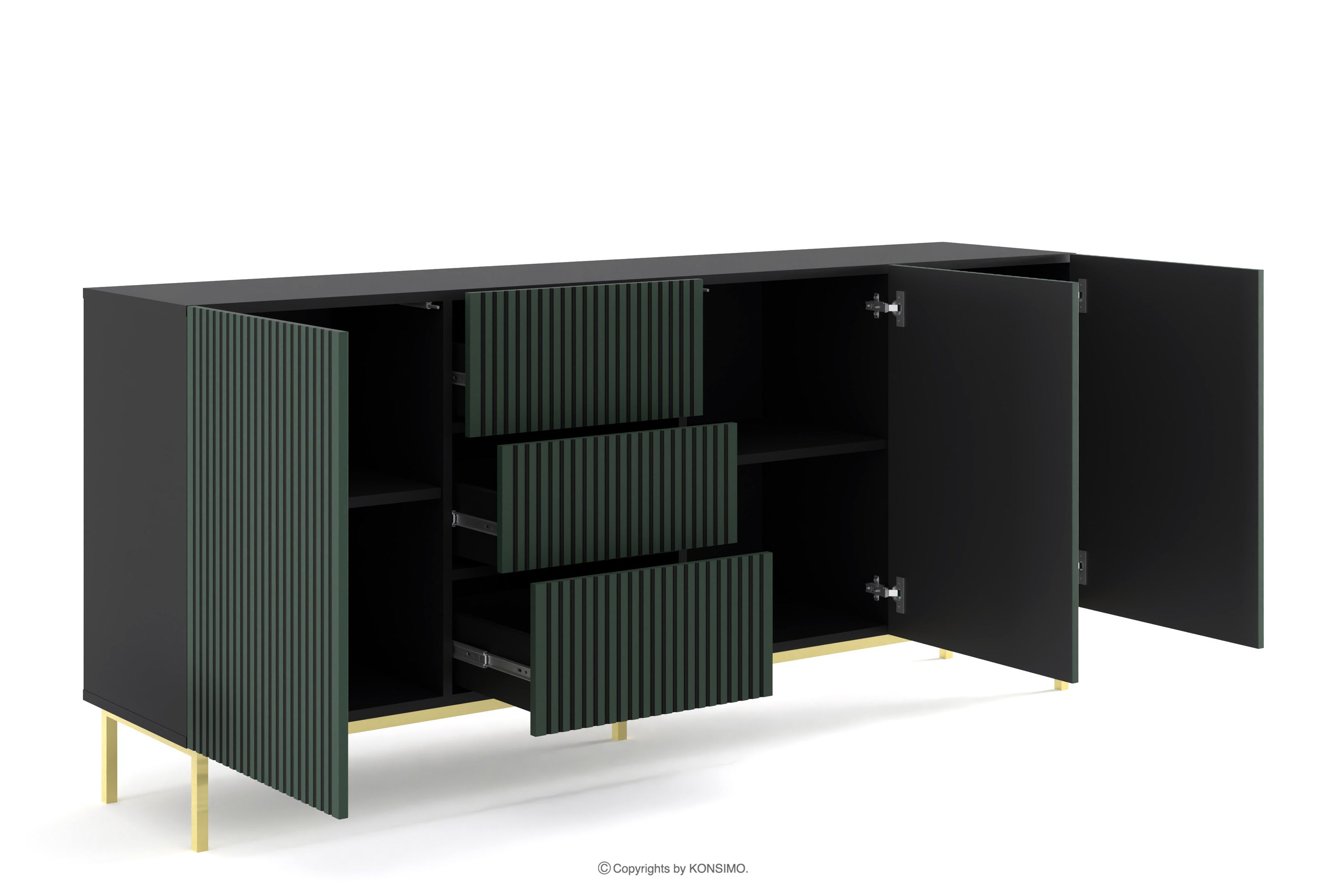 Komoda na vysokých zlatých nožičkách čierno-zelená je kombináciou výnimočného dizajnu, solídneho spracovania a funkčnosti. Boli vytvorené pre ľudí, ktorí si cenia estetiku a pohodlie pri každodennom používaní. Jednoduché, minimalistické formy obohatené o jemné detaily sú v súlade s najnovšími trendmi v interiérovom dizajne, vďaka čomu harmonicky zapadnú do rôznych aranžmánov. Tento nábytok je vynikajúcou voľbou pre každého, kto si chce vytvoriť moderný a zároveň útulný interiér, kde pohodlie a štýl idú ruka v ruke.