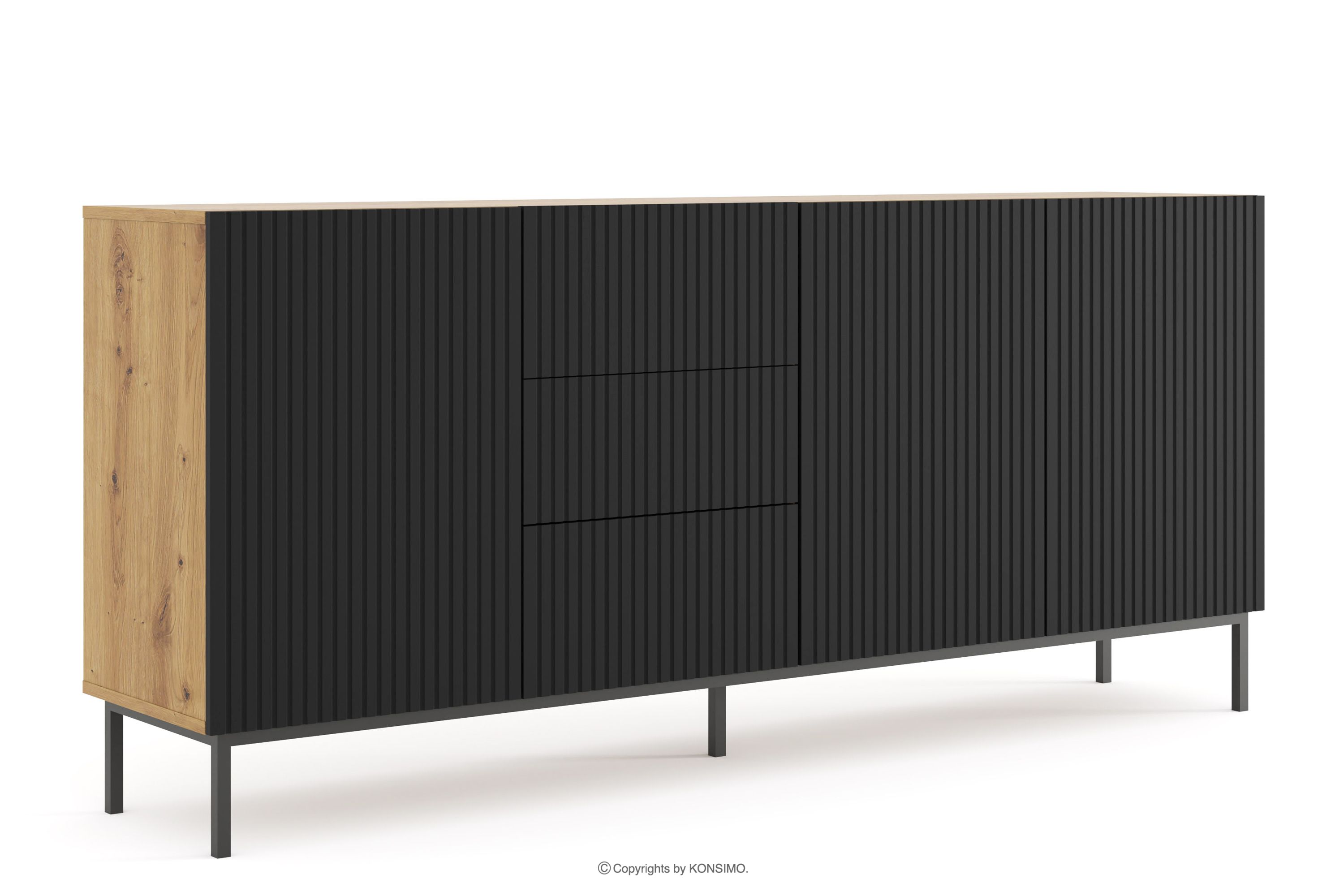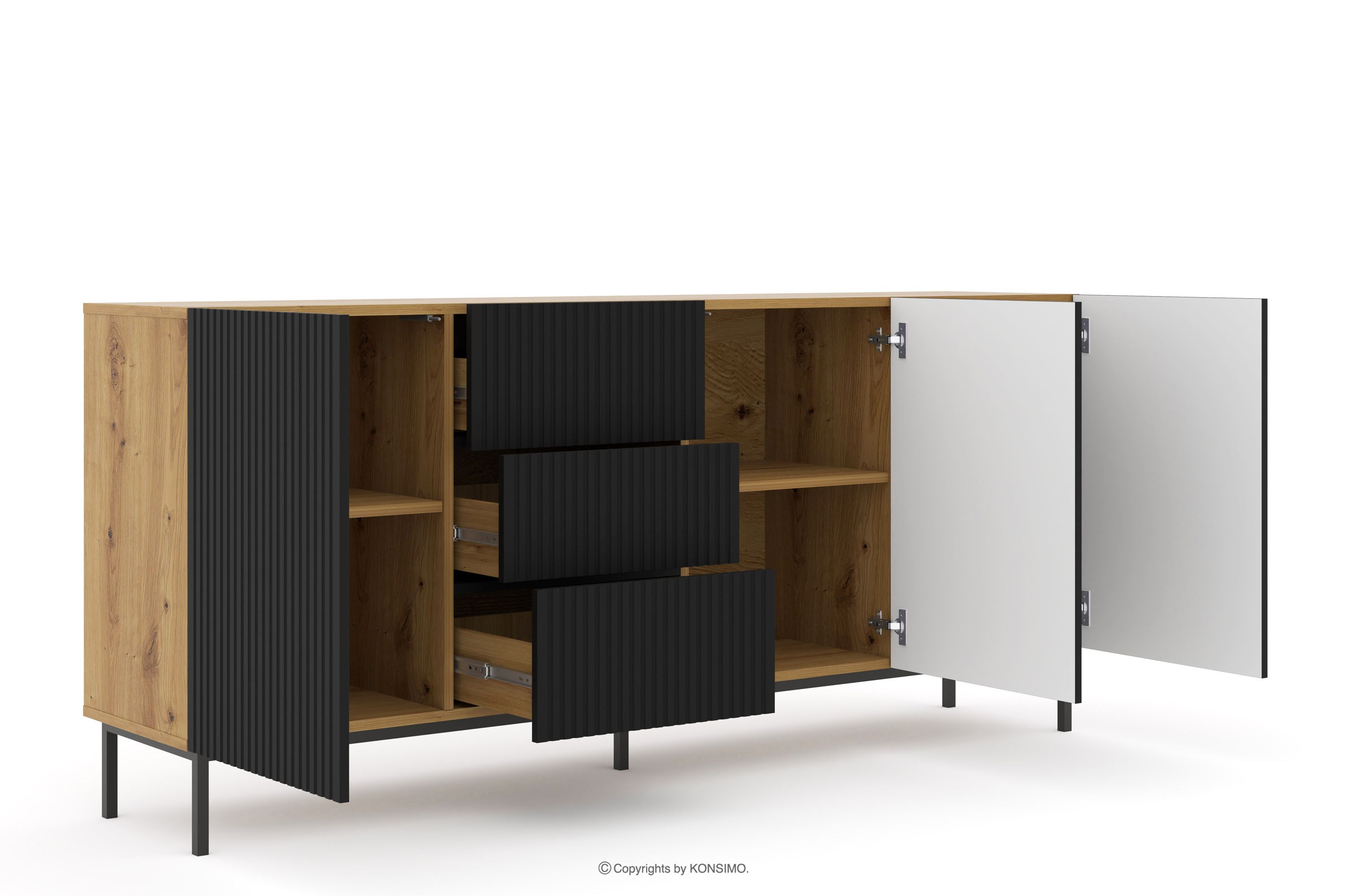 Komoda do obývačky z dubového dreva artisan/čierna s čiernymi nožičkami je kombináciou výnimočného dizajnu, solídneho spracovania a funkčnosti. Boli vytvorené pre ľudí, ktorí si cenia estetiku a pohodlie pri každodennom používaní. Jednoduché, minimalistické formy obohatené o jemné detaily sú v súlade s najnovšími trendmi v interiérovom dizajne, vďaka čomu harmonicky zapadnú do rôznych aranžmánov.