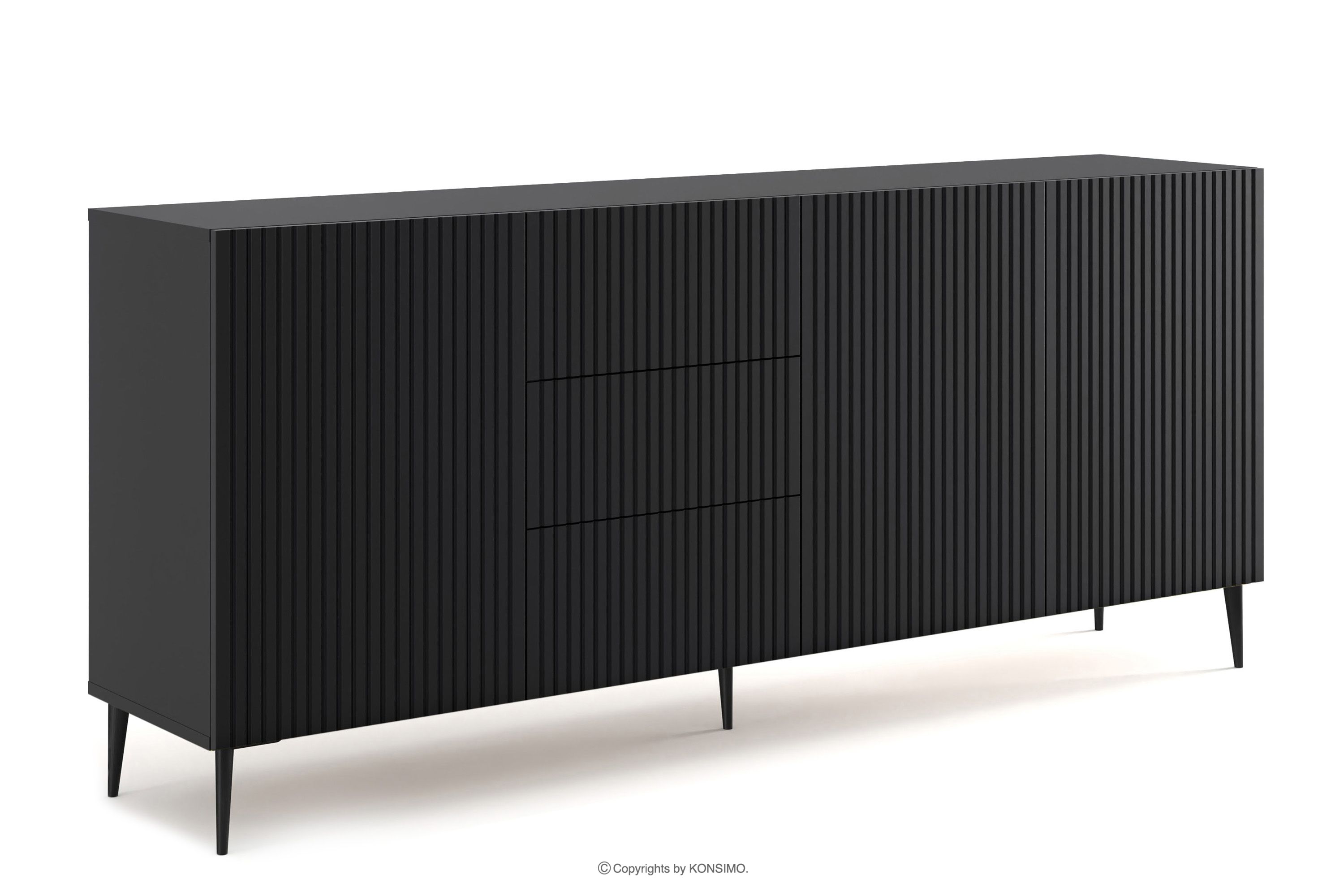 Čierna elegantná izbová komoda na čiernych nožičkách je kombináciou výnimočného dizajnu, solídneho spracovania a funkčnosti. Boli vytvorené pre ľudí, ktorí si cenia estetiku a pohodlie pri každodennom používaní. Jednoduché, minimalistické formy obohatené o jemné detaily sú v súlade s najnovšími trendmi v interiérovom dizajne, vďaka čomu harmonicky zapadnú do rôznych aranžmánov.