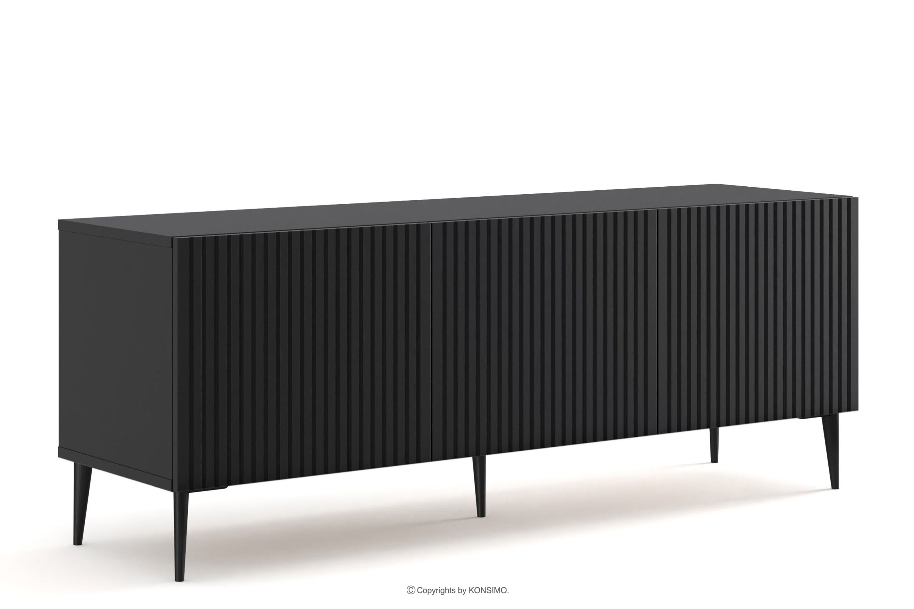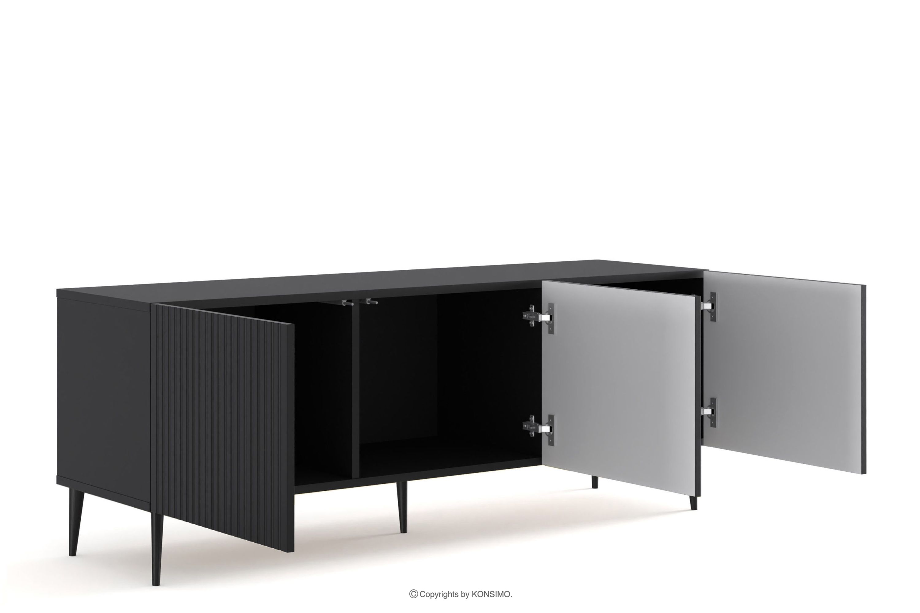 Široká RTV skrinka na čiernych nožičkách čiernej farby je kombináciou výnimočného dizajnu, solídneho spracovania a funkčnosti. Bola vytvorená pre ľudí, ktorí si cenia estetiku a pohodlie pri každodennom používaní. Jednoduché, minimalistické formy obohatené o jemné detaily sú v súlade s najnovšími trendmi v interiérovom dizajne, vďaka čomu harmonicky zapadajú do rôznych aranžmánov.
