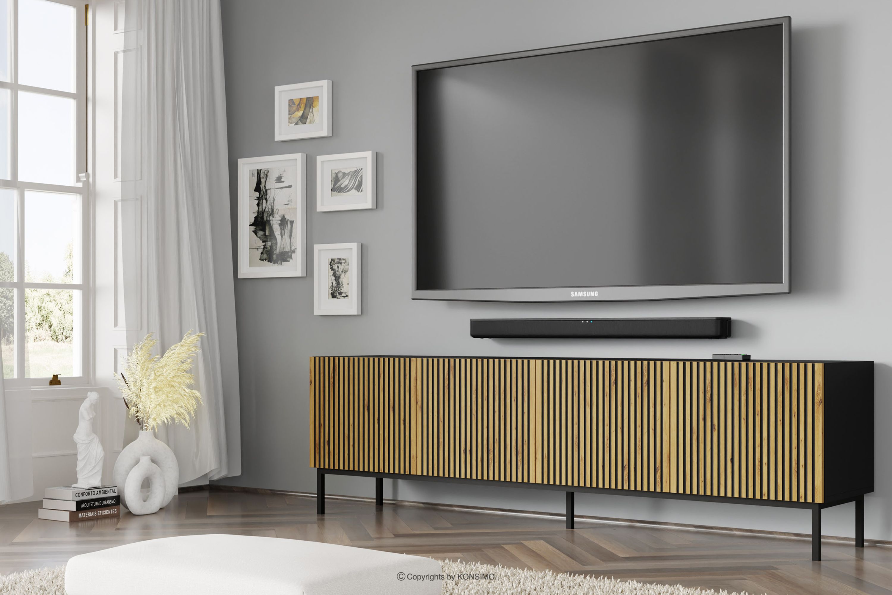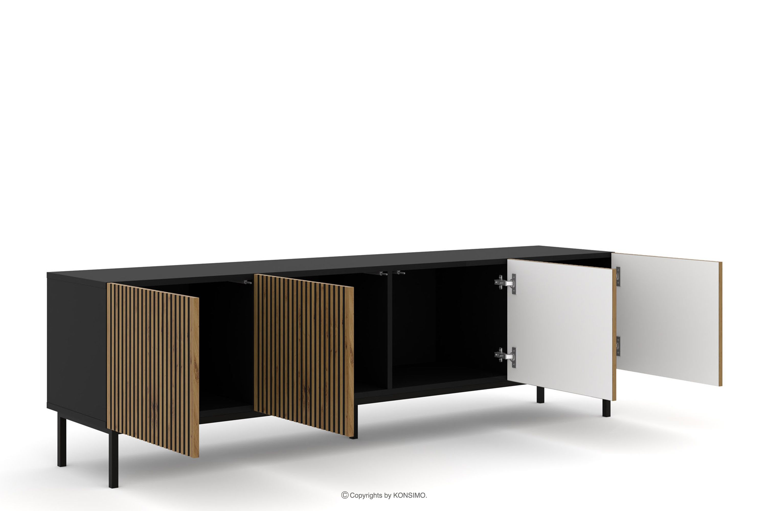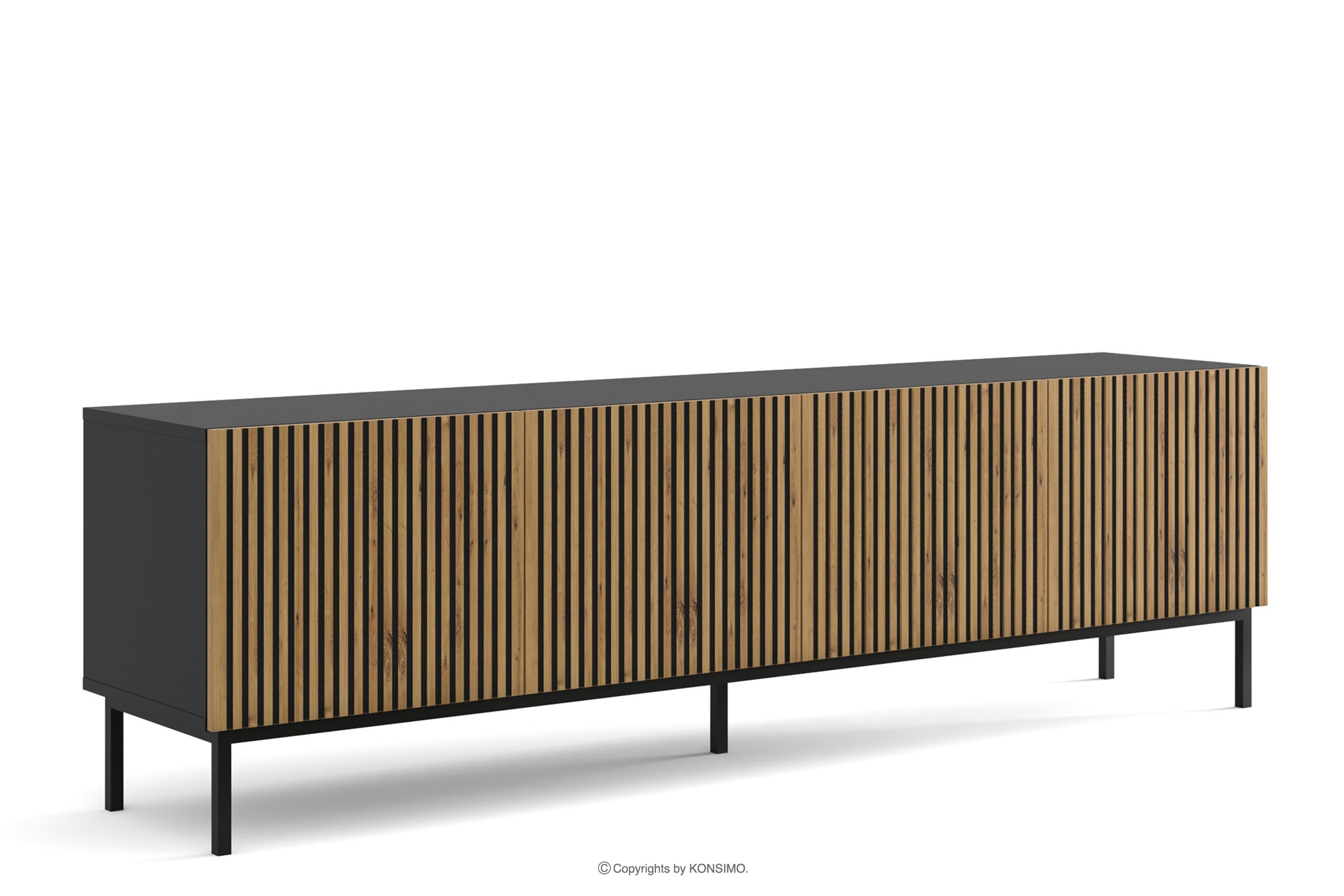 RTV skrinka s lamelami na čiernych nožičkách čierna/dub artisan je kombináciou výnimočného dizajnu, solídneho spracovania a funkčnosti. Boli vytvorené pre ľudí, ktorí si cenia estetiku a pohodlie pri každodennom používaní. Jednoduché, minimalistické formy obohatené o jemné detaily sú v súlade s najnovšími trendmi v interiérovom dizajne, vďaka čomu harmonicky zapadajú do rôznych aranžmánov.