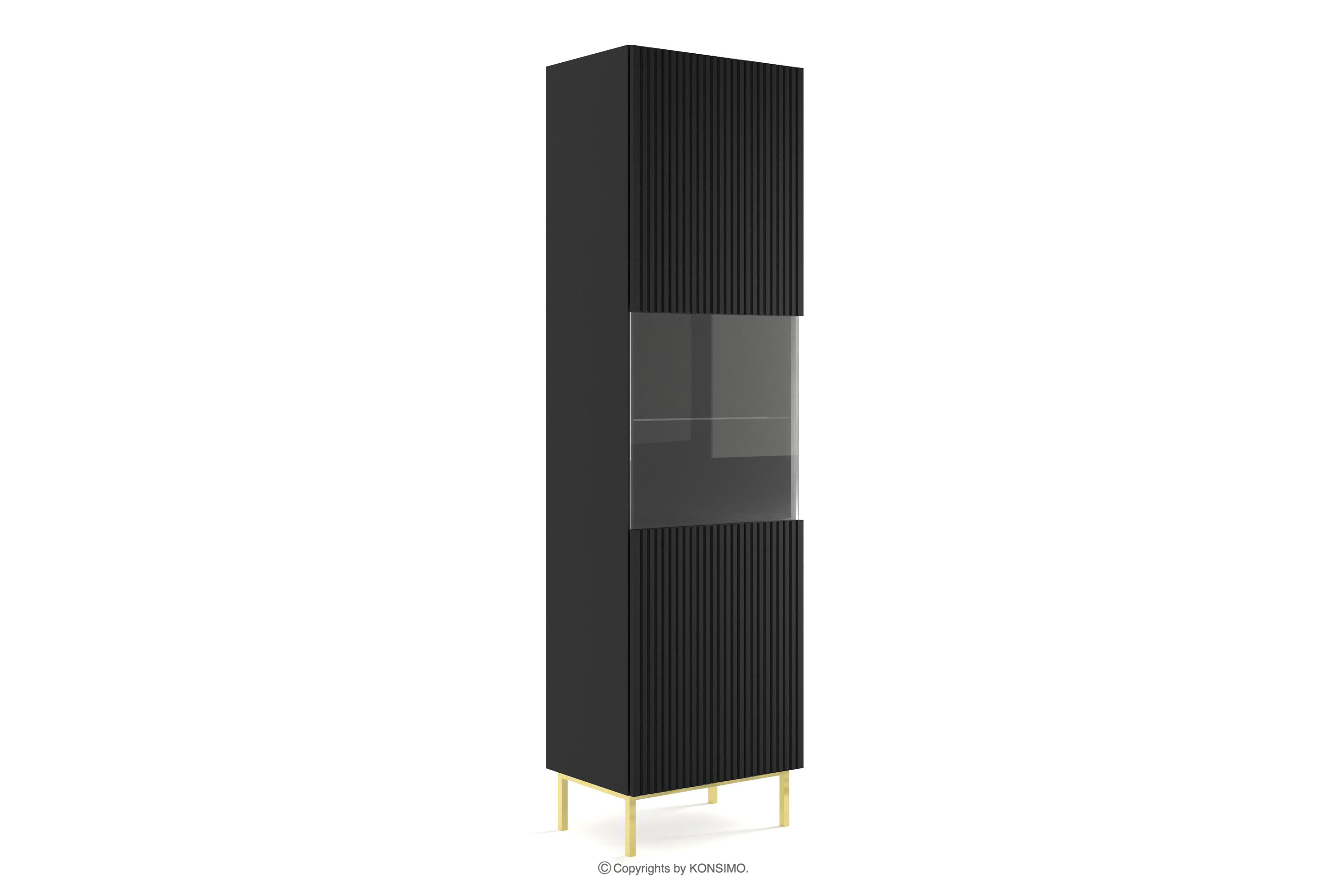 Čierna vitrína na vysokých zlatých nožičkách je kombináciou výnimočného dizajnu, solídneho spracovania a funkčnosti. Bola vytvorená pre ľudí, ktorí si cenia estetiku a pohodlie pri každodennom používaní. Jednoduché, minimalistické formy obohatené o jemné detaily sú v súlade s najnovšími interiérovými trendmi, vďaka čomu harmonicky zapadnú do rôznych aranžmánov. Tento nábytok je vynikajúcou voľbou pre každého, kto si chce vytvoriť moderný a zároveň útulný interiér, kde pohodlie a štýl idú ruka v ruke.