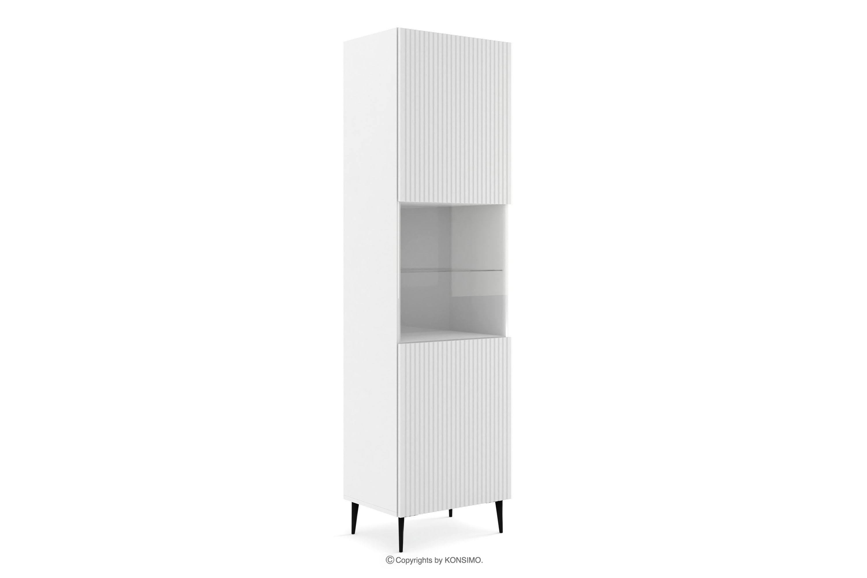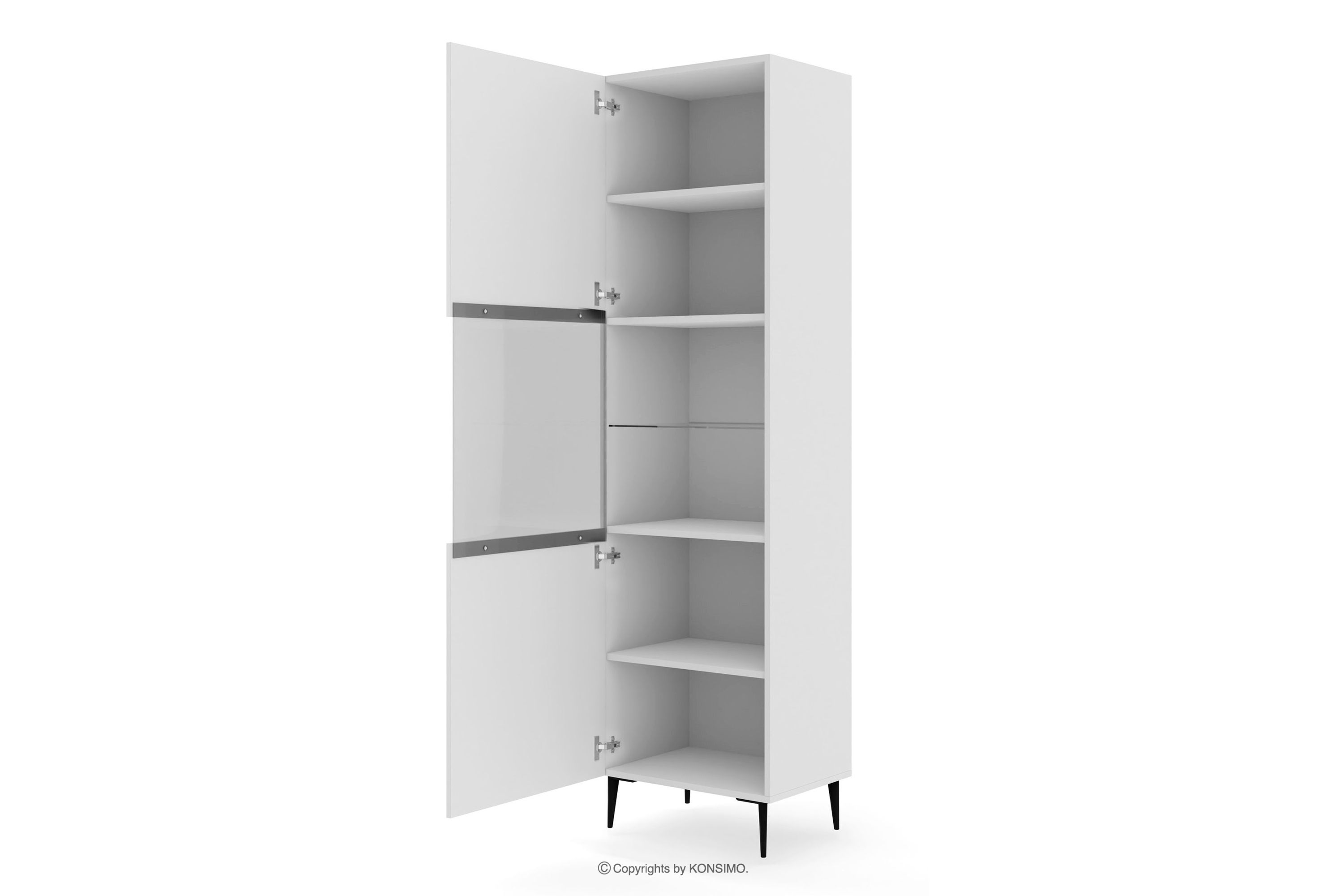 Vitrína na vysokých čiernych nohách bielej farby je kombináciou výnimočného dizajnu, solídneho spracovania a funkčnosti. Boli vytvorené pre ľudí, ktorí si cenia estetiku a pohodlie pri každodennom používaní. Jednoduché, minimalistické formy obohatené o jemné detaily sú v súlade s najnovšími trendmi v interiérovom dizajne, vďaka čomu harmonicky zapadnú do rôznych aranžmánov.