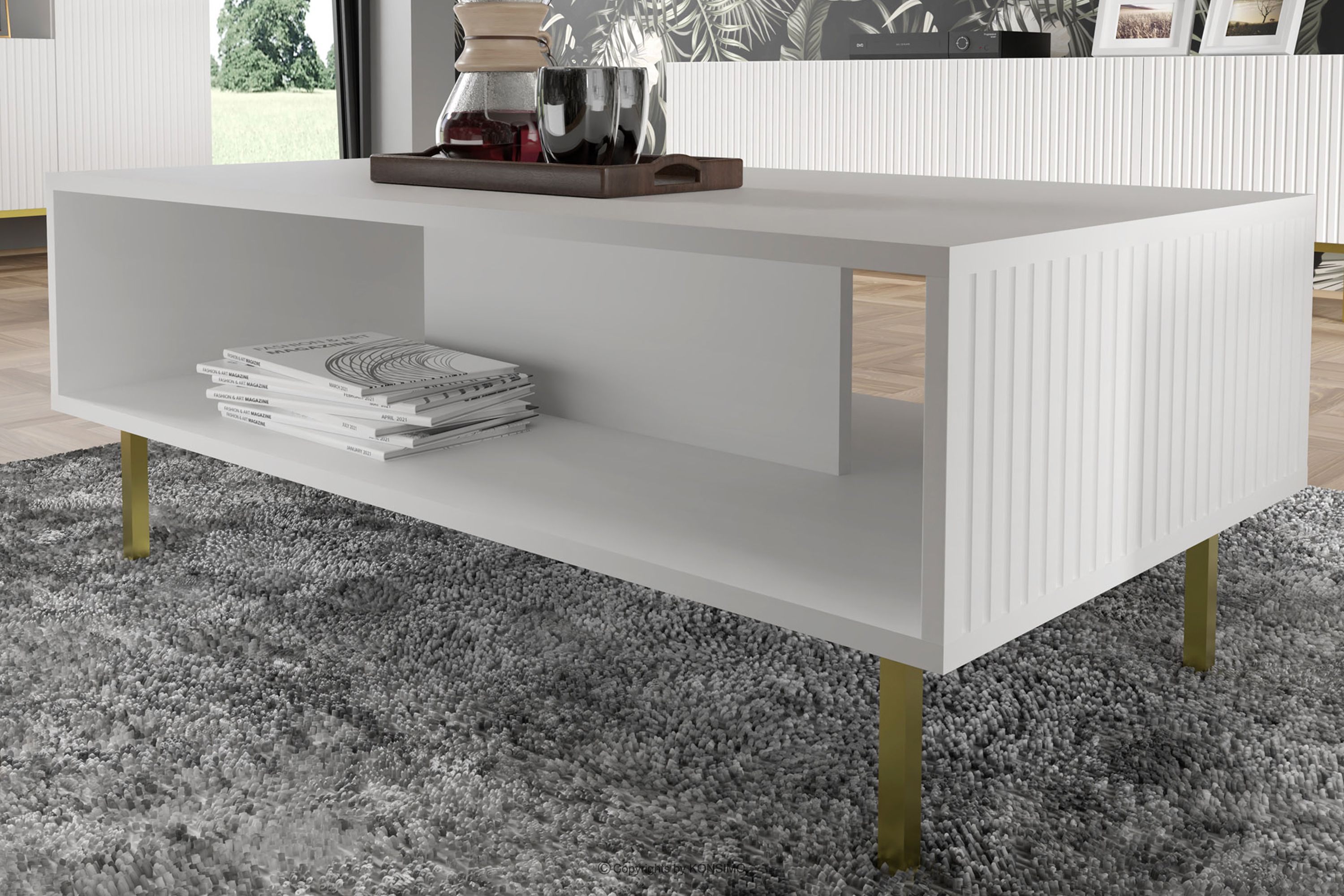 Biely konferenčný stolík na zlatých nohách je kombináciou výnimočného dizajnu, solídneho spracovania a funkčnosti. Bol vytvorený pre ľudí, ktorí si cenia estetiku a pohodlie pri každodennom používaní. Jednoduché, minimalistické formy obohatené o jemné detaily sú v súlade s najnovšími trendmi v interiérovom dizajne, vďaka čomu harmonicky zapadnú do rôznych aranžmánov. Tento nábytok je vynikajúcou voľbou pre každého, kto si chce vytvoriť moderný a zároveň útulný interiér, kde pohodlie a štýl idú ruka v ruke.