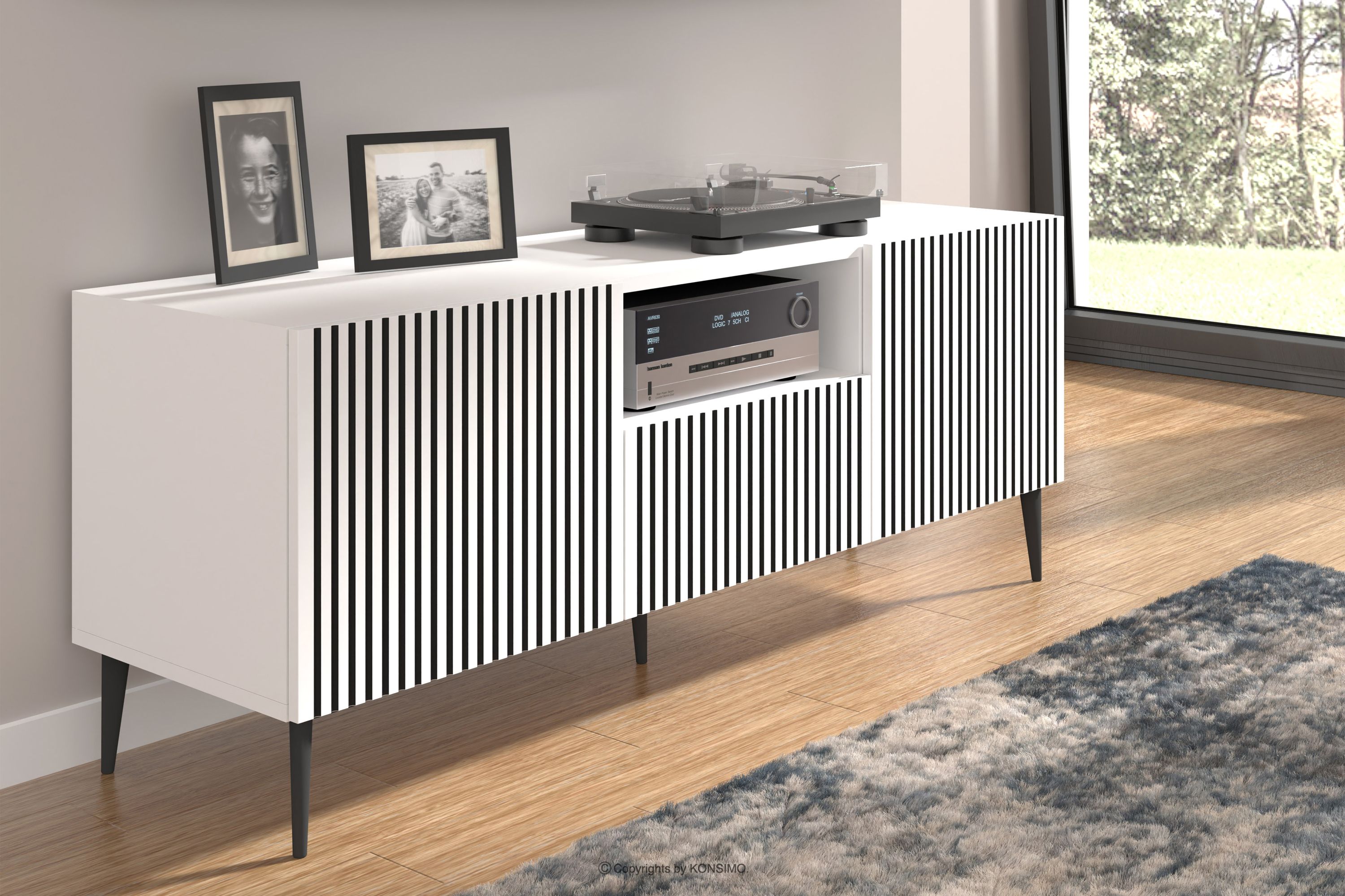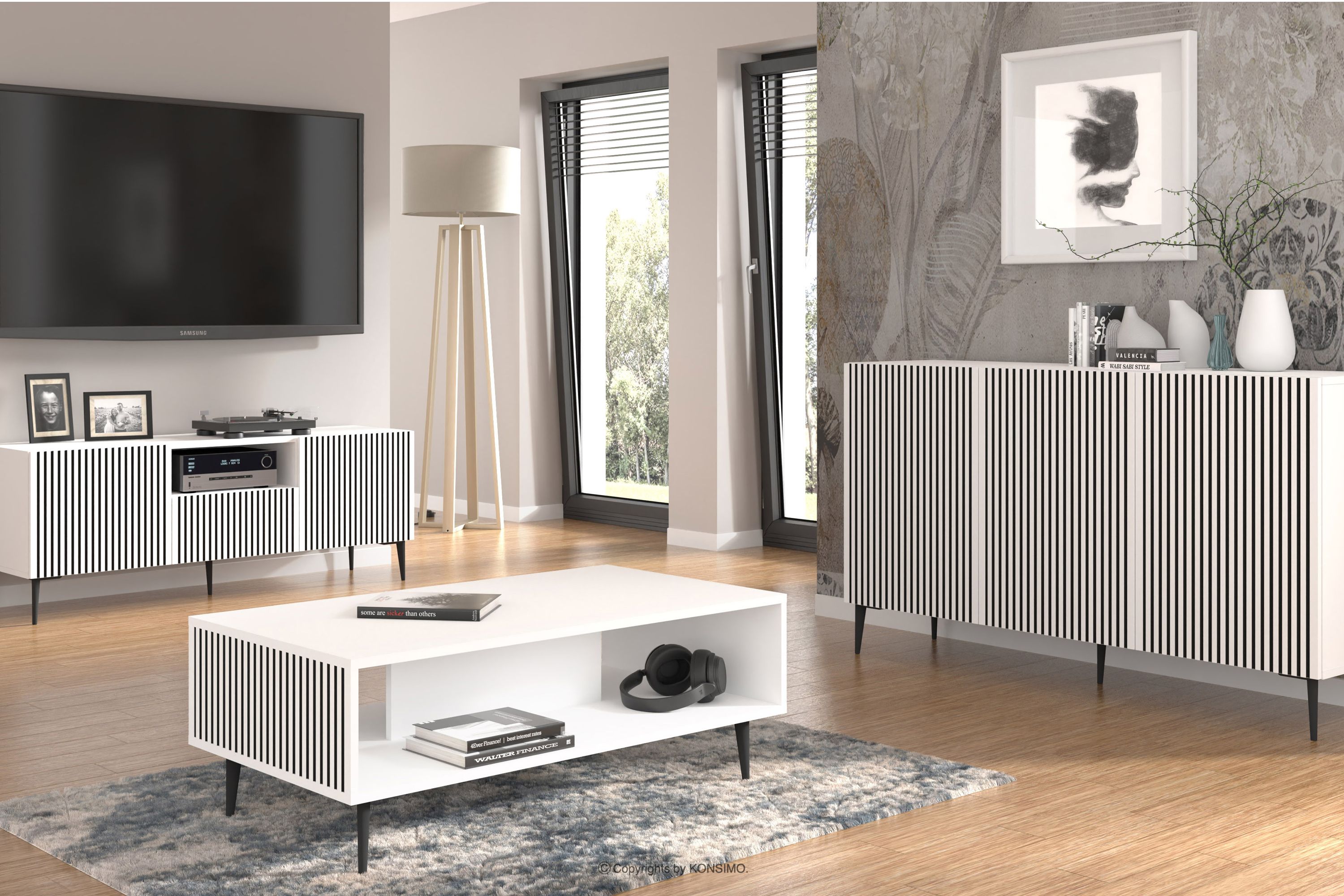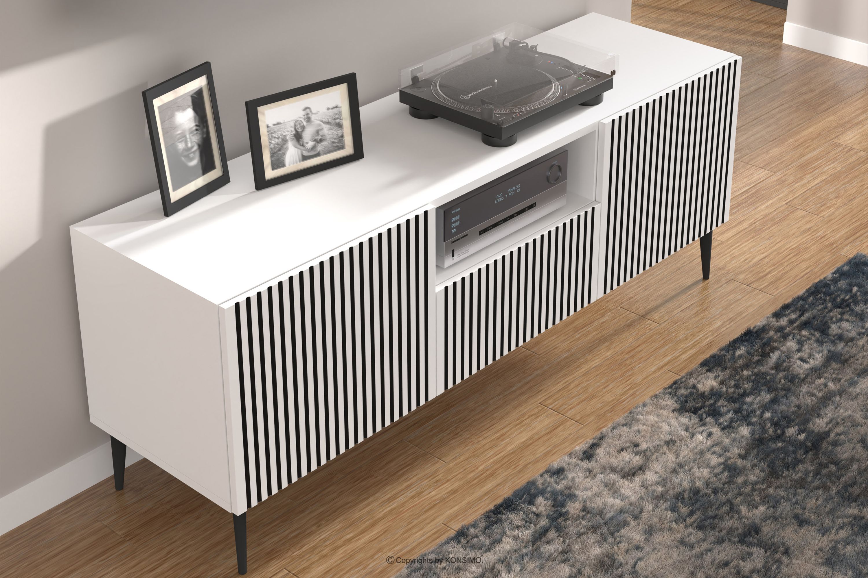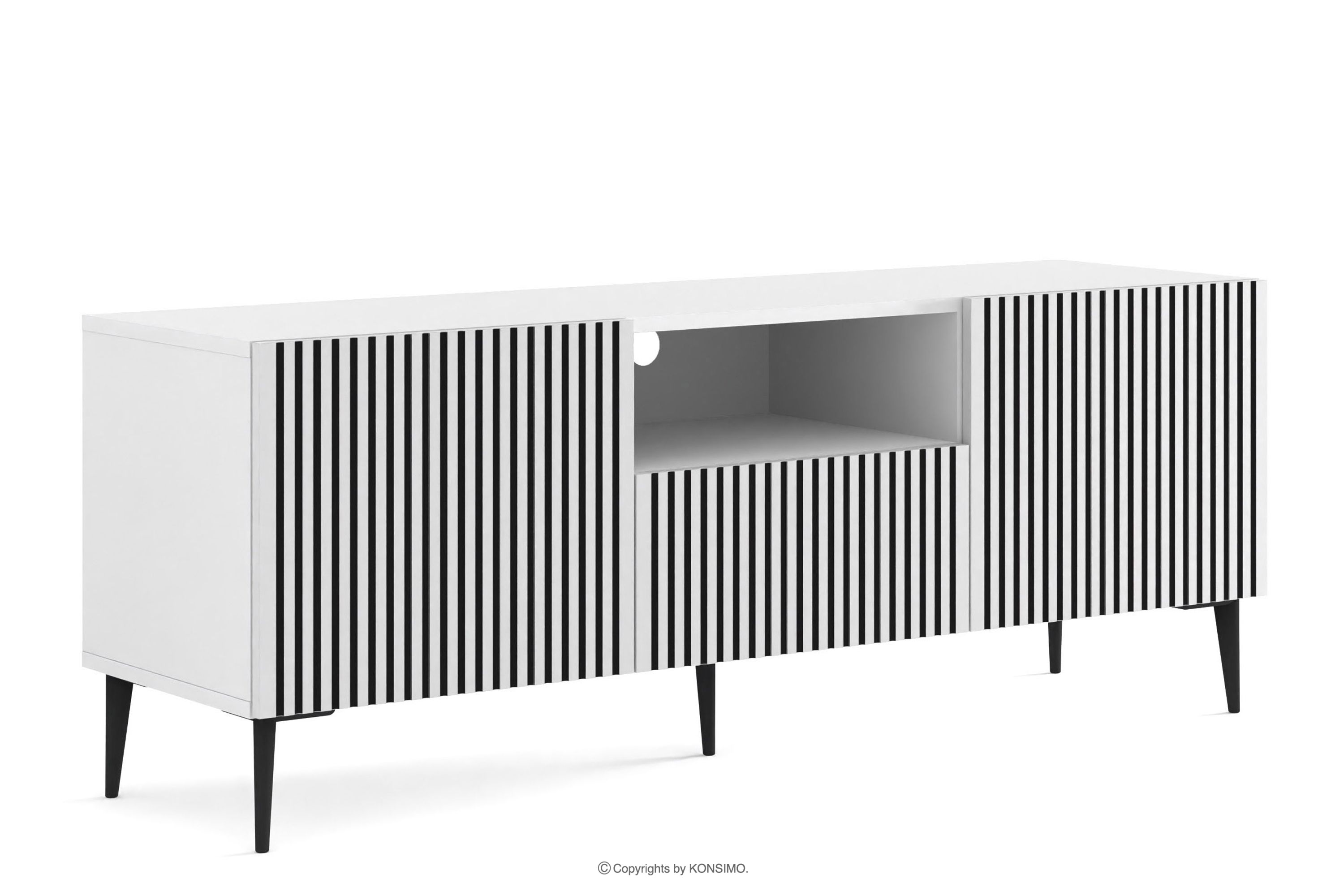 RTV skrinka na nožičkách modern s lamelami biela/čierna je kombináciou výnimočného dizajnu, solídneho spracovania a funkčnosti. Boli vytvorené pre ľudí, ktorí si cenia estetiku a pohodlie pri každodennom používaní. Jednoduché, minimalistické formy obohatené o jemné detaily zapadajú do najnovších trendov interiérového dizajnu, vďaka čomu harmonicky zapadajú do rôznych aranžmánov. Tento nábytok je vynikajúcou voľbou pre každého, kto si chce vytvoriť moderný a zároveň útulný interiér, kde pohodlie a štýl idú ruka v ruke.