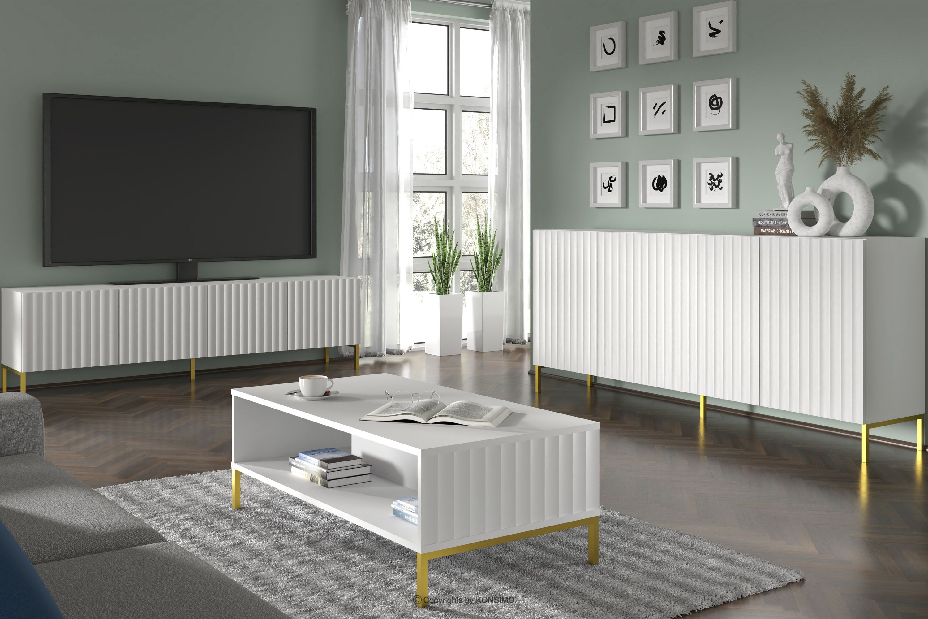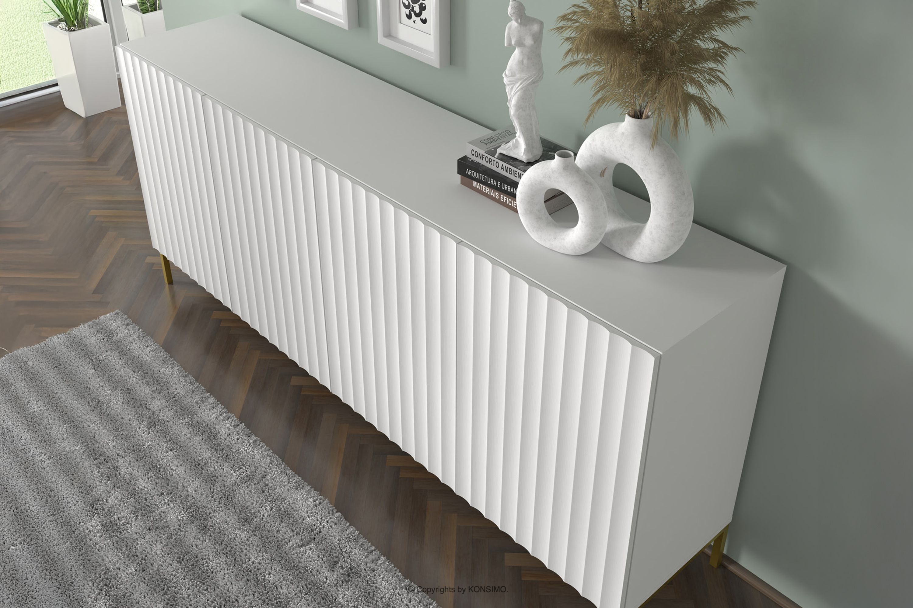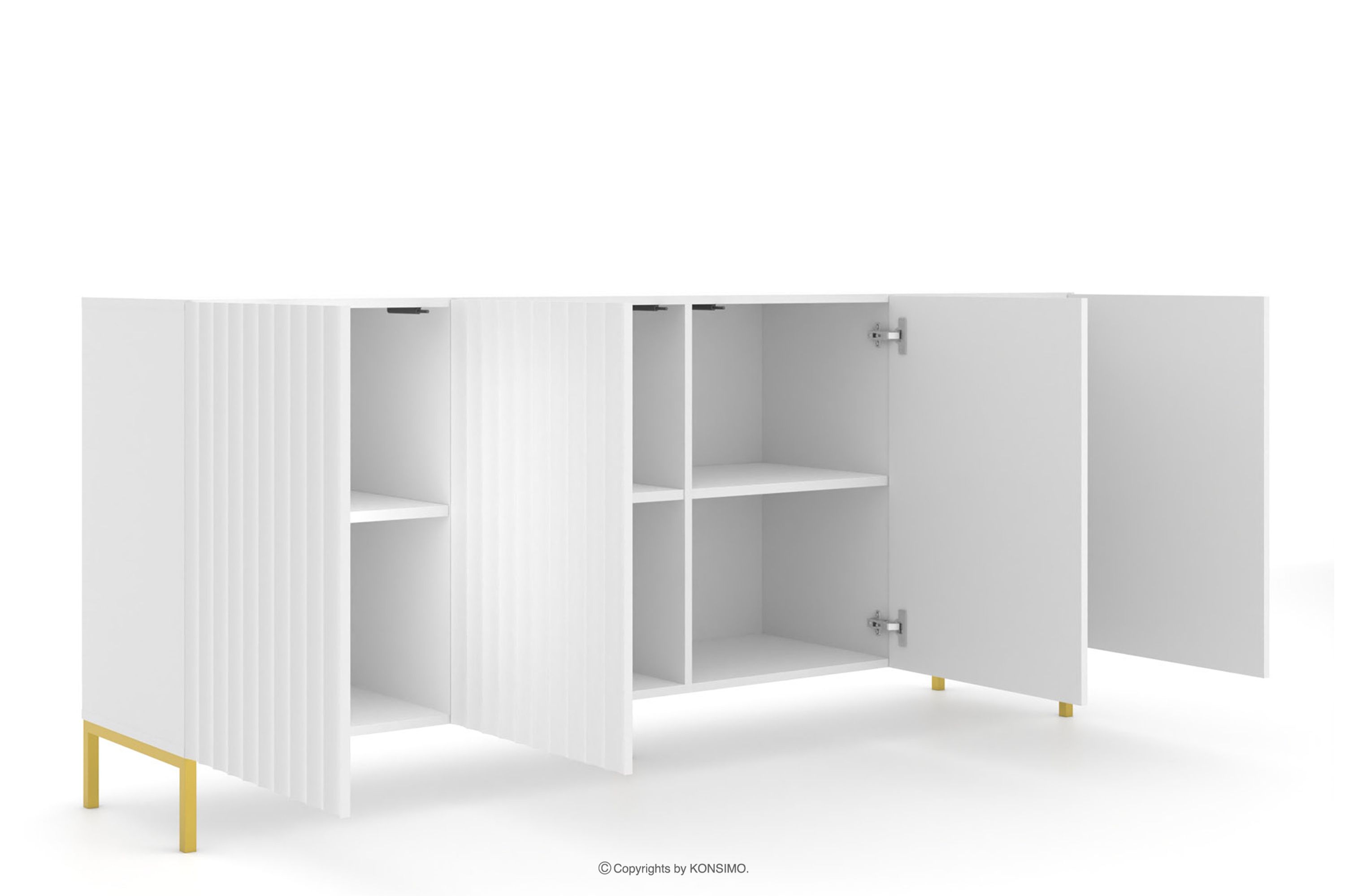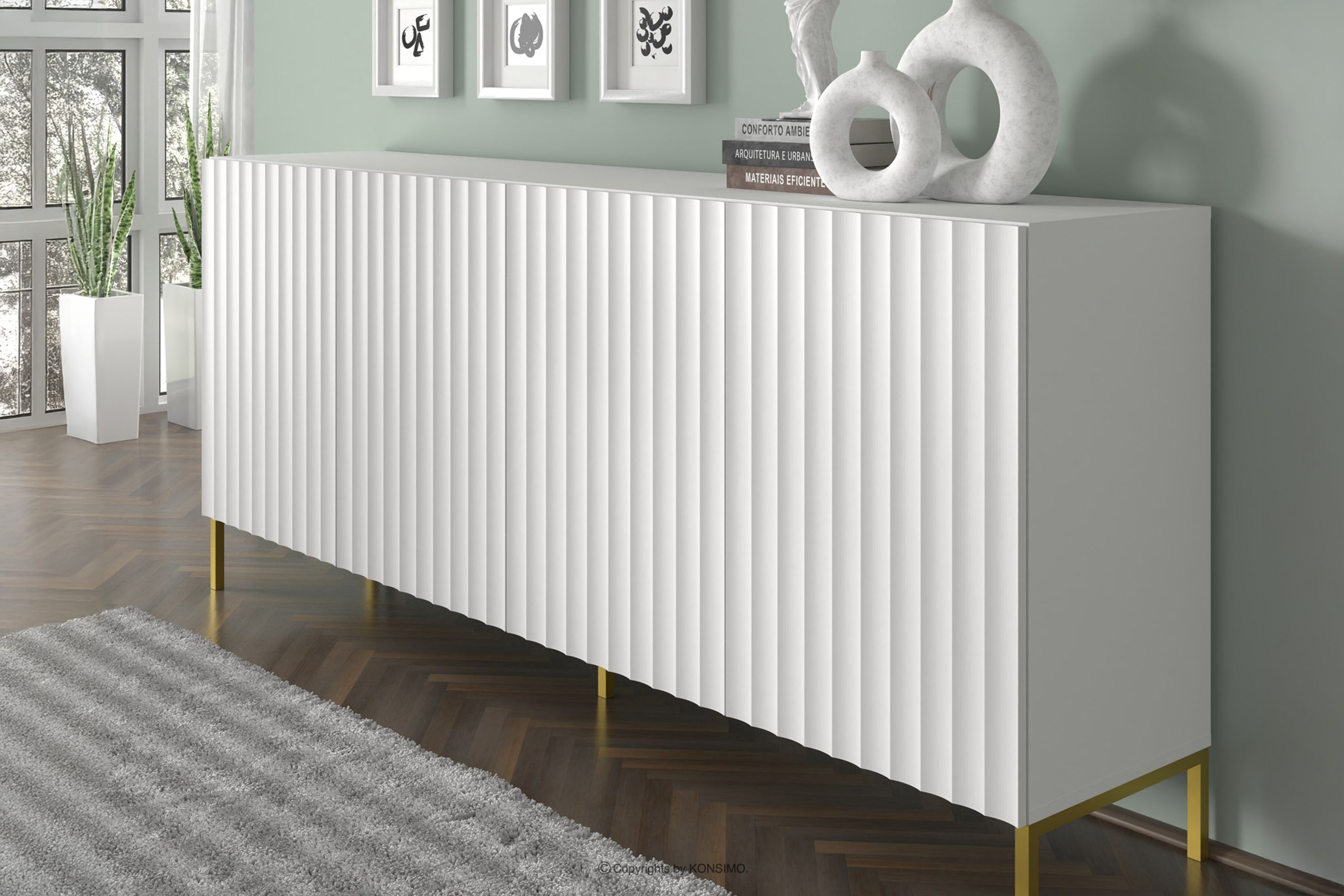 Veľká komoda na zlatých nožičkách bielej farby je kombináciou výnimočného dizajnu, solídneho spracovania a funkčnosti. Boli vytvorené pre ľudí, ktorí si cenia estetiku a pohodlie pri každodennom používaní. Jednoduché, minimalistické formy obohatené o jemné detaily sú v súlade s najnovšími interiérovými trendmi, vďaka čomu harmonicky zapadnú do rôznych aranžmánov. Tento nábytok je vynikajúcou voľbou pre každého, kto si chce vytvoriť moderný a zároveň útulný interiér, kde pohodlie a štýl idú ruka v ruke.