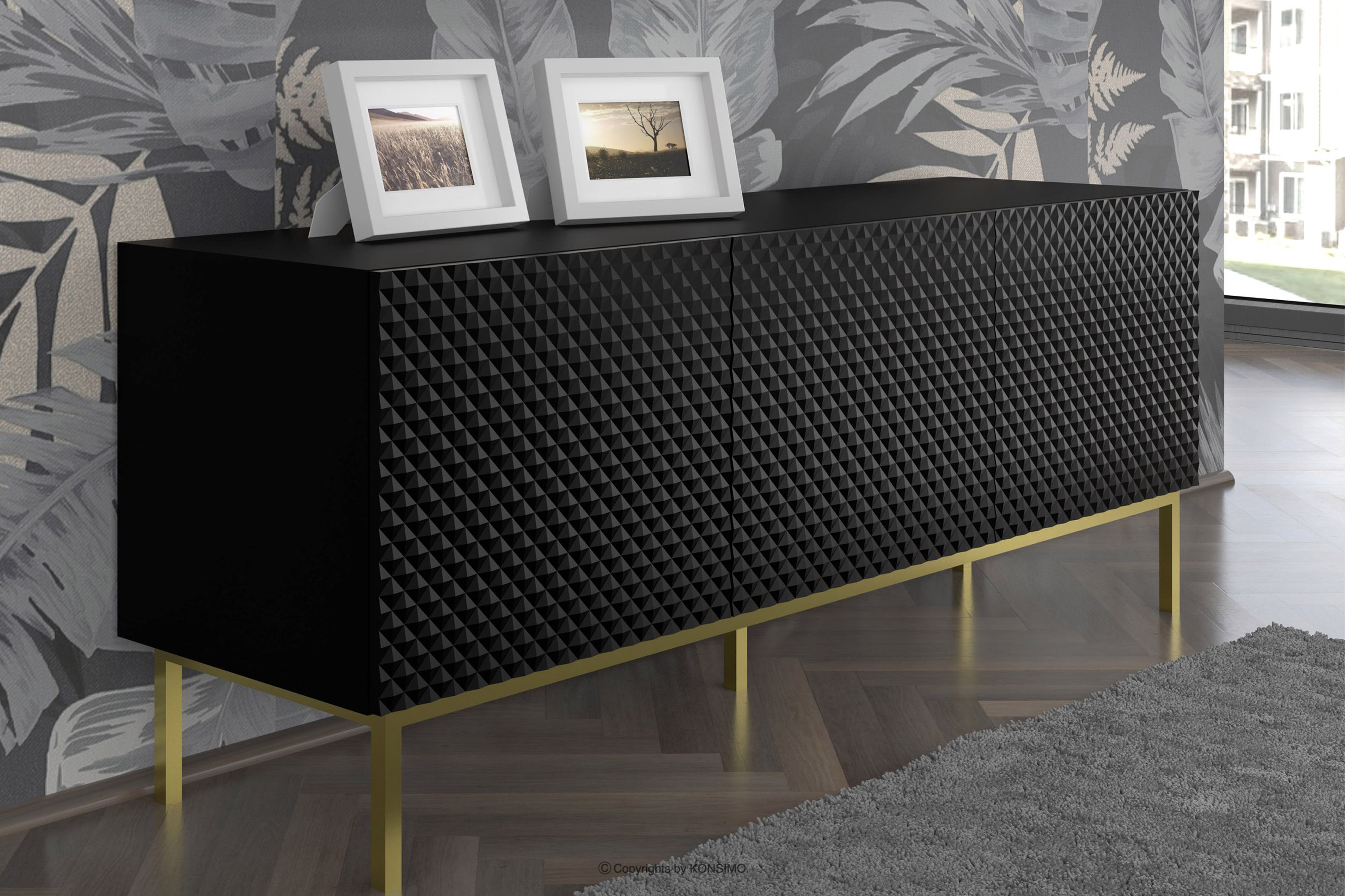 Skriňa RTV na zlatých nožičkách čiernej farby je kombináciou výnimočného dizajnu, solídneho spracovania a funkčnosti. Bola vytvorená pre ľudí, ktorí si cenia estetiku a pohodlie pri každodennom používaní. Jednoduché, minimalistické formy obohatené o jemné detaily sú v súlade s najnovšími trendmi v interiérovom dizajne, vďaka čomu harmonicky zapadajú do rôznych aranžmánov.