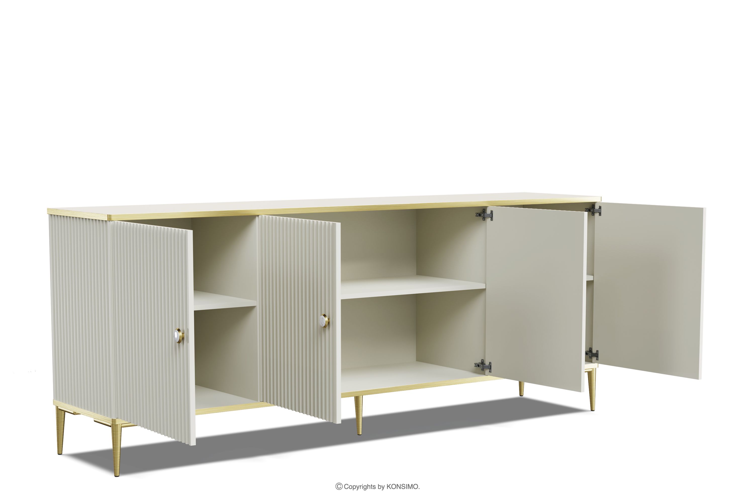 Veľká široká komoda Glamourcream je kombináciou výnimočného dizajnu, solídneho spracovania a funkčnosti. Boli vytvorené pre ľudí, ktorí si cenia estetiku a pohodlie pri každodennom používaní. Jednoduché, minimalistické formy obohatené o jemné detaily sú v súlade s najnovšími interiérovými trendmi, vďaka čomu harmonicky zapadnú do rôznych aranžmánov. Tento nábytok je vynikajúcou voľbou pre každého, kto si chce vytvoriť moderný a zároveň útulný interiér, kde pohodlie a štýl idú ruka v ruke.