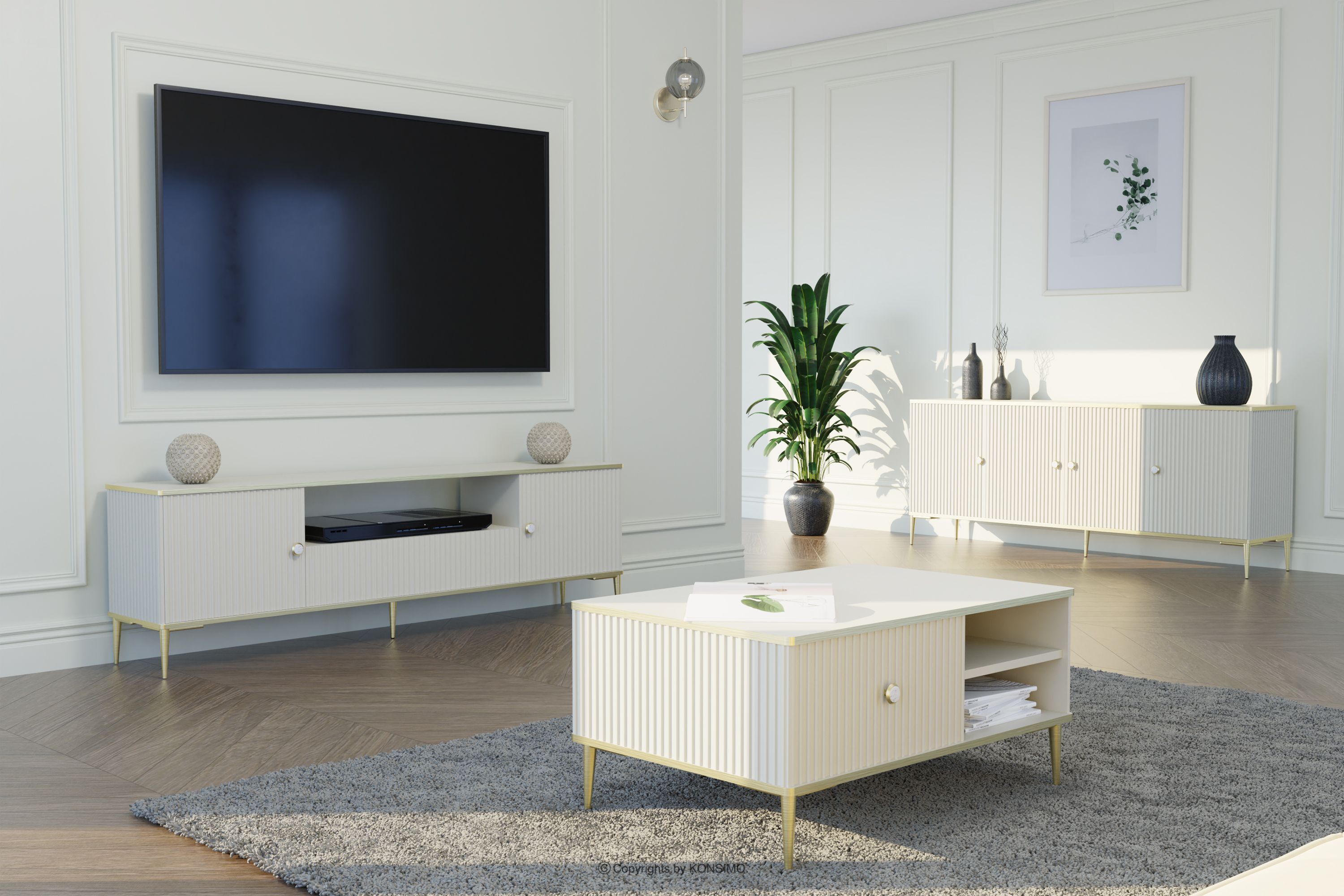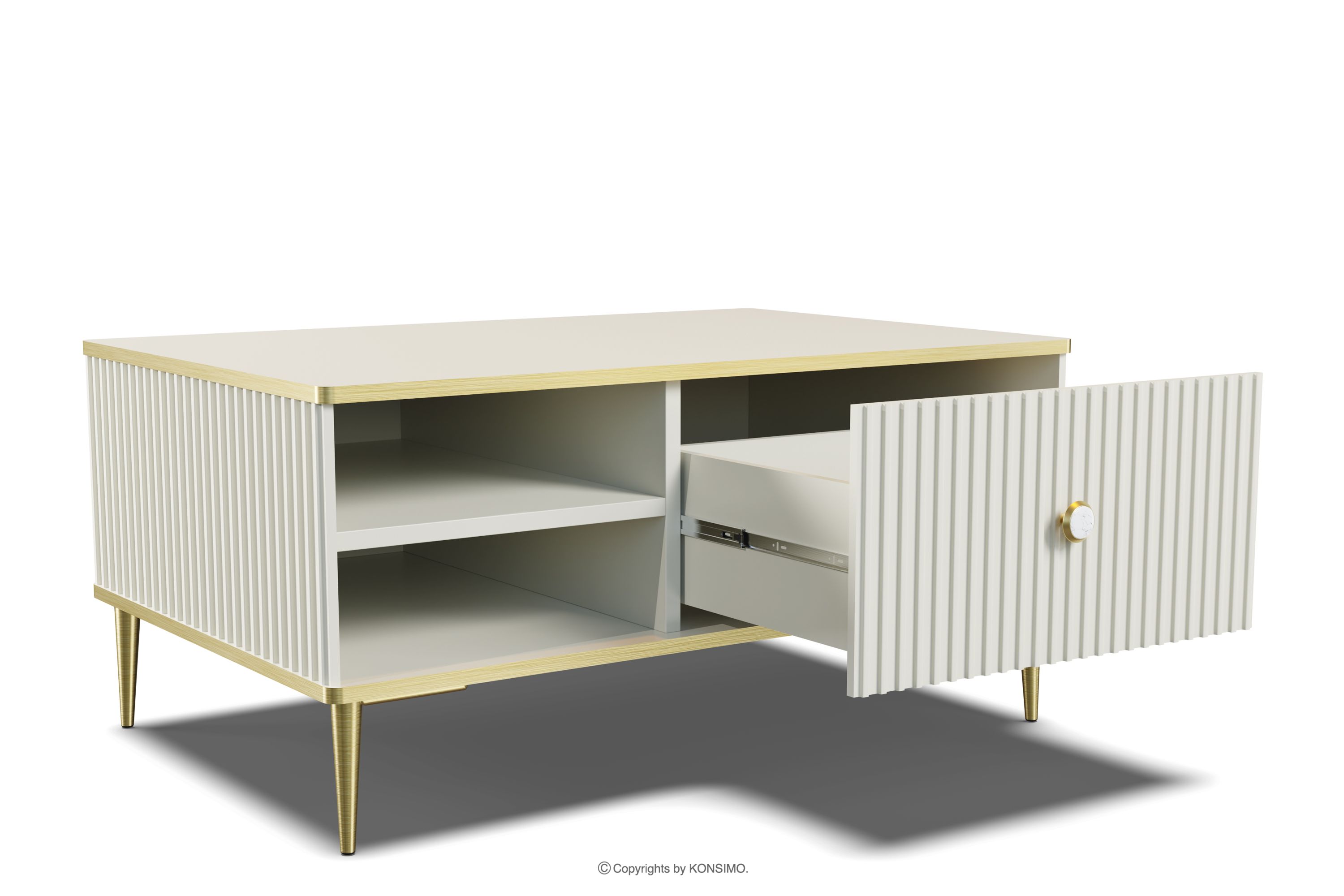 Konferenčný stolík v štýle glamour na zlatých krémových nohách je kombináciou výnimočného dizajnu, solídneho spracovania a funkčnosti. Boli vytvorené pre ľudí, ktorí si cenia estetiku a pohodlie pri každodennom používaní. Jednoduché, minimalistické formy obohatené o jemné detaily zapadajú do najnovších trendov interiérového dizajnu, vďaka čomu harmonicky zapadnú do rôznych aranžmánov. Tento nábytok je vynikajúcou voľbou pre každého, kto si chce vytvoriť moderný a zároveň útulný interiér, kde pohodlie a štýl idú ruka v ruke.