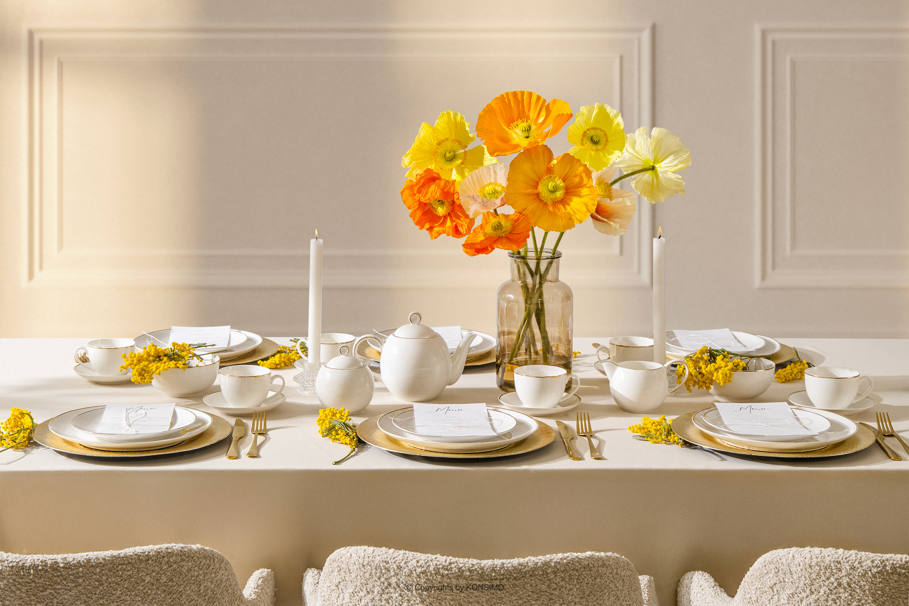 Jedálenská súprava z tvrdého porcelánu ecru/zlatá 6 osôb (24 ks) - klasika, elegancia a výnimočná odolnosť. Naša kolekcia je kombináciou klasickej elegancie, spoľahlivej odolnosti a špičkového spracovania. Je ideálnou voľbou pre tých, ktorí oceňujú krásu prestierania a funkčnosť pri každodennom používaní. Teplá, mierne krémová farba riadu sa dokonale kombinuje s rôznorodým stolovaním a hodí sa do klasických aj moderných interiérov.