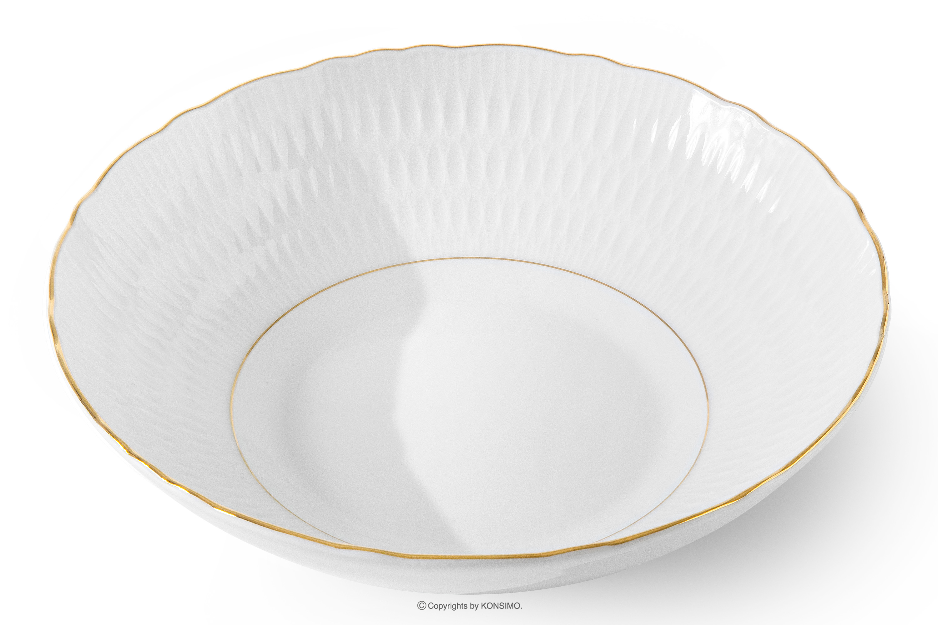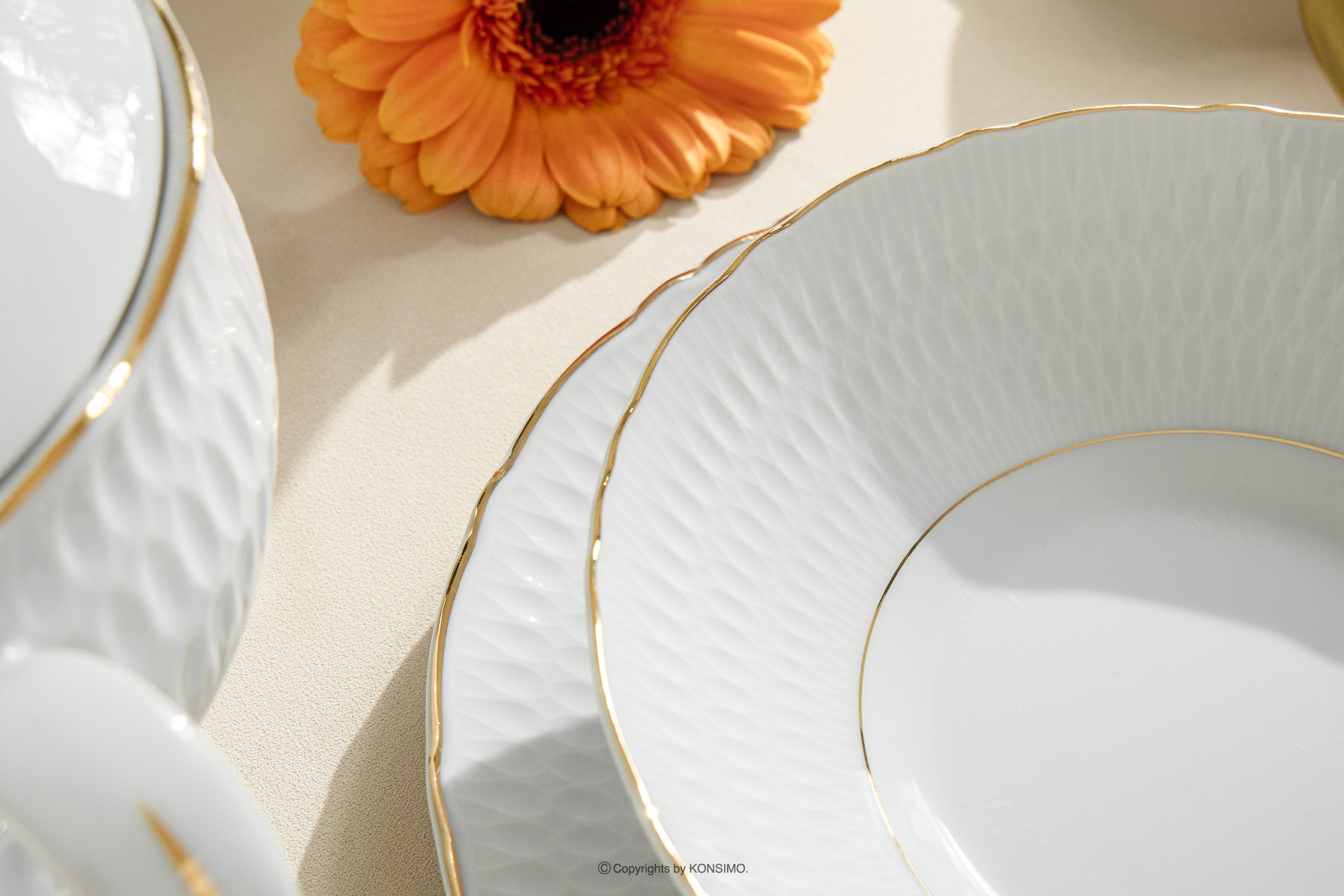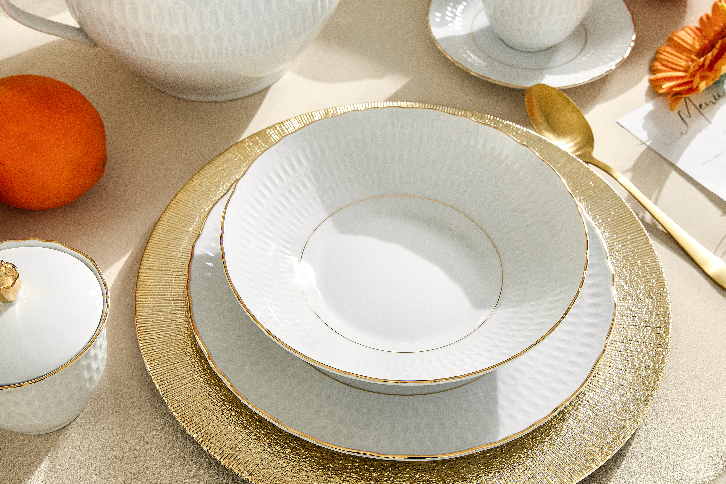 Elegantná porcelánová jedálenská a kávová súprava zlatá línia 6 osôb (30 ks) - vynikajúce spracovanie pre najnáročnejších. Kolekcia prináša do vašej jedálne jemný nádych nadčasovej elegancie a spája sofistikovaný štýl, odolnosť a funkčnosť. Je ideálnou voľbou pre tých, ktorí oceňujú estetiku a kvalitu pri každodennom používaní aj pri výnimočných príležitostiach. Vyniká dokonalou povrchovou úpravou, ktorá podčiarkuje pozornosť venovanú detailom a vďaka ktorej riad vyzerá mimoriadne štýlovo na každom stole.