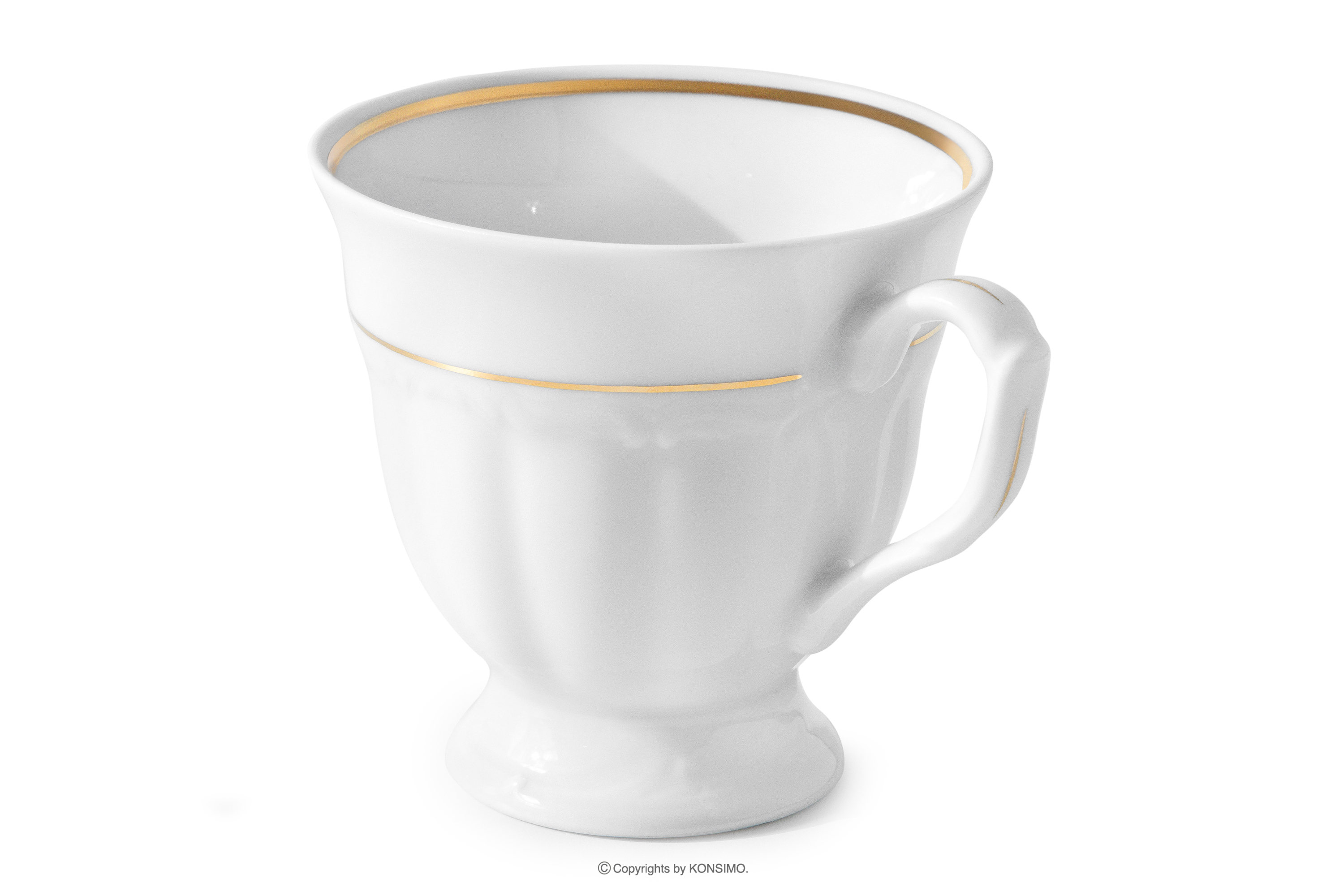 Klasický porcelánový hrnček biela/zlatá línia- dokonalé spracovanie pre náročných používateľov. Vneste do svojej jedálne nádych nadčasovej elegancie s výrobkami z kvalitného porcelánu. Ide o návrh pre ľudí, ktorí oceňujú štýl, trvanlivosť a funkčnosť pri každodennom používaní, ako aj počas výnimočných príležitostí. Kolekcia zaujme klasickým dizajnom, jemným zlatým zdobením, ktoré je ručne maľované, a dokonalou povrchovou úpravou, ktorá dodá šarm každému stolu.