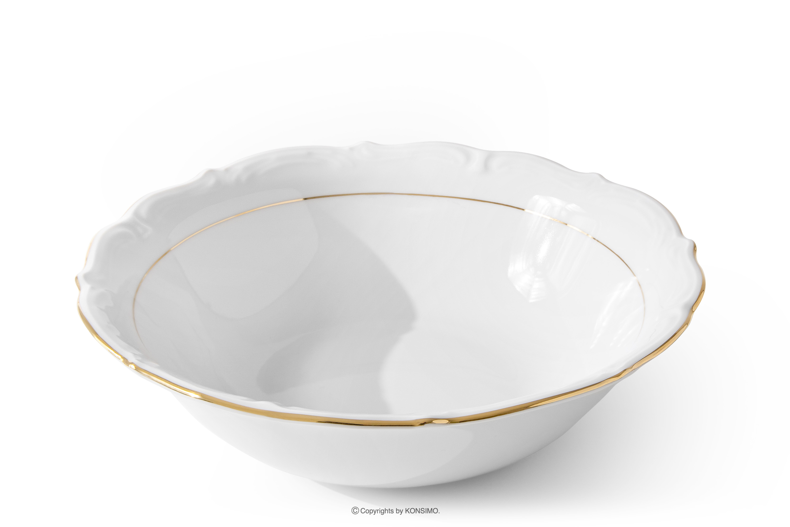 Klasická porcelánová miska biela/zlatá línia- dokonalé spracovanie pre náročných používateľov. Vneste do svojej jedálne nádych nadčasovej elegancie s výrobkami z kvalitného porcelánu. Ide o návrh pre ľudí, ktorí oceňujú štýl, trvanlivosť a funkčnosť pri každodennom používaní, ako aj počas výnimočných príležitostí. Kolekcia zaujme klasickým dizajnom, jemným zlatým zdobením, ktoré je ručne maľované, a dokonalou povrchovou úpravou, ktorá dodá šarm každému stolu.