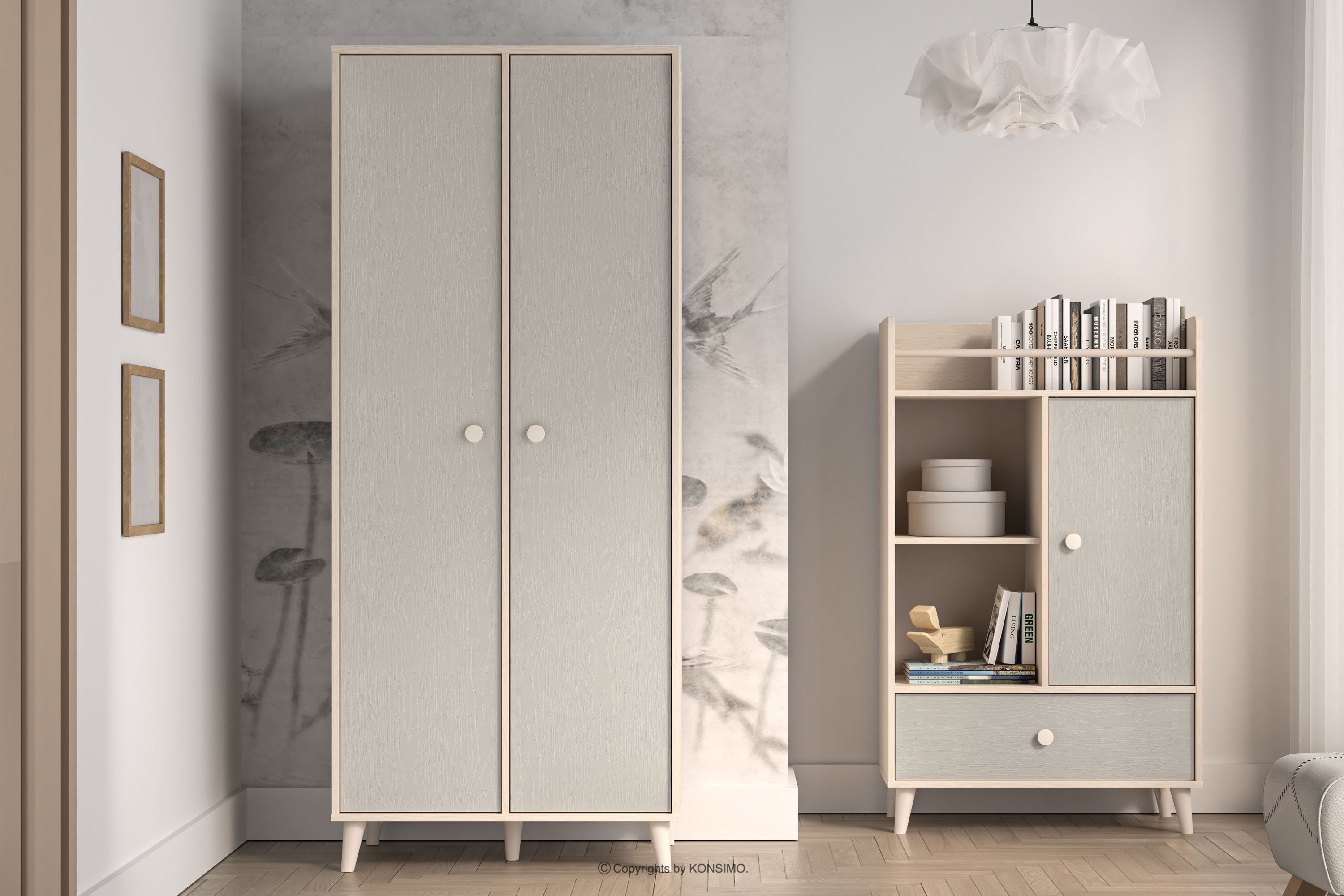 Sivo-béžová šatníková skriňa do detskej izby spája moderný dizajn s najvyššou kvalitou spracovania, čo zaručuje pohodlie a bezpečnosť pri používaní. Vďaka pevným materiálom a prepracovaným detailom je nábytok odolný, funkčný a dokonale vyhovuje potrebám najmenších používateľov. Jemné pastelové farby dodávajú interiéru priateľský, harmonický charakter, vhodný na hru aj odpočinok.