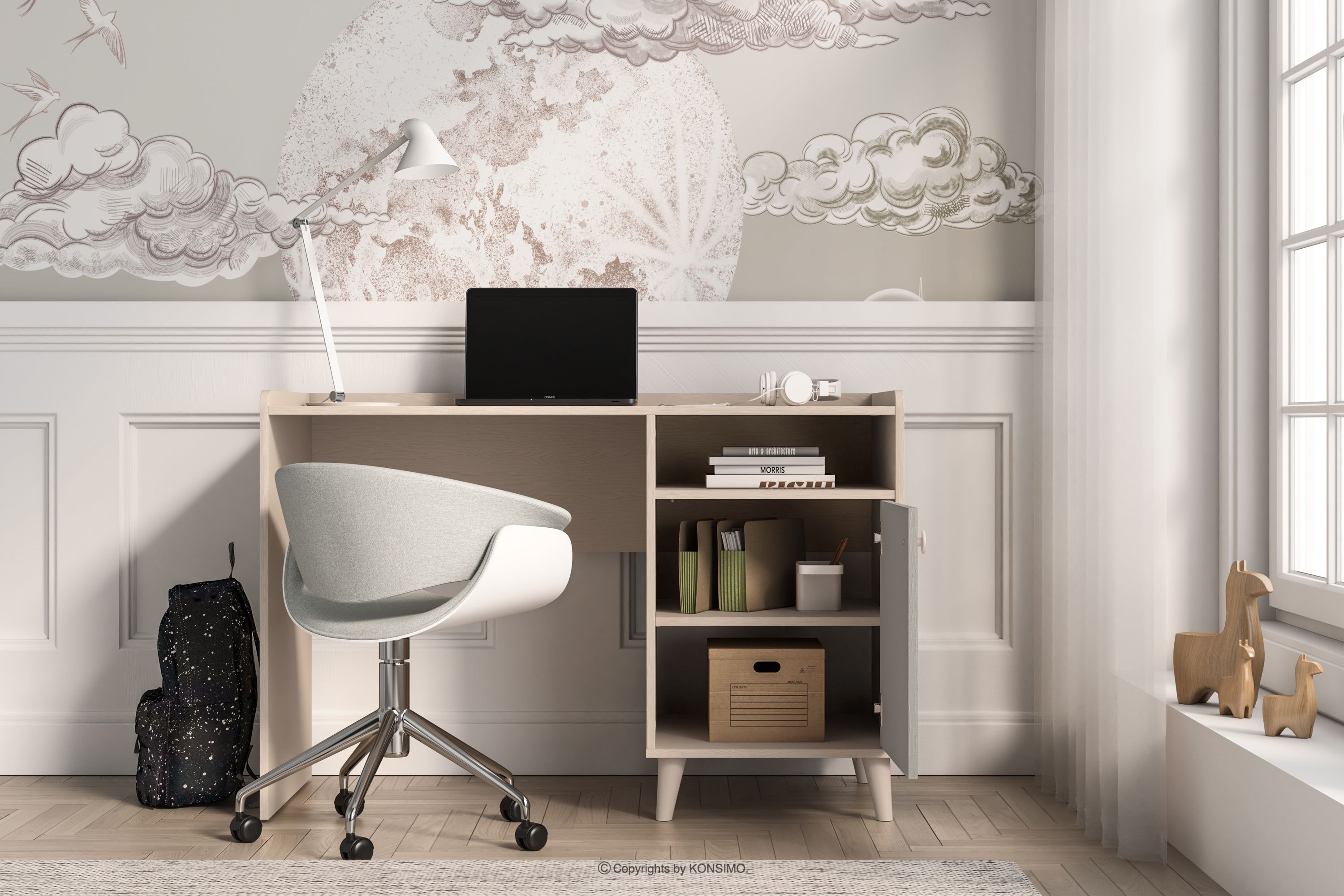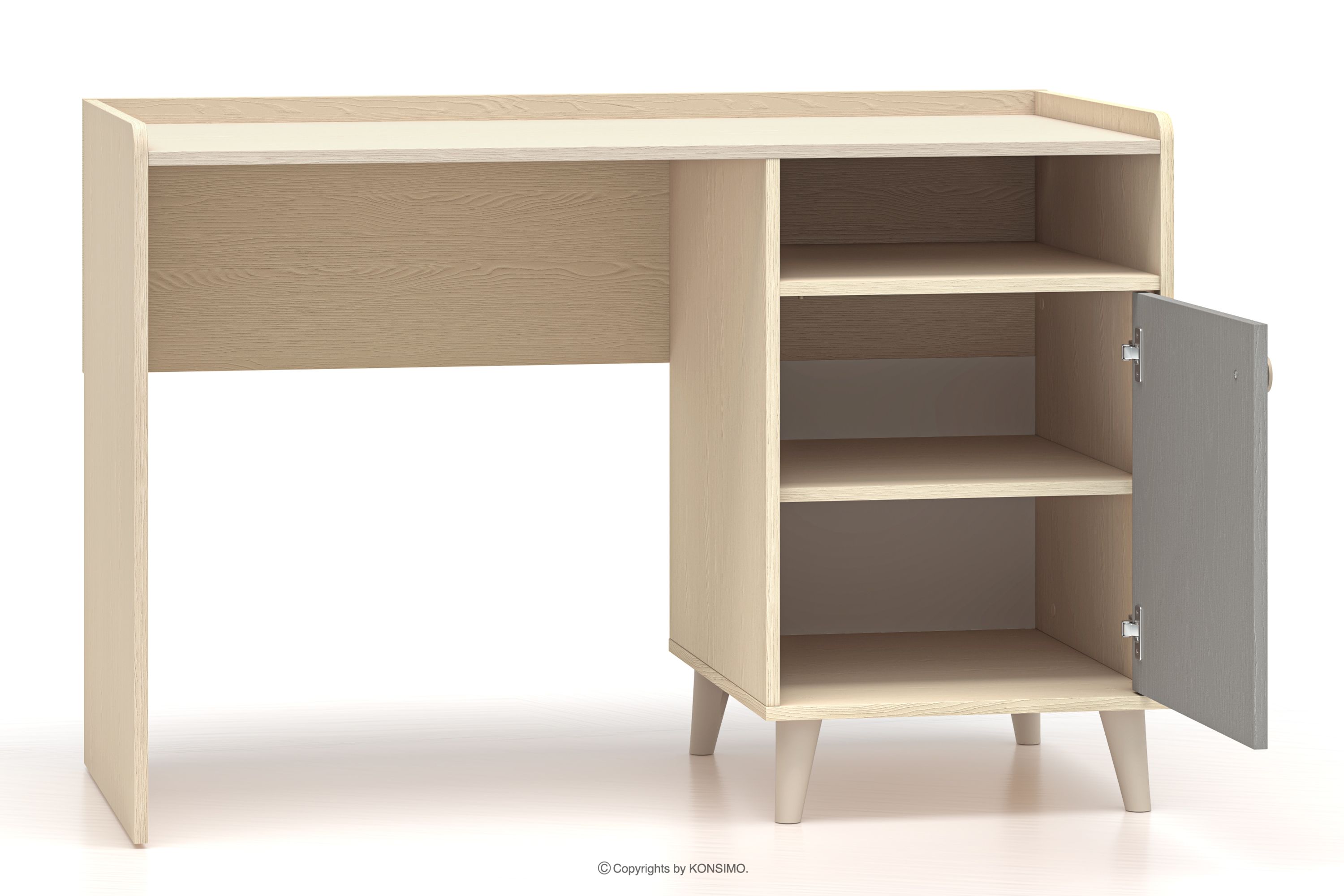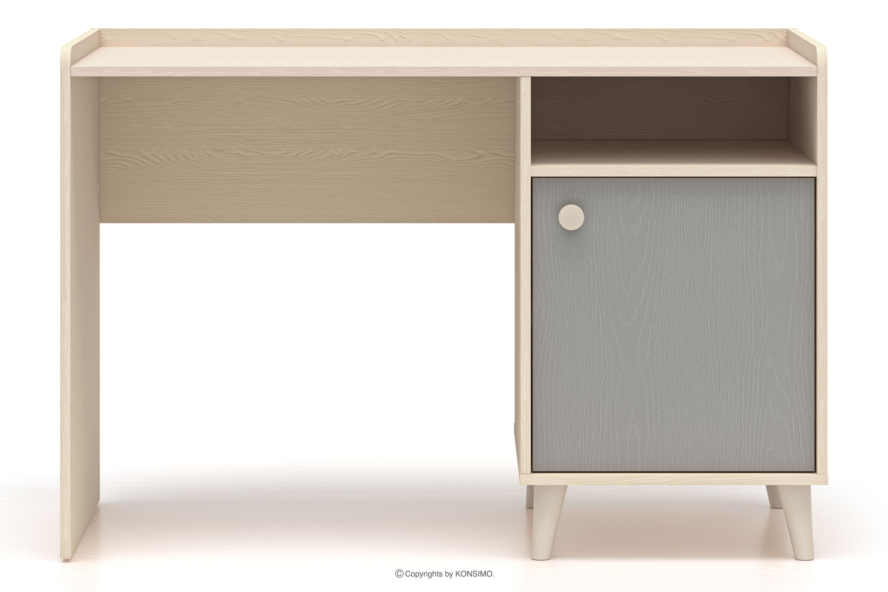 Písací stôl do detskej izby s policami v sivej/béžovej farbe spája moderný dizajn s najvyššou kvalitou spracovania, čo zaručuje pohodlie a bezpečnosť pri používaní. Vďaka pevným materiálom a prepracovaným detailom je nábytok odolný, funkčný a dokonale prispôsobený potrebám najmenších používateľov. Jemné pastelové farby dodávajú interiéru priateľský, harmonický charakter, vhodný na hranie aj odpočinok.