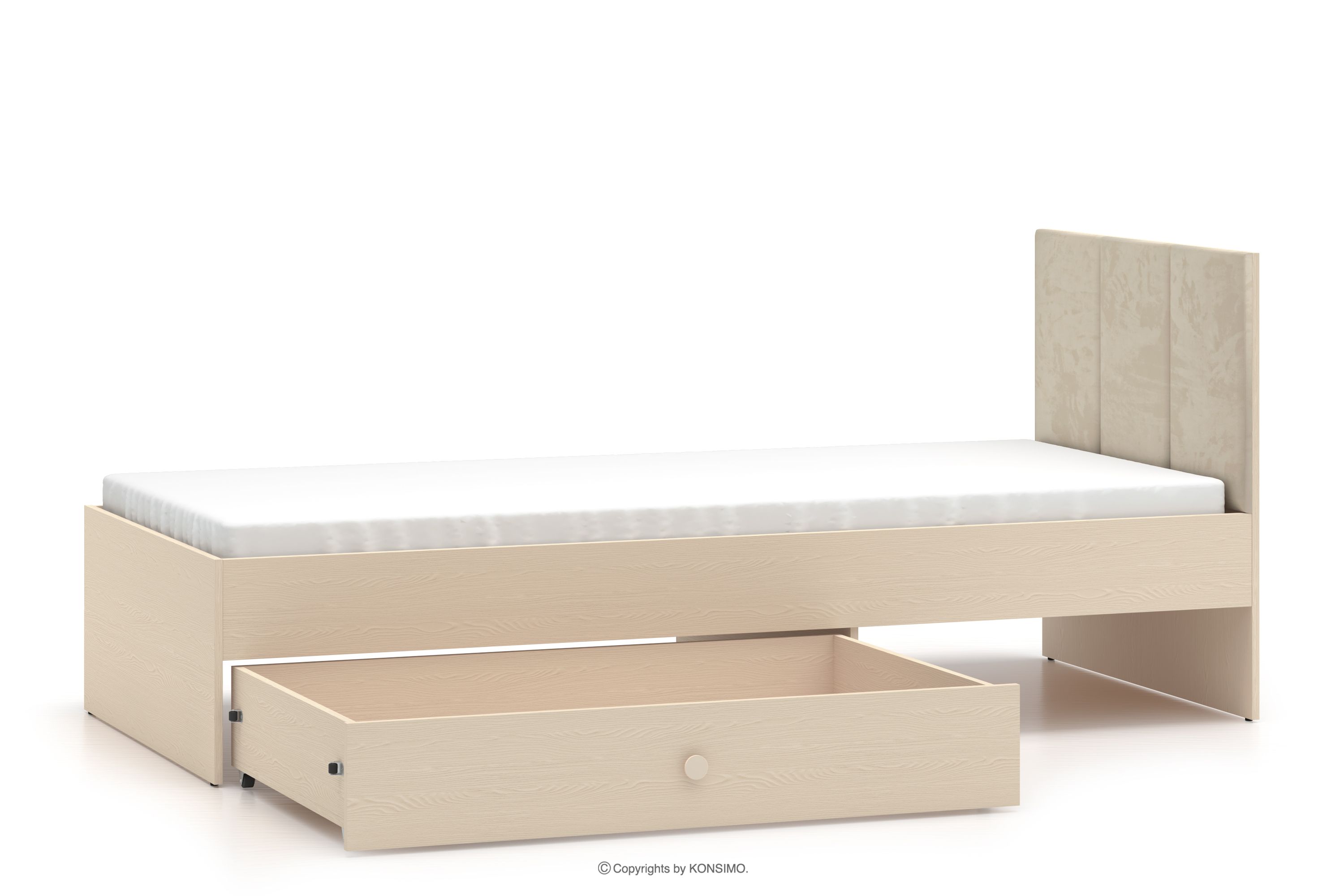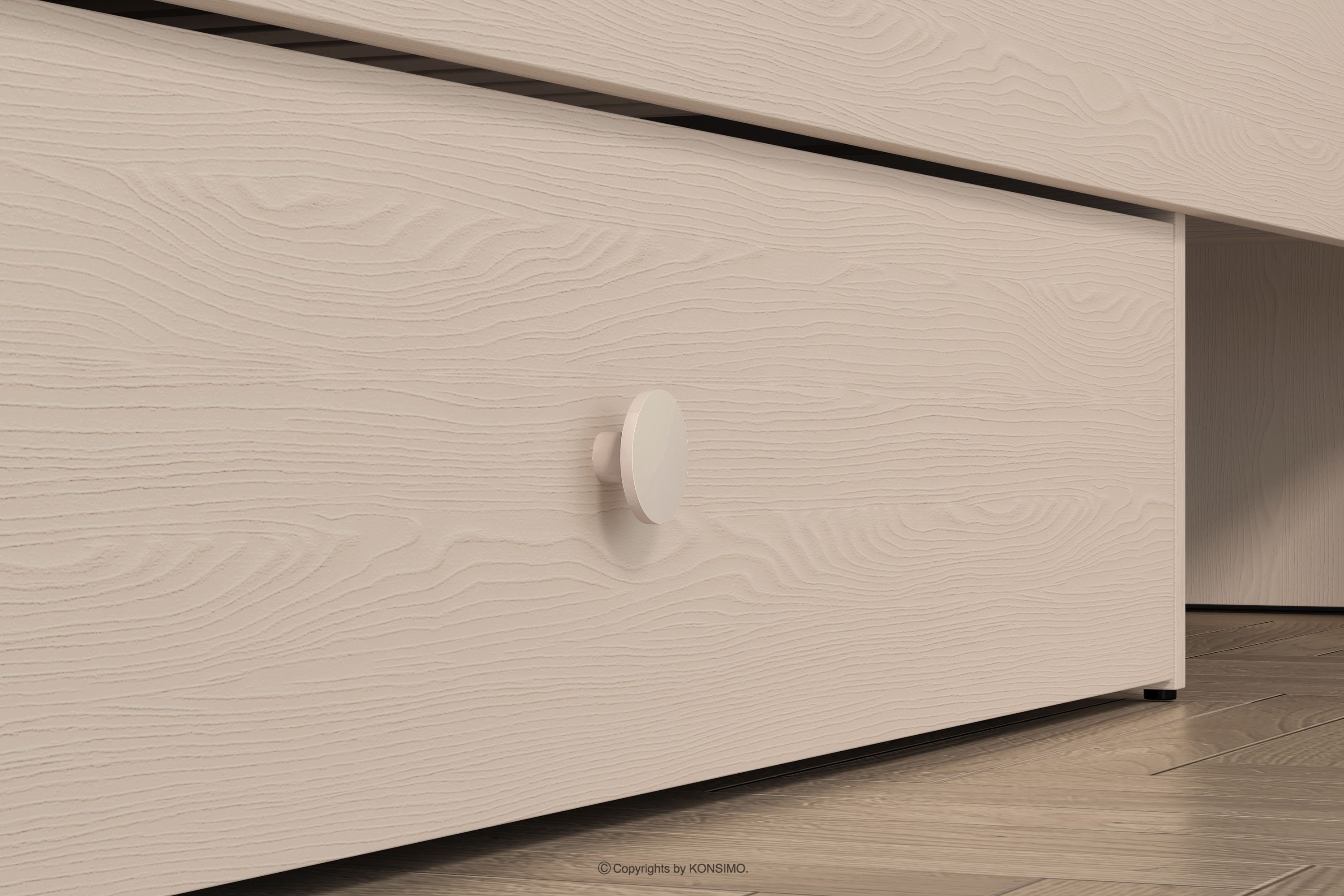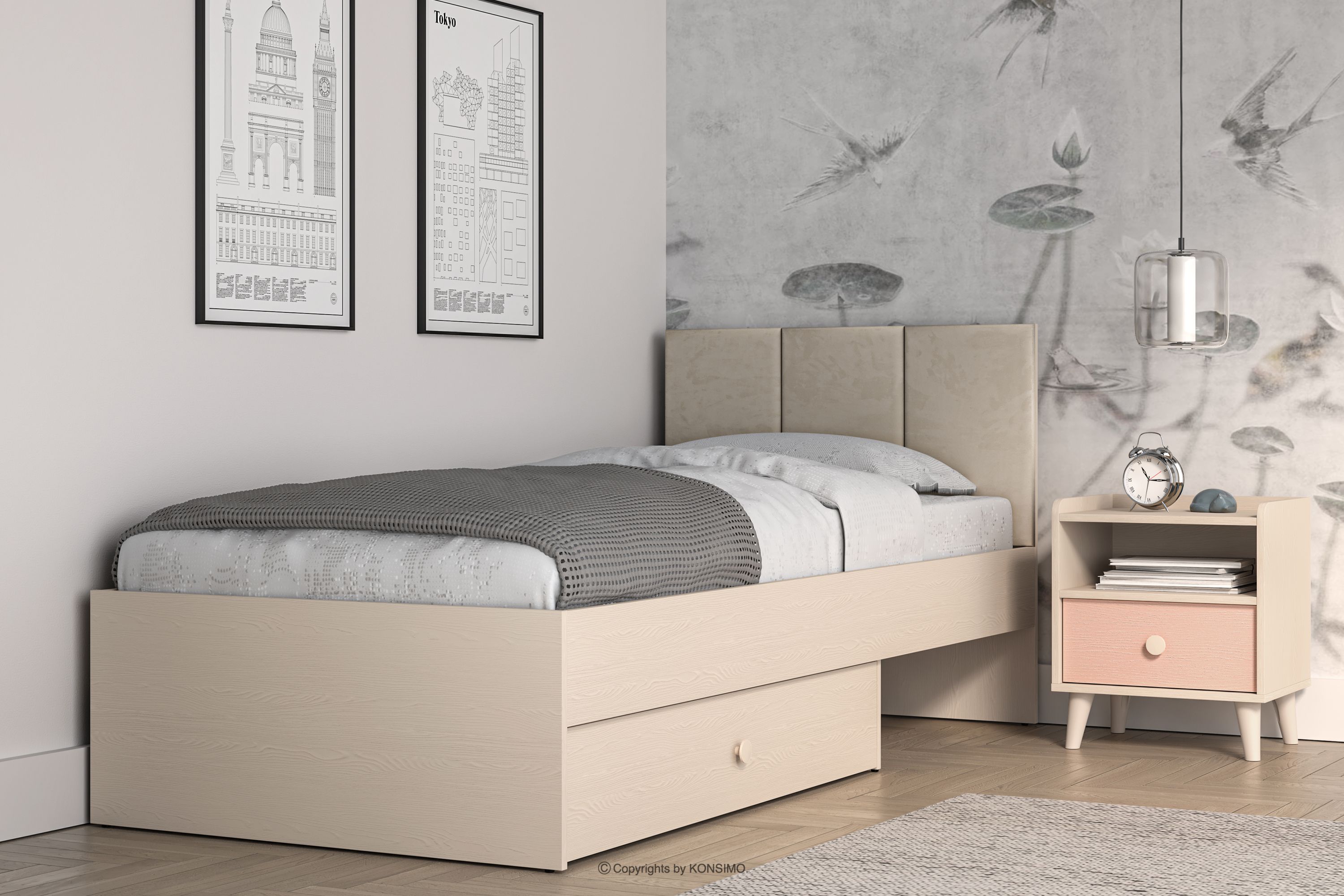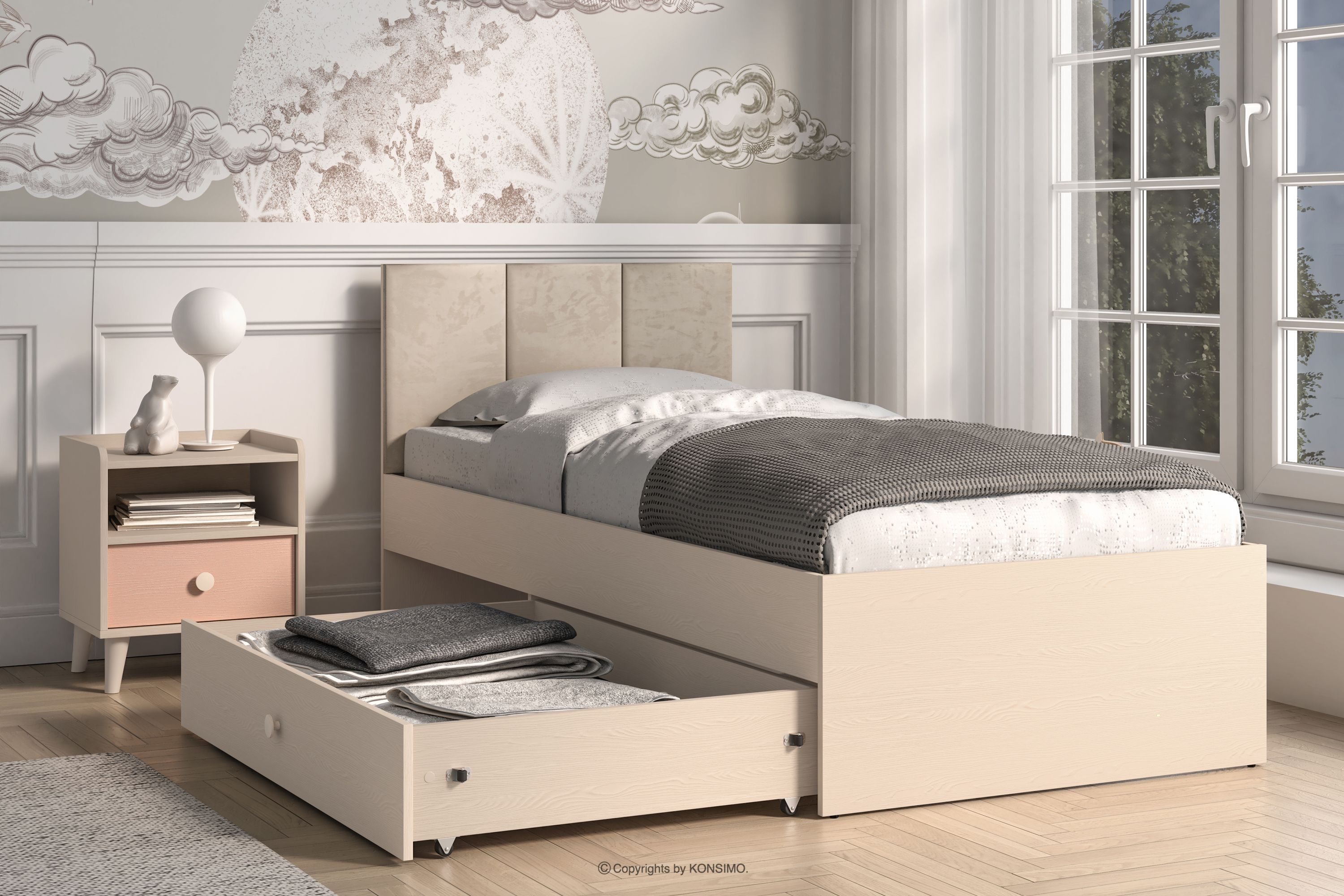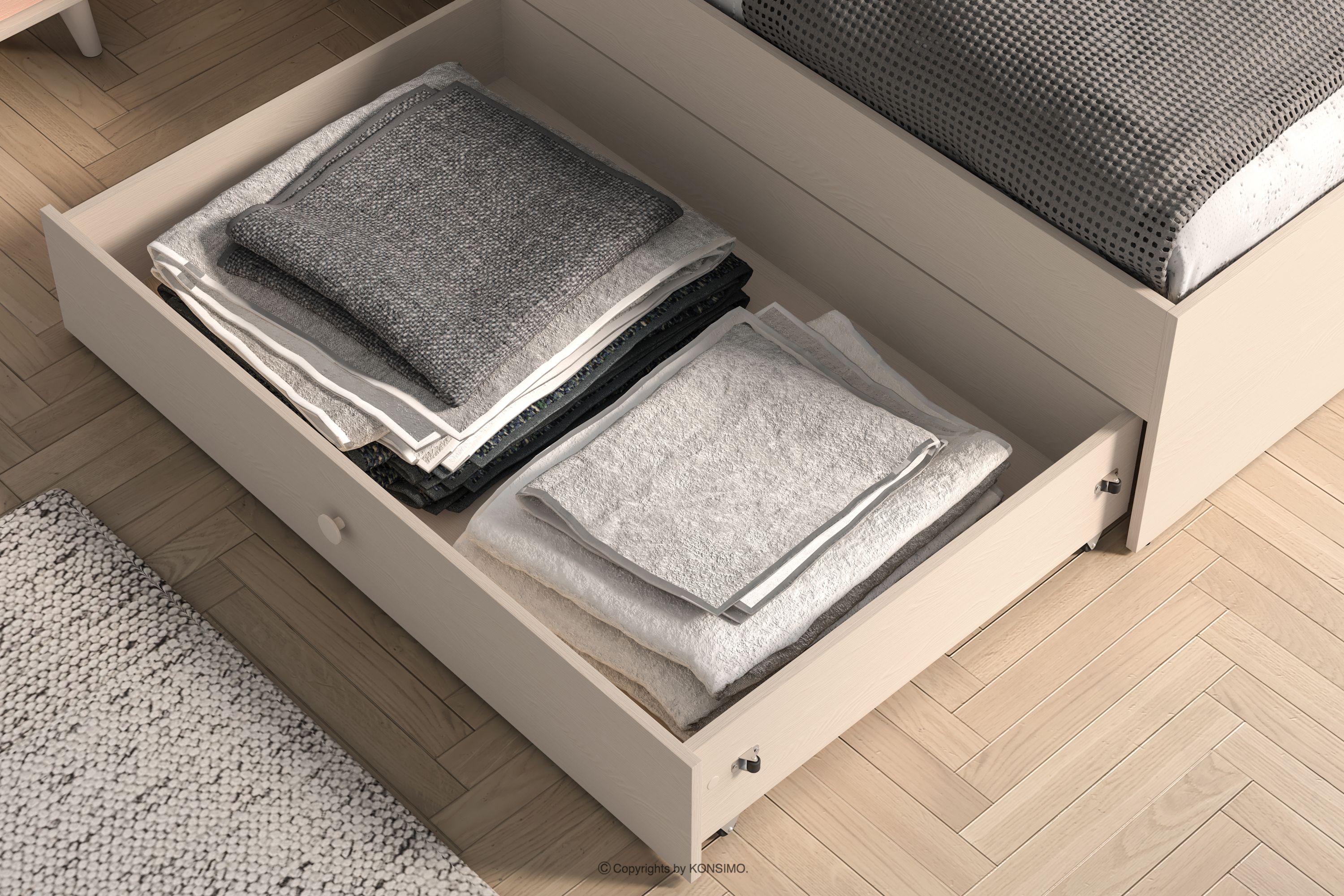 Posteľ s rámom a zásuvkou v béžovej farbe spája moderný dizajn s najvyššou kvalitou spracovania, čo zaručuje pohodlie a bezpečnosť pri používaní. Vďaka pevným materiálom a prepracovaným detailom je nábytok odolný, funkčný a dokonale prispôsobený potrebám najmenších používateľov. Jemné pastelové farby dodávajú interiéru priateľský, harmonický charakter, vhodný na hranie aj odpočinok.
