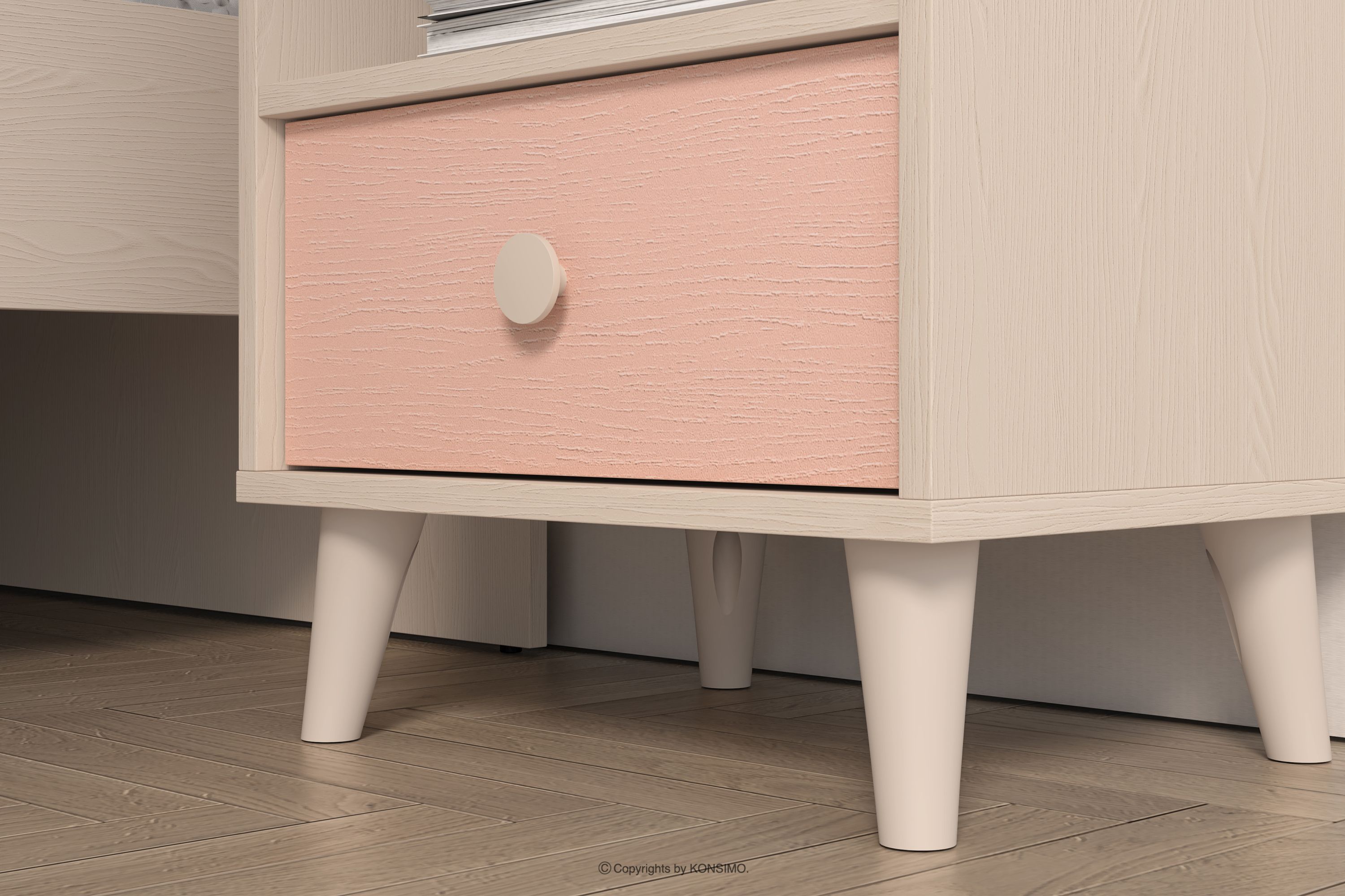 Nočný stolík so zásuvkou do detskej izby ružovej/béžovej farby spája moderný dizajn s najvyššou kvalitou spracovania, čo zaručuje pohodlie a bezpečnosť pri používaní. Vďaka pevným materiálom a prepracovaným detailom je nábytok odolný, funkčný a dokonale prispôsobený potrebám najmenších používateľov. Jemné, pastelové farby dodávajú interiéru priateľský, harmonický charakter, vhodný na hru aj odpočinok.