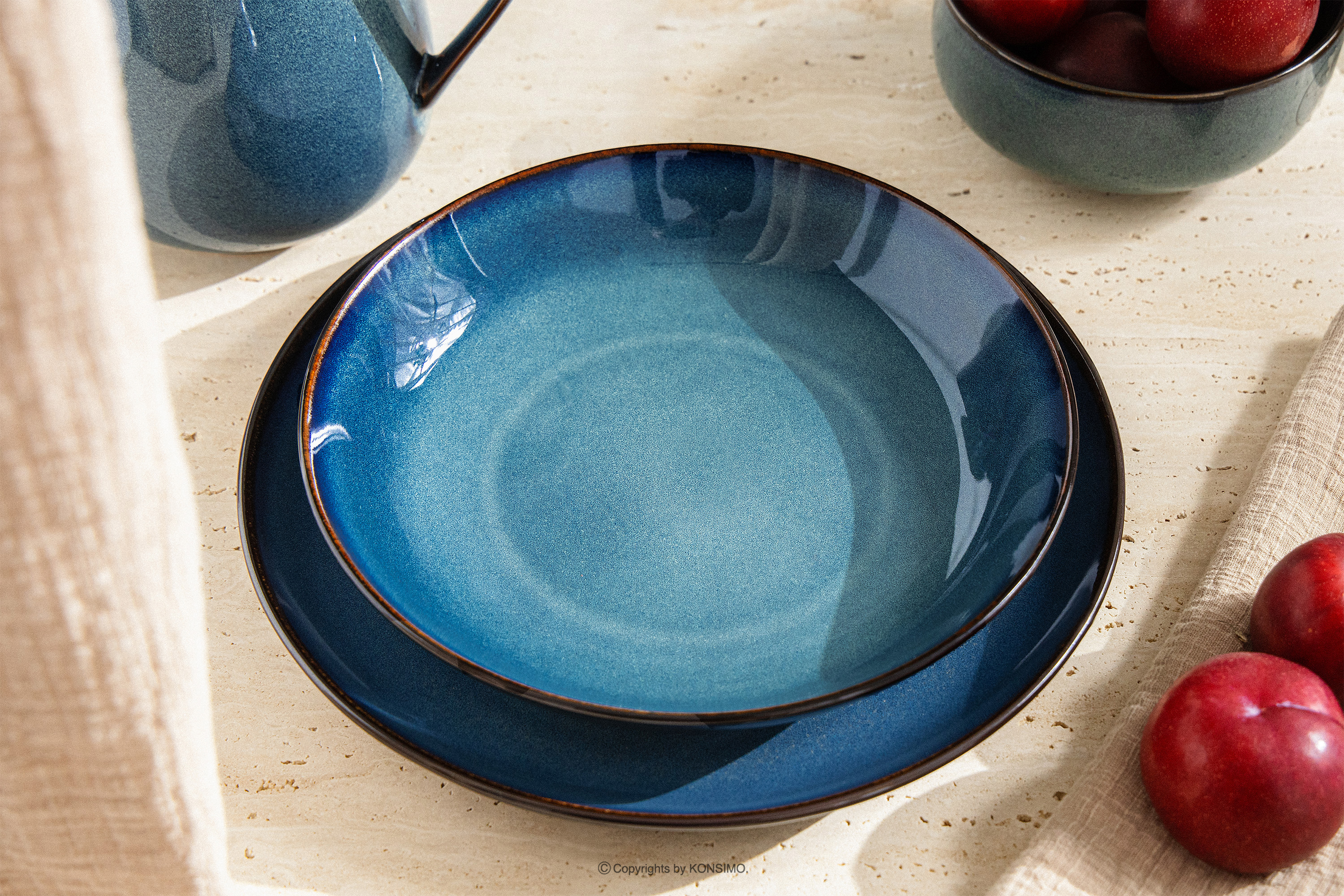 Jedálenská súprava 6 osob (25 ks.) reaktívny smalt modrá/čierna matná sú ideálne na každodenné nosenie, ako aj na slávnostné večere a rodinné stretnutia. Charakteristické farebné prechody, jemné svetelné odlesky a hĺbka odtieňov im dodávajú jedinečný charakter. Reaktívne sklo je materiál, ktorý pri vystavení vysokým teplotám vytvára jedinečné farebné efekty, každý kus má jedinečný vzhľad - žiadny riad nie je identický.