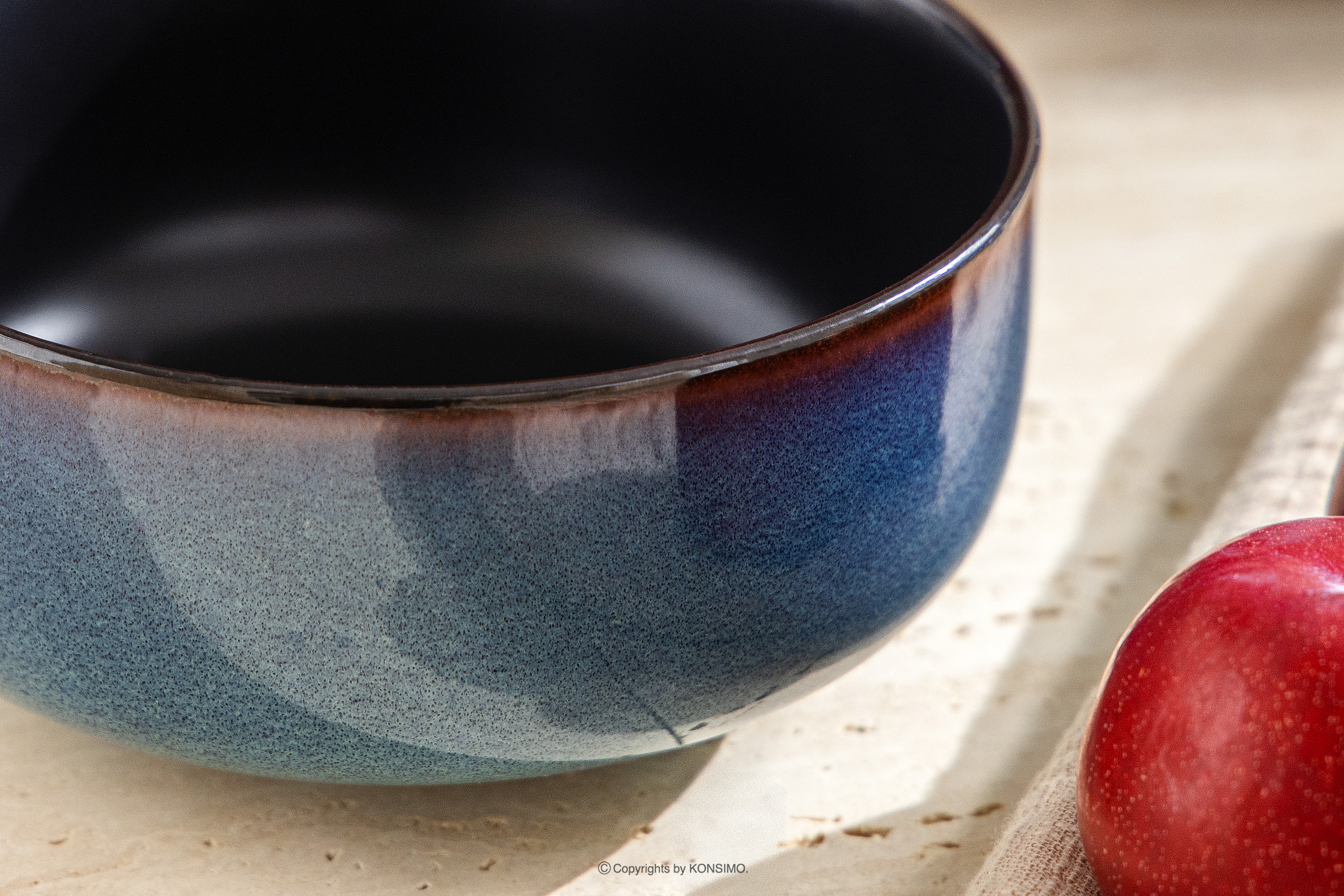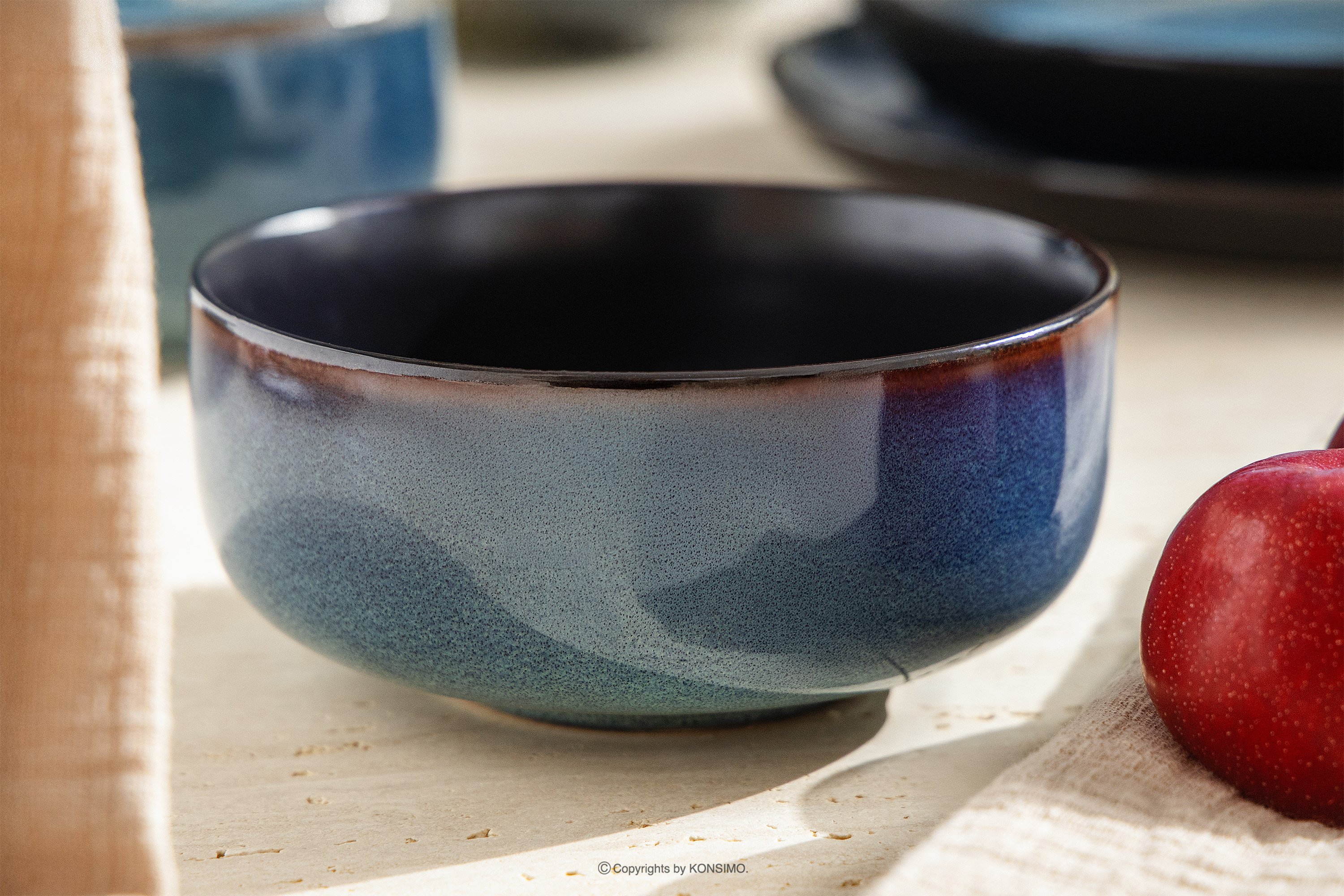 Súprava na raňajky 6 osob (18 ks.) reaktívny smalt modrá/čierna matná sú ideálne na každodenné nosenie, ako aj na slávnostné večere a rodinné stretnutia. Charakteristické farebné prechody, jemné svetelné odlesky a hĺbka odtieňov im dodávajú jedinečný charakter. Reaktívne sklo je materiál, ktorý pri vystavení vysokým teplotám vytvára jedinečné farebné efekty, každý kus má jedinečný vzhľad - žiadny riad nie je identický.