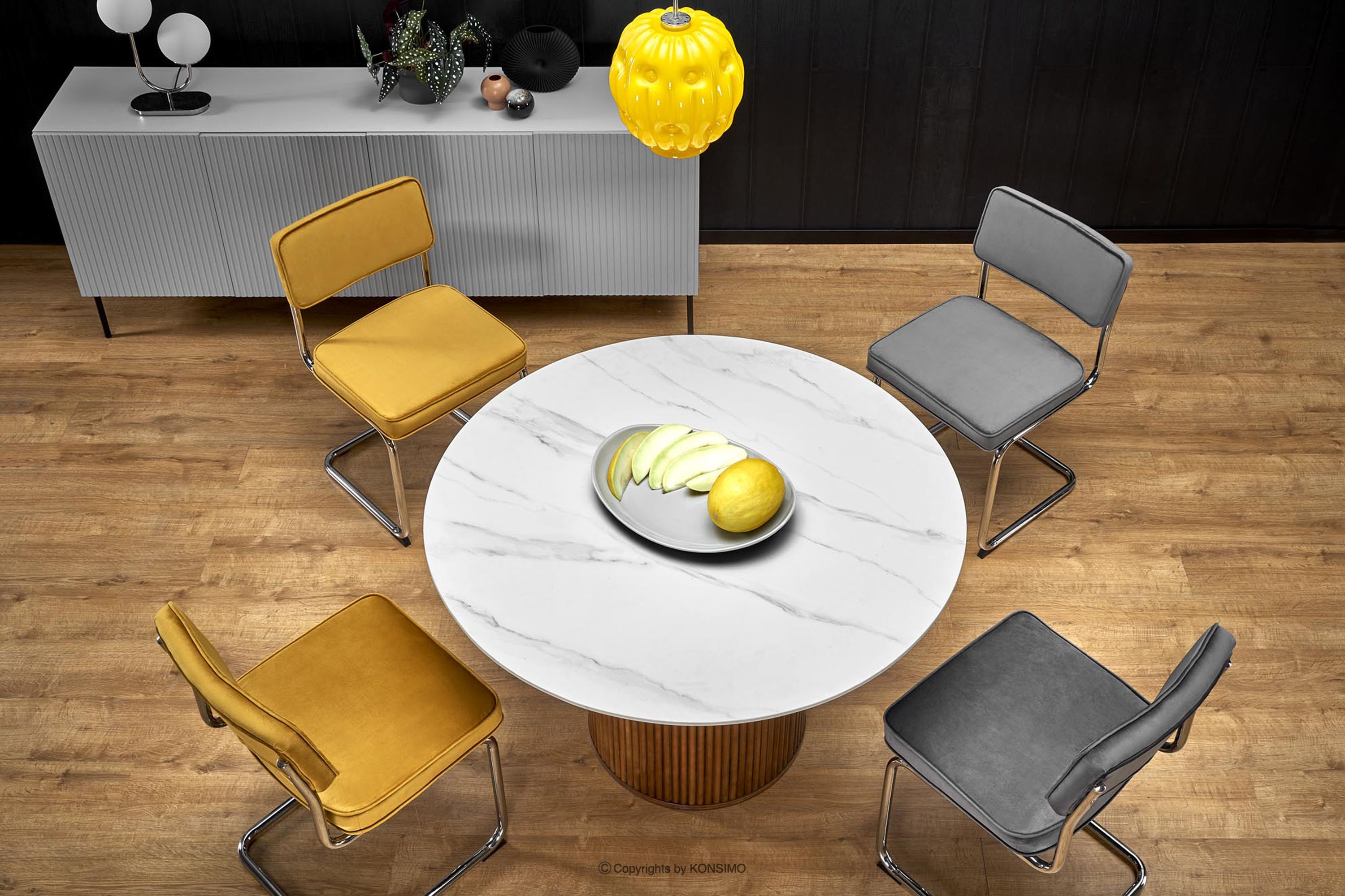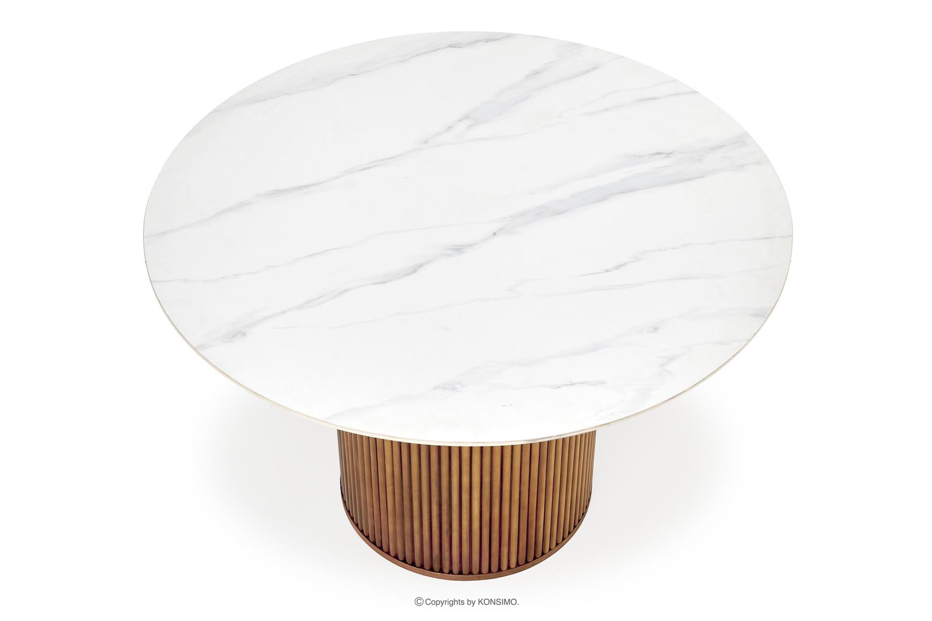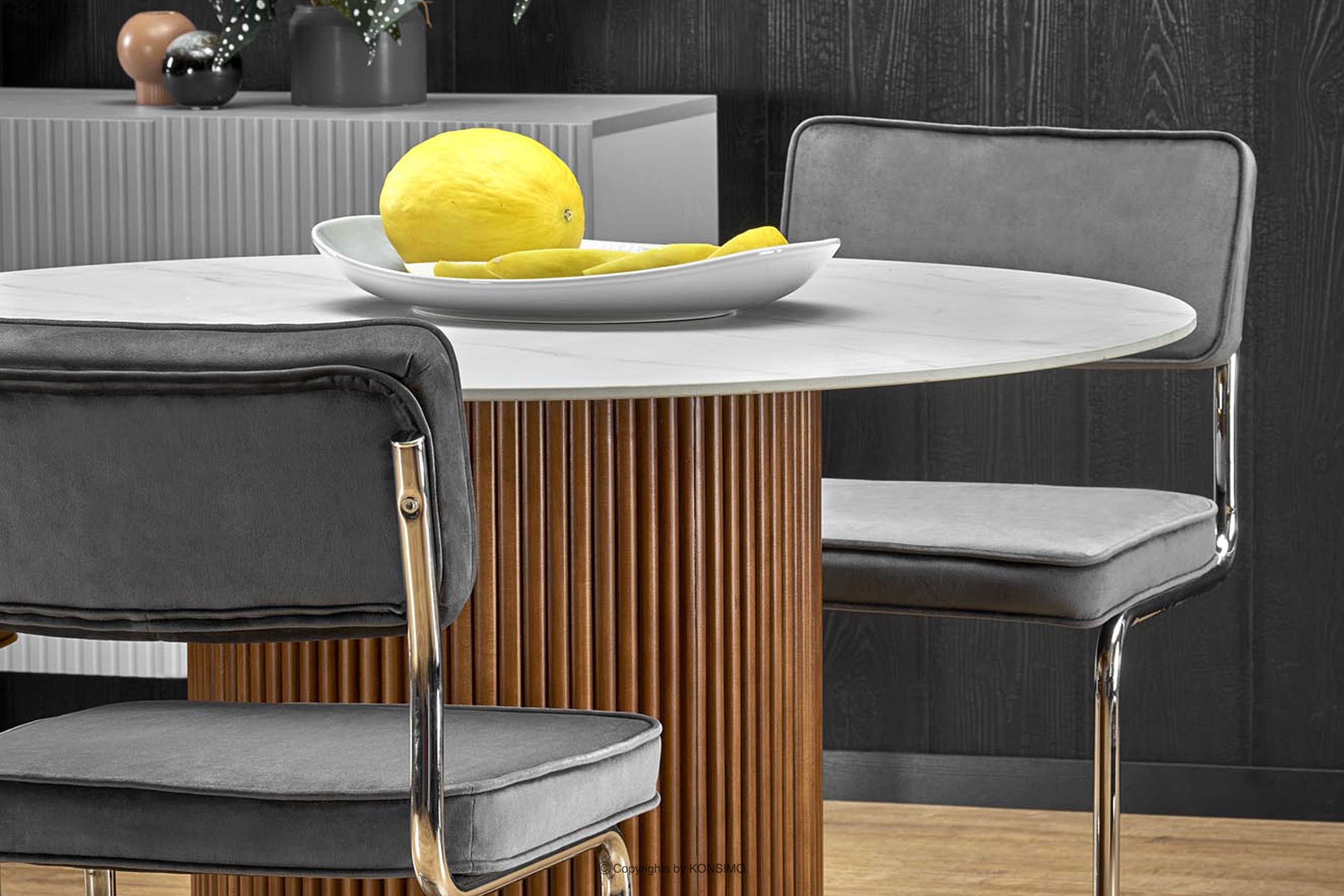 Exkluzívny okrúhly stôl spájajúci prírodnú eleganciu s moderným dizajnom. Centrálne umiestnená noha z masívneho dreva poskytuje stabilnú základňu a dodáva nábytku teplo a prírodný charakter. Luxusná keramická doska v jedinečnom dekore matného mramoru poteší svojím jemným vzorom a eleganciou. Okrúhly tvar podporuje voľnú konverzáciu a rovnaký prístup k stolu pre všetkých hostí.
