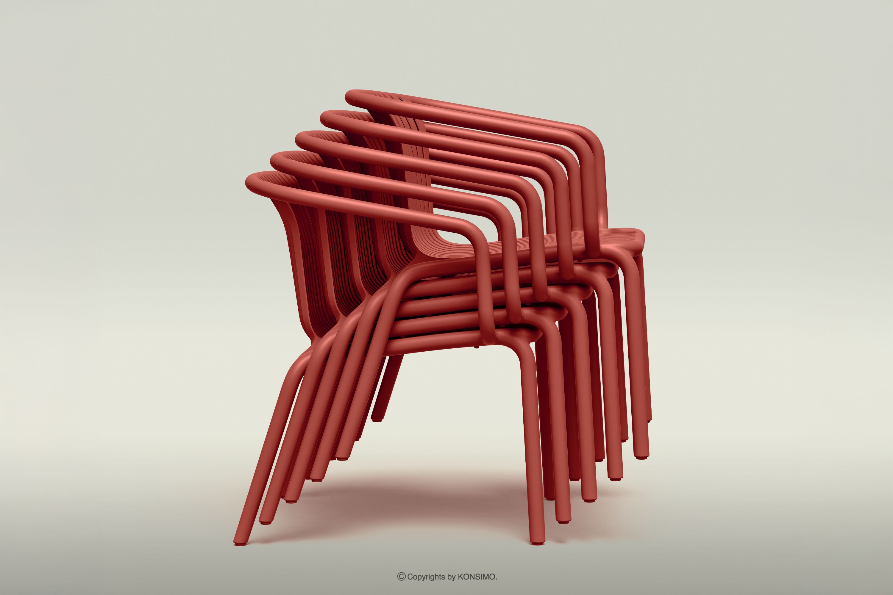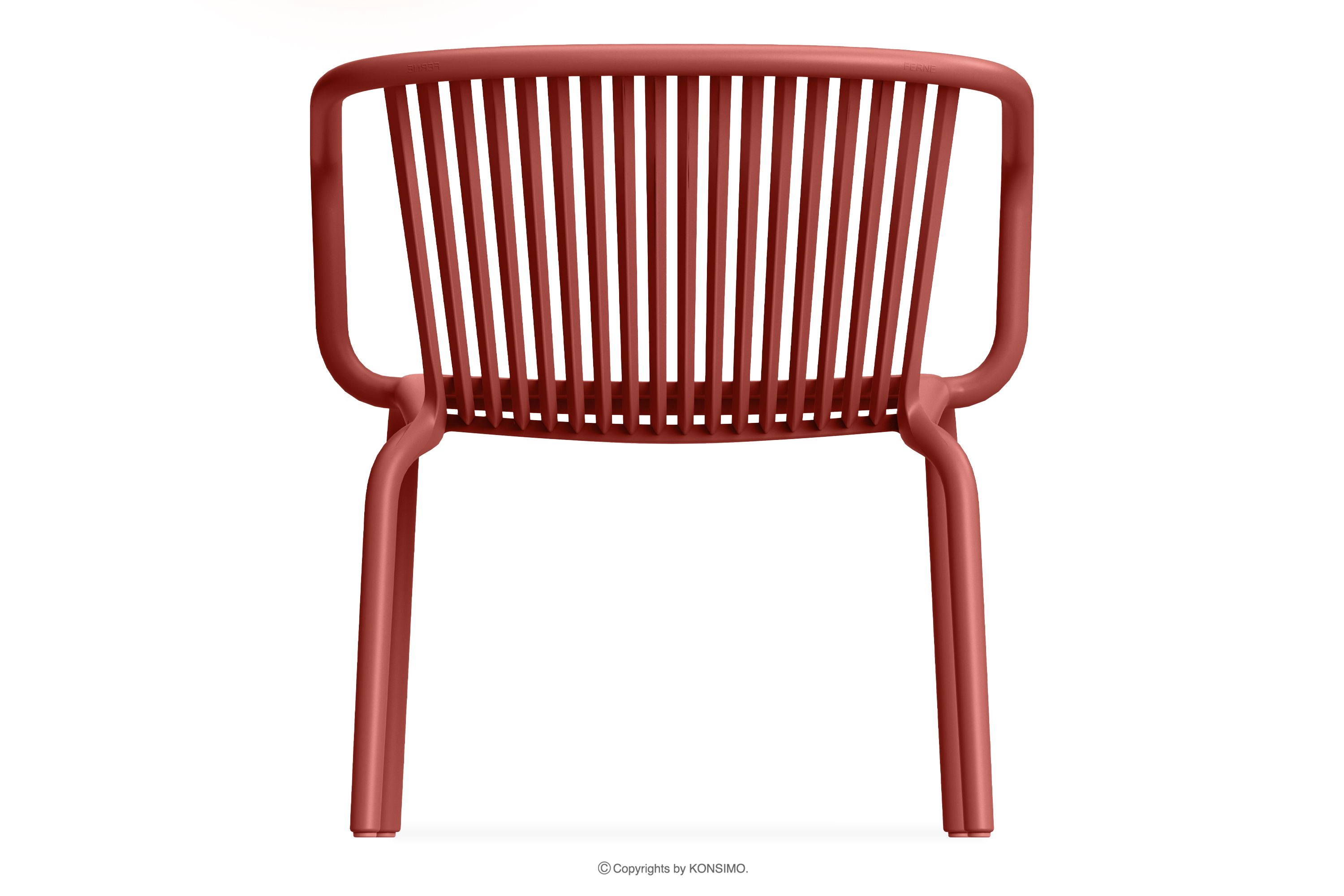 Sada záhradného nábytku kreslá a konferenčný stolík červená 2 osoby. ideálne spája minimalistickú estetiku s výnimočnou funkčnosťou. Vyrobený z vysoko kvalitného plastu – špeciálnej zmesi polypropylénu obohateného sklenenými vláknami – zaručuje bezkonkurenčnú odolnosť a odolnosť voči meniacim sa poveternostným podmienkam. Inovatívna konštrukcia každého prvku zabraňuje hromadeniu dažďovej vody, vďaka čomu nábytok rýchlo schne aj po intenzívnych zrážkach.