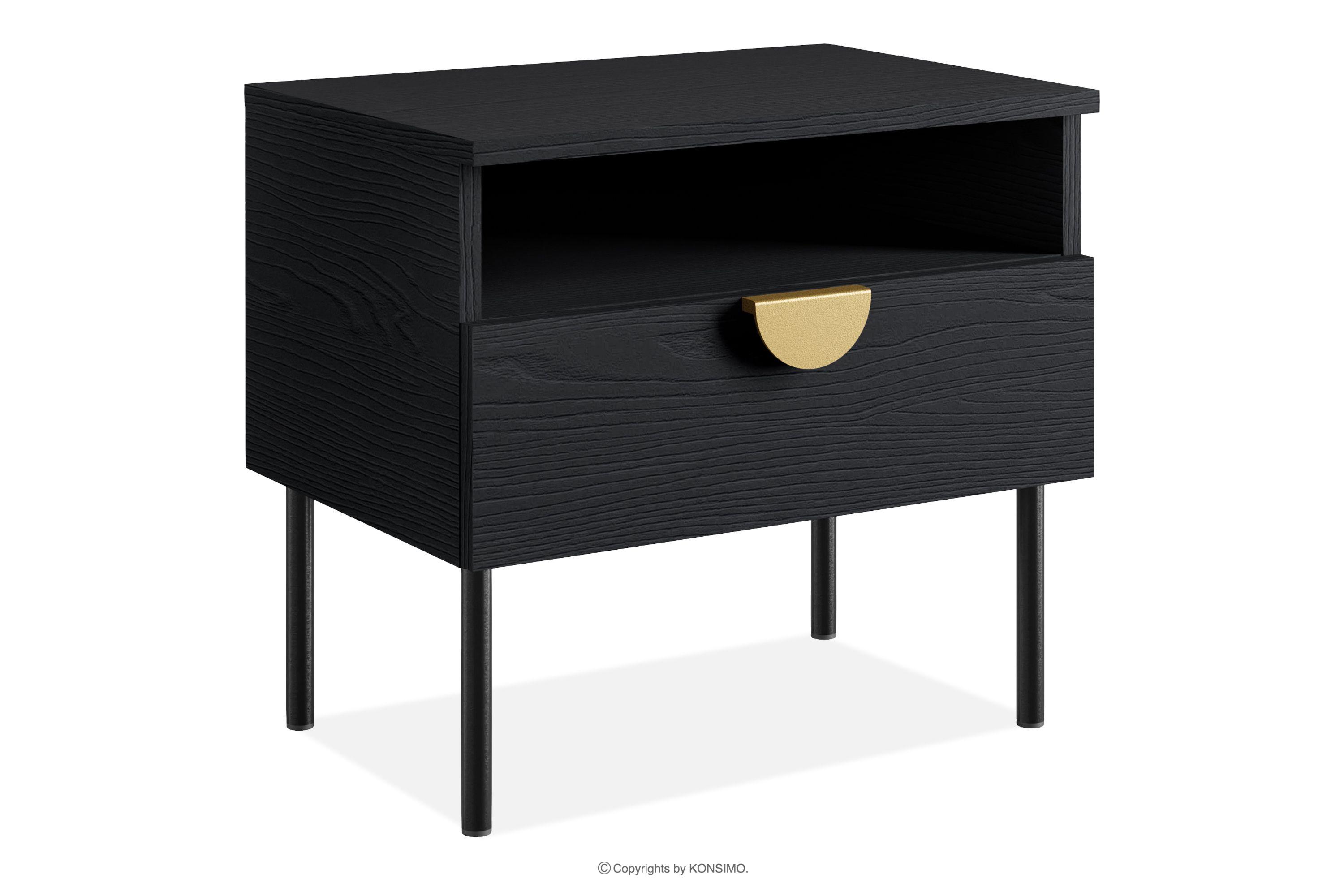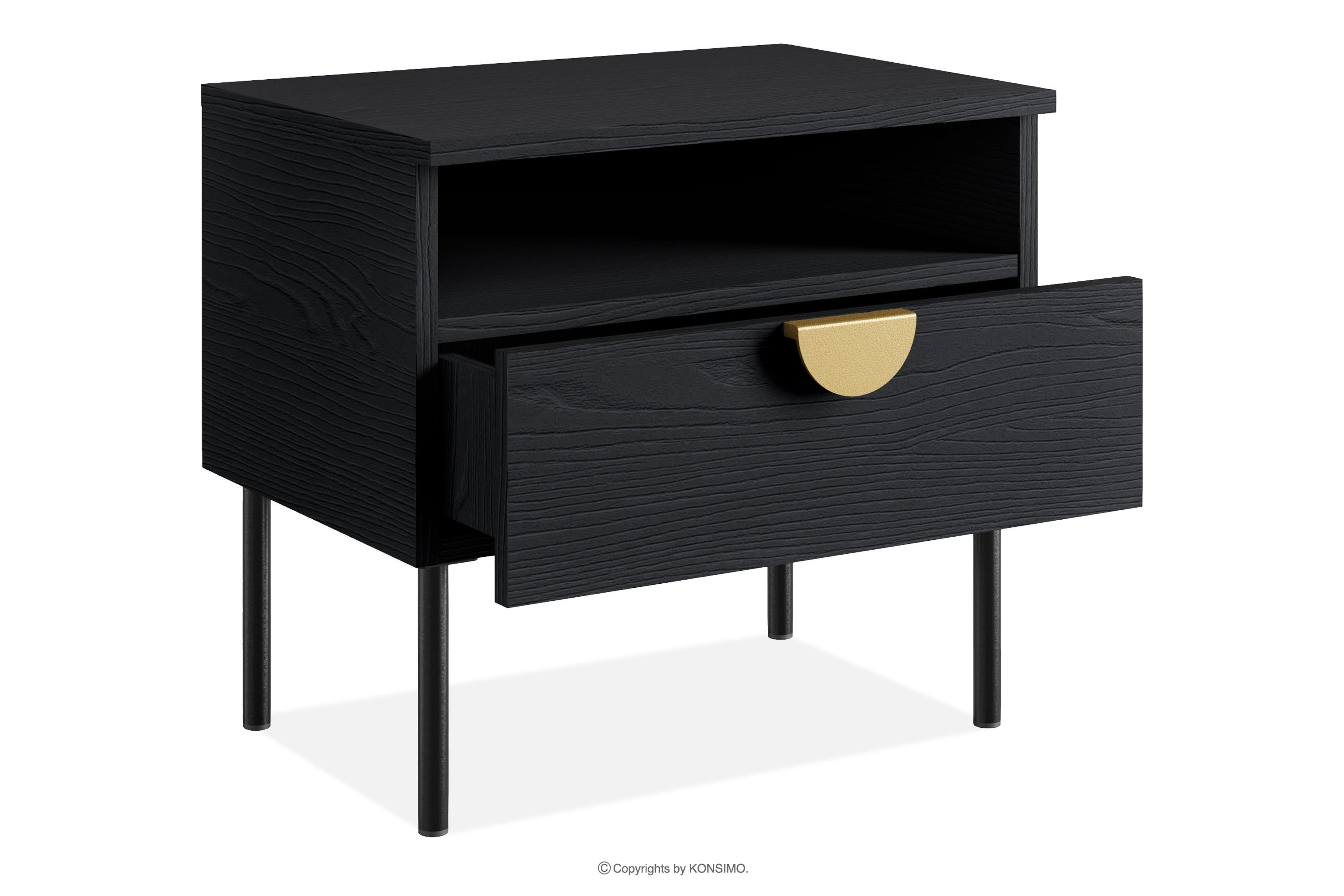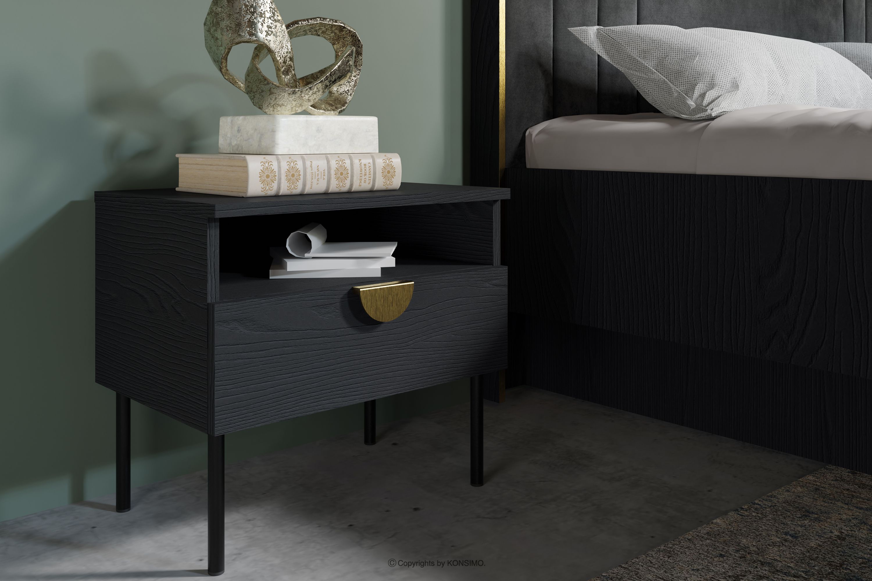 Moderný nočný stolík čierna spája minimalistickú formu s funkčnosťou. Sú vyrobené zo 16 mm hrubej laminovanej dosky a vďaka štíhlym čiernym kovovým nohám pôsobia ľahko. Nočné stolíky sú nielen pútavé, ale ponúkajú aj praktické úložné riešenia, ktoré dokonale zodpovedajú potrebám súčasných interiérov. Výrazné zlaté kovové úchyty vytvárajú výrazný kontrast s čiernym korpusom a zdôrazňujú geometrickú čistotu masívu.