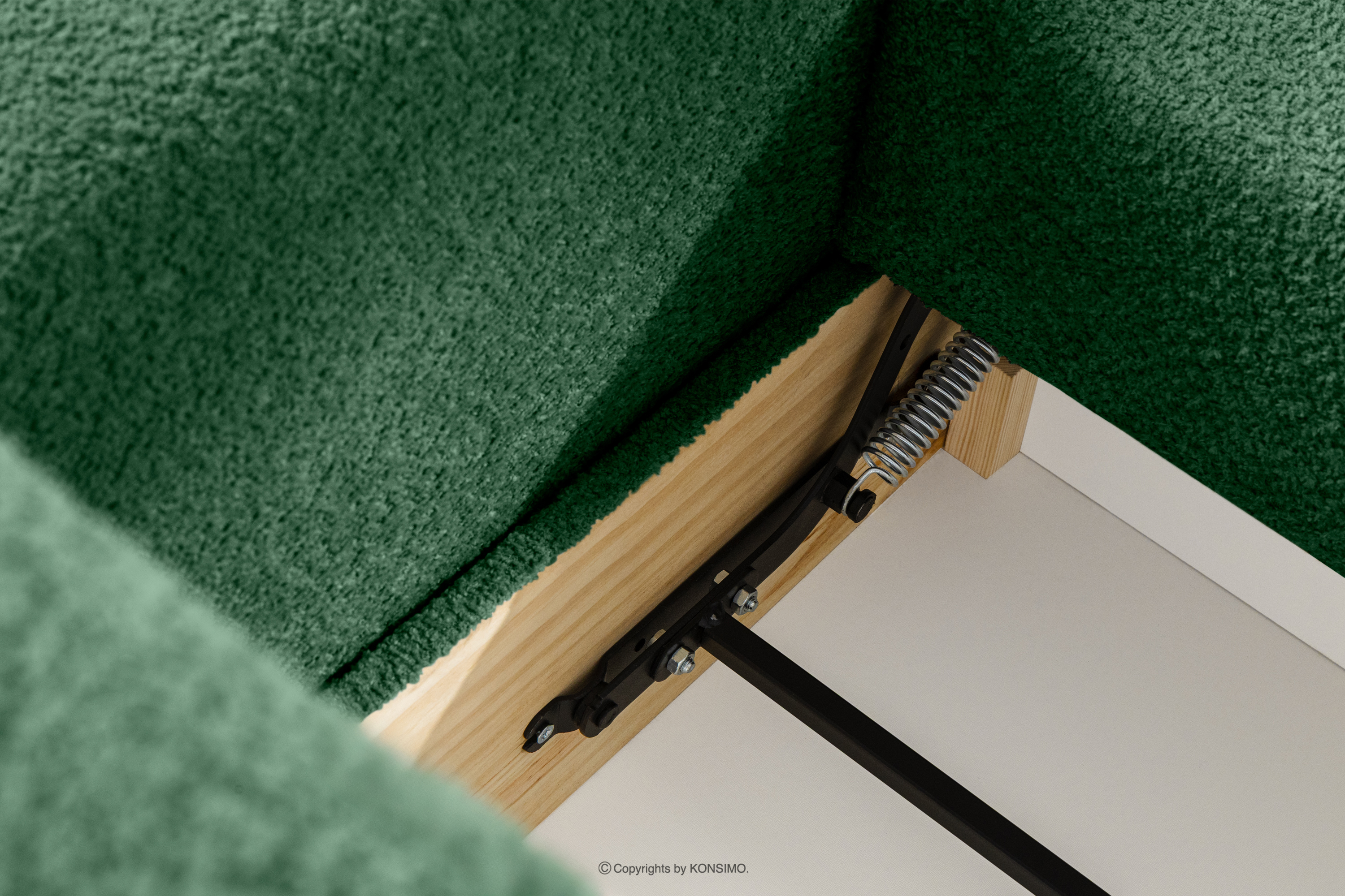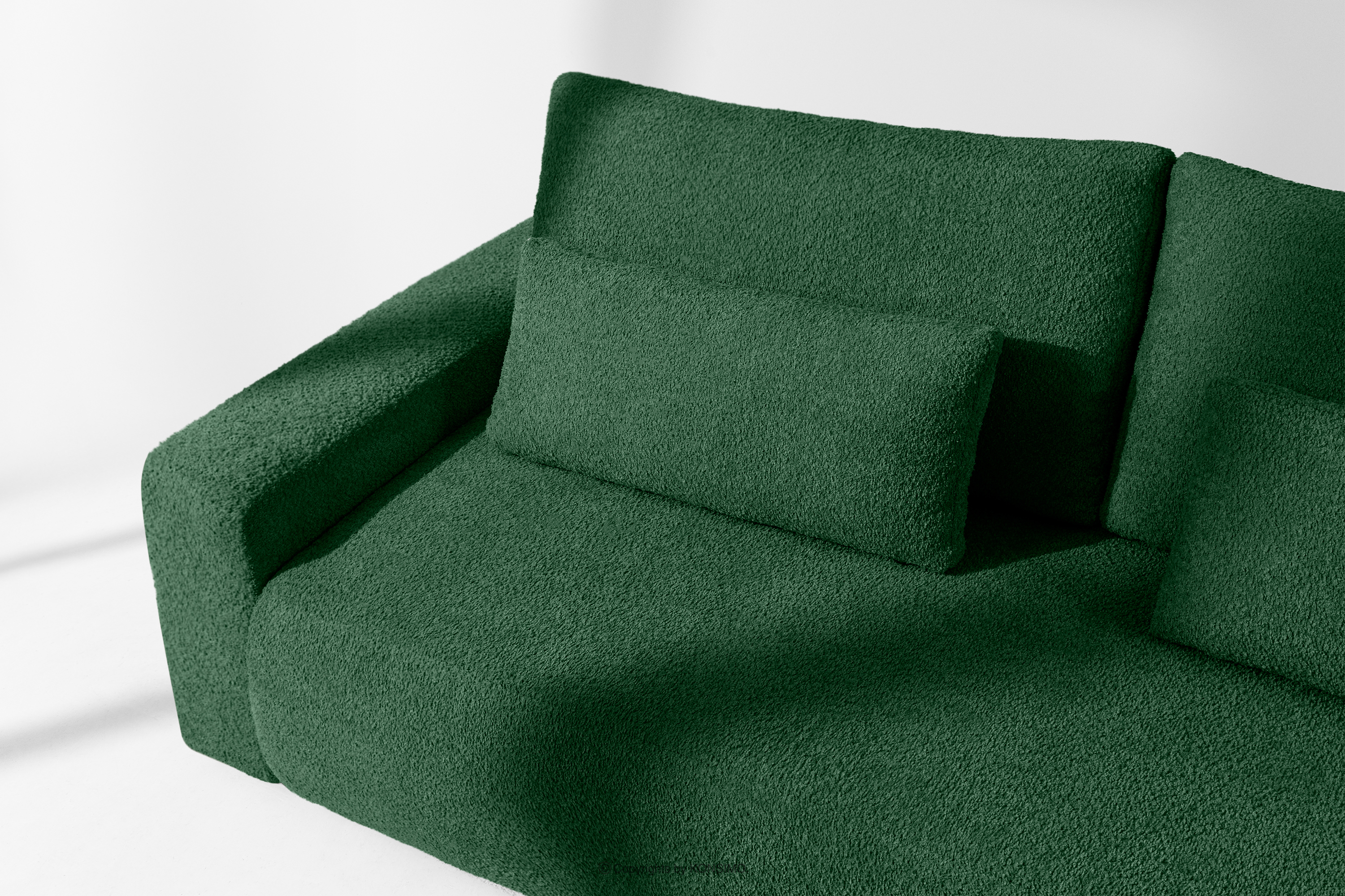 Trojmiestna pohovka s vankúšmi rozkladacia látka boucle tmavozelená je stelesnením moderného komfortu a funkčnosti, navrhnutý s ohľadom na moderné interiéry a požiadavky každodenného používania. Elegantné, minimalistické línie pôsobia v harmónii s premysleným dizajnom, ktorý spája estetiku a praktickosť. Je vybavená rozkladacím systémom typu DL a kontajnerom na lôžkoviny, vďaka čomu je ideálnym riešením do malých bytov alebo hosťovských izieb.