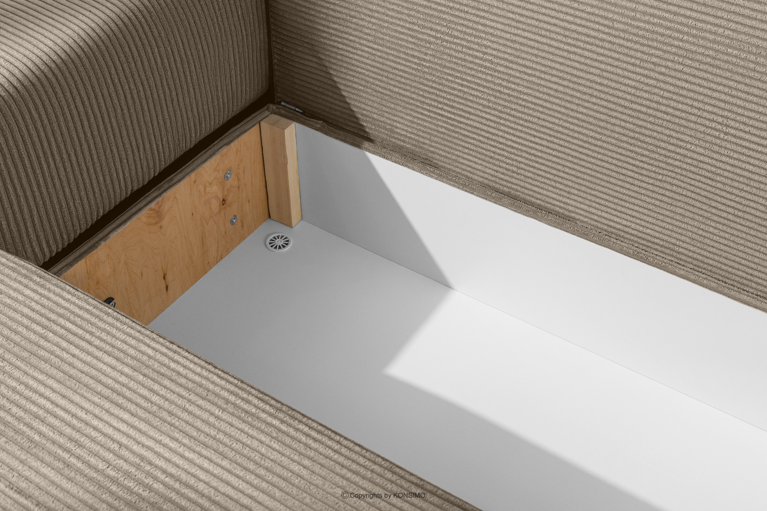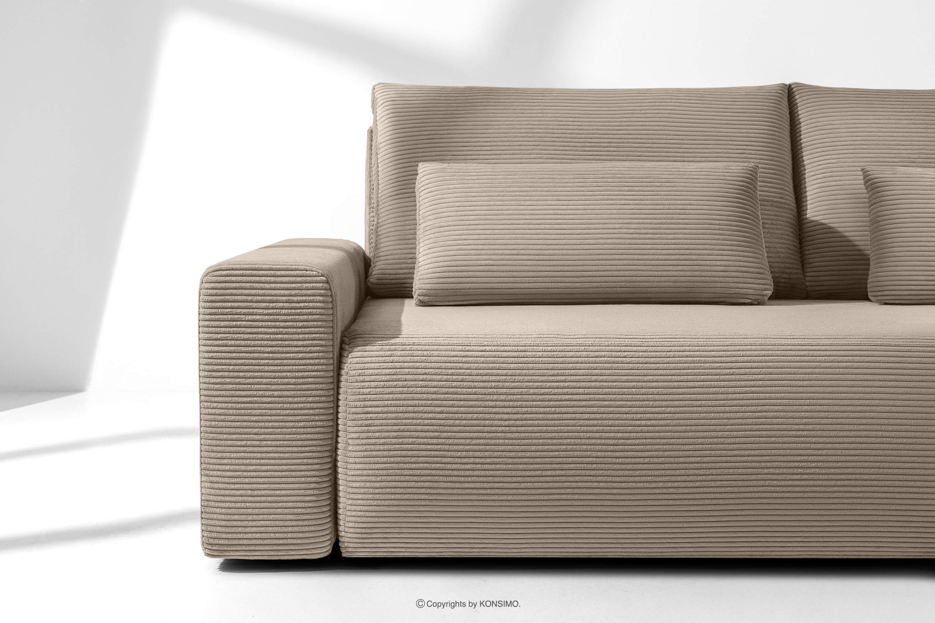 Rozkladacia pohovka s vankúšmi manšestrová látka béžová je stelesnením moderného komfortu a funkčnosti, navrhnutý s ohľadom na moderné interiéry a požiadavky každodenného používania. Elegantné, minimalistické línie pôsobia v harmónii s premysleným dizajnom, ktorý spája estetiku a praktickosť. Je vybavená rozkladacím systémom typu DL a kontajnerom na lôžkoviny, vďaka čomu je ideálnym riešením do malých bytov alebo hosťovských izieb.
