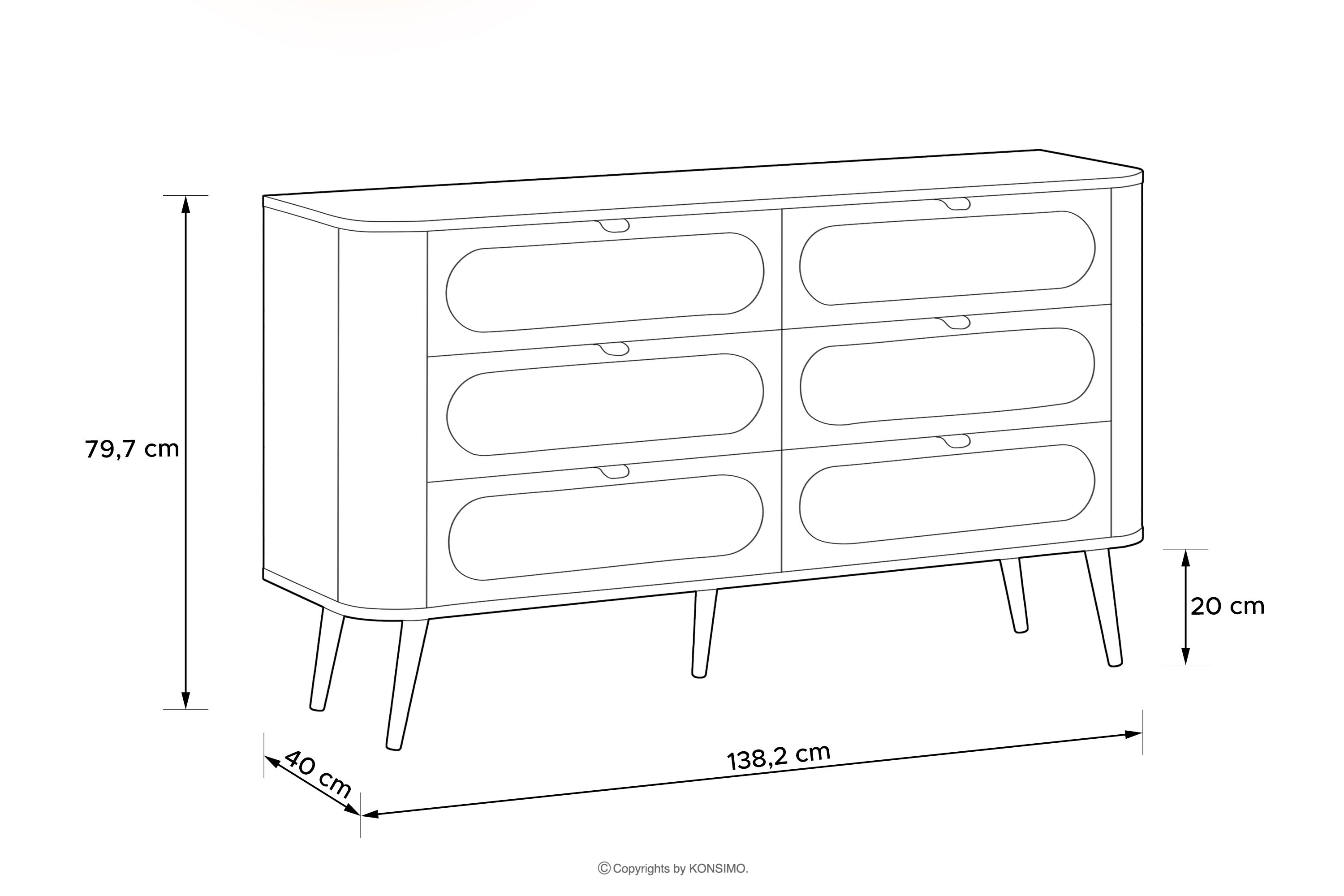 Zaoblená široká komoda čierna poteší moderným dizajnom a precíznym spracovaním. Čierne telo zo 16 mm hrubej laminovanej dosky obohatené o zlaté kovové úchyty vytvára luxusný kontrast, ktorý priťahuje pozornosť. Robustná konštrukcia vystužená rohovými lištami z MDF a povrchová úprava hrán z 0,45 mm ABS pásky zaručujú odolnosť a dokonalý vzhľad na dlhé roky.